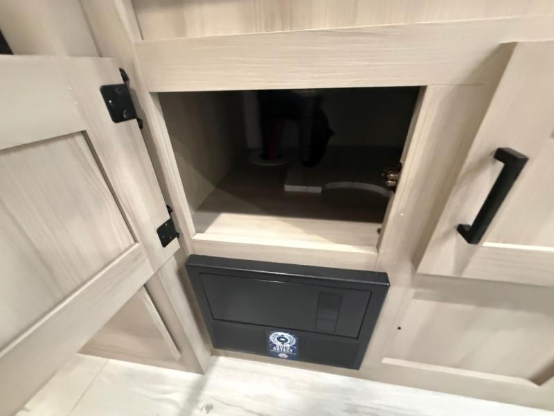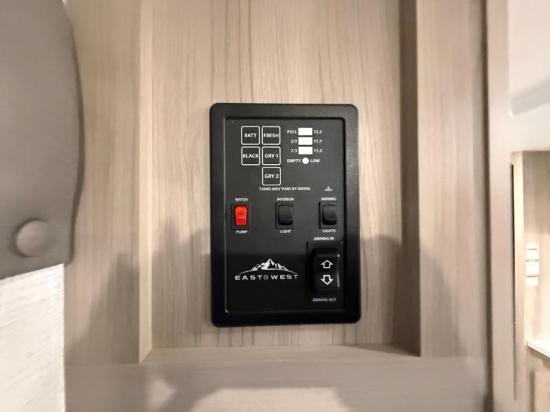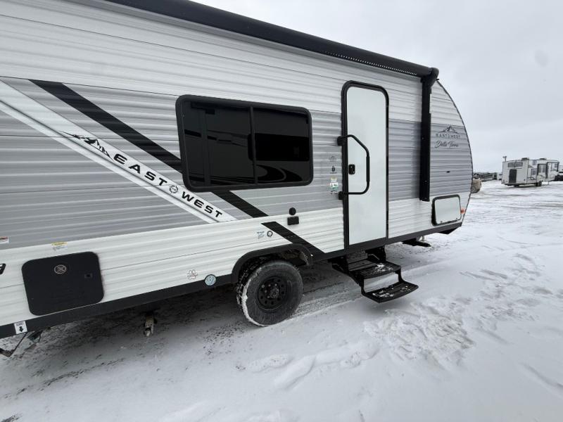 With any Della Terra LE travel trailer by EAST TO WEST, there is USA manufactured furniture, seamless countertops (no T-mold), and a 10.7 cu.ft. frost-free 12 volt refrigerator for your perishables. A Solera power awning with adjustable legs and LED light strip will also provide you with a great outdoor living area protected from both the sun and rain, and the outside hot/cold shower will let you easily wash off hiking gear or fill the dogs water bowl. These trailers also include Furrion back up camera prep, On The Go ladder prep, and slide out awning prep that will allow you to add these features to make your camping experience easier than ever. An optional power tongue jack can also be chosen for easy towing, as well as the optional Solar Package to enjoy some off-grid capabilities!
