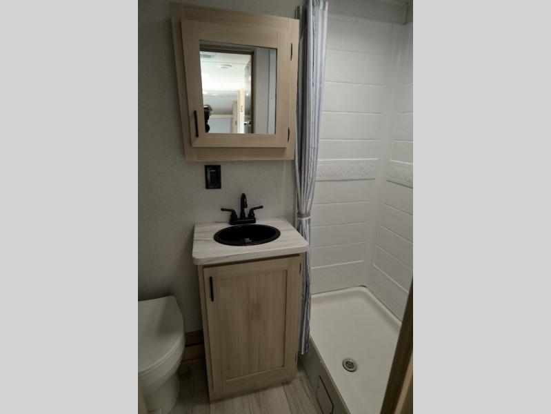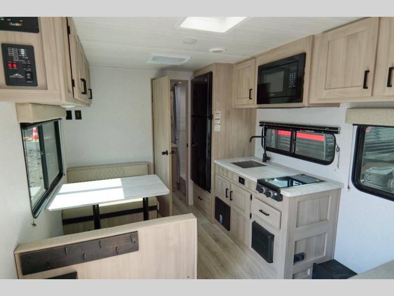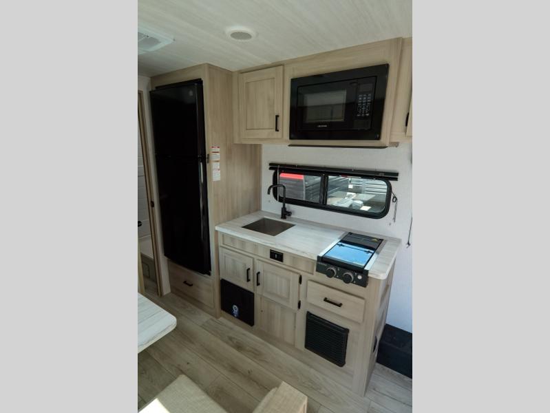 Head to your favorite camping spot in this travel trailer for four to five campers! You will love waking up each morning on the 72" x 80" king bed that includes storage underneath plus dual wardrobes to keep your clothes wrinkle-free. The full rear bath with a 24" x 40" walk-in shower will let you freshen up, and the linen closet here is convenient for towels and toiletries. Head to the kitchen where you can make breakfast on the two burner cooktop or make instant oatmeal in the microwave oven. There is a booth dinette and jack knife sofa for seating space, or you might just want to sit outdoors under the 15' power awning!