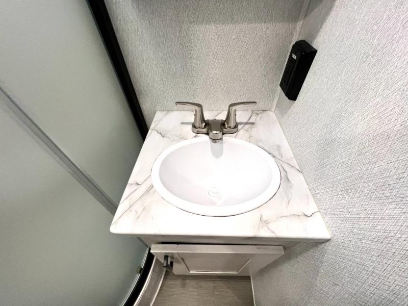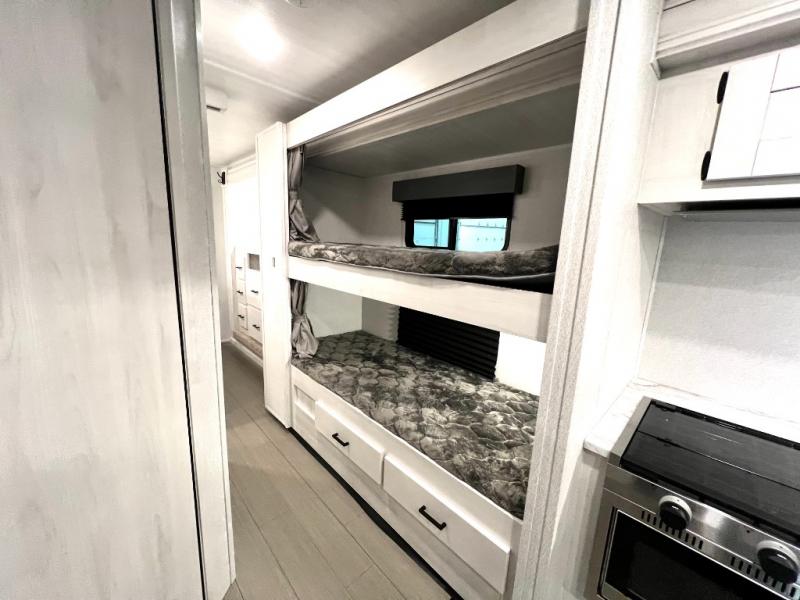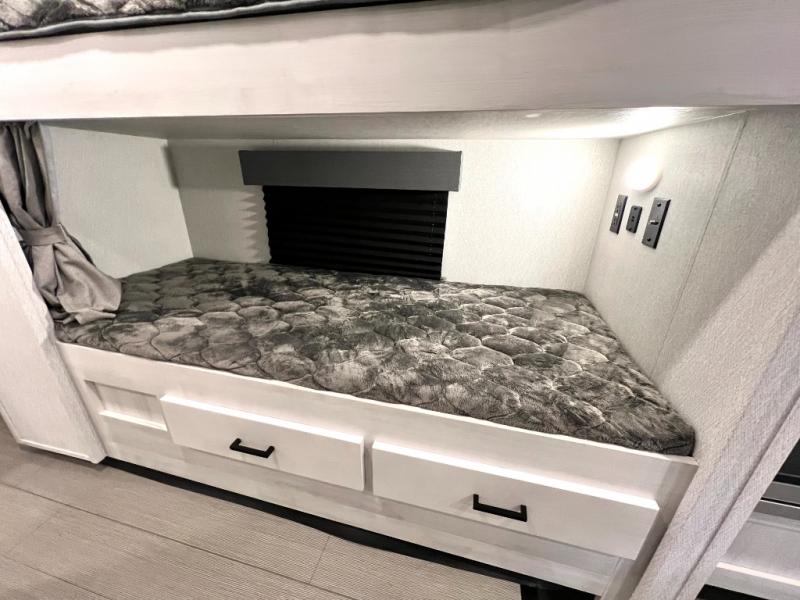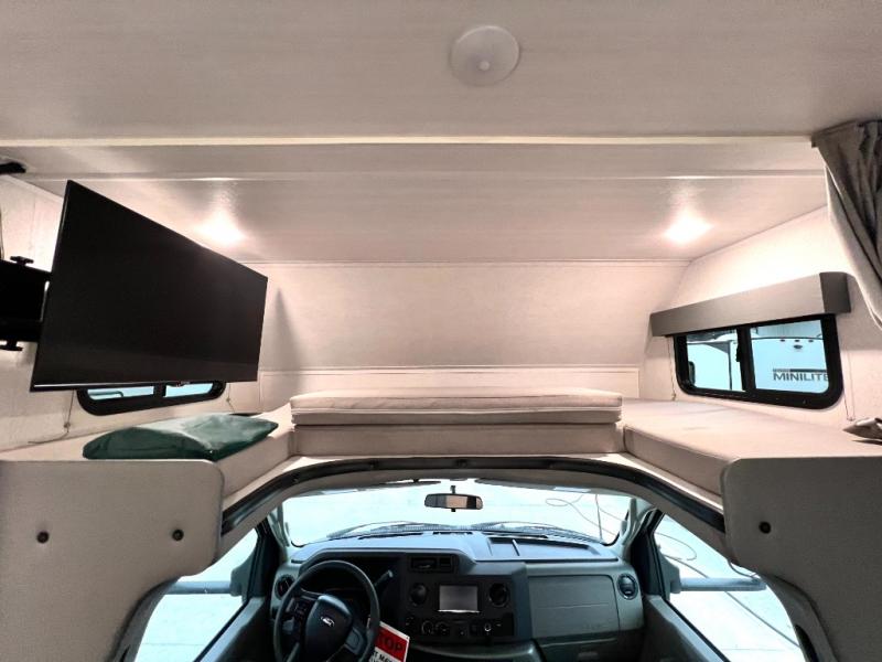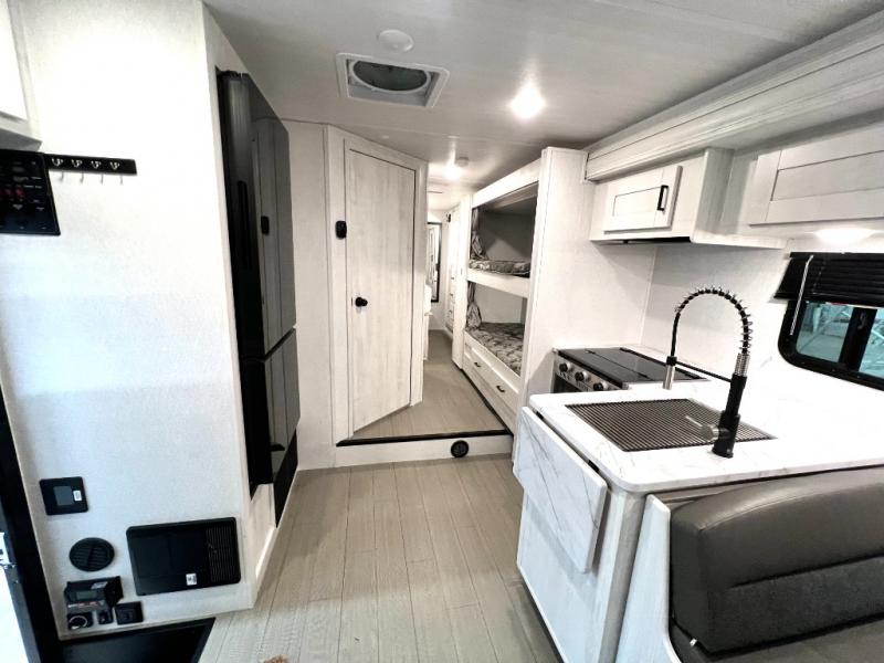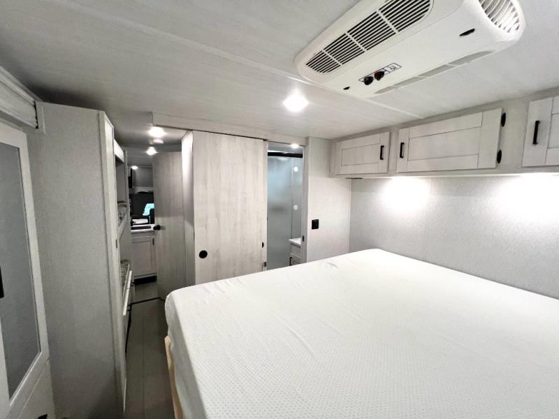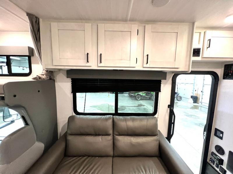 This Entrada Class C gas motorhome has quite a lot of class and comfort! Every inch of this coach has added living space because of the full-wall slide on the driver's side, and this slide adds extra room for additions like the bunk beds. Not only is there a set of bunks on the slide, but there is also a bunk above the cab if someone else wants to spend the night on a bunk bed. You will have a great night's rest on the queen bed in the rear master suite, and since this bedroom gives you a private entrance into the dual-entry bathroom, you won't have to go far in the middle of the night. This coach also has great entertainment with a 40" 12V LED Swing Arm TV over the cab, and there is a space prepped in the bedroom if you decide to add another.