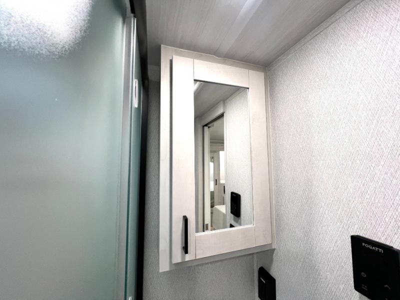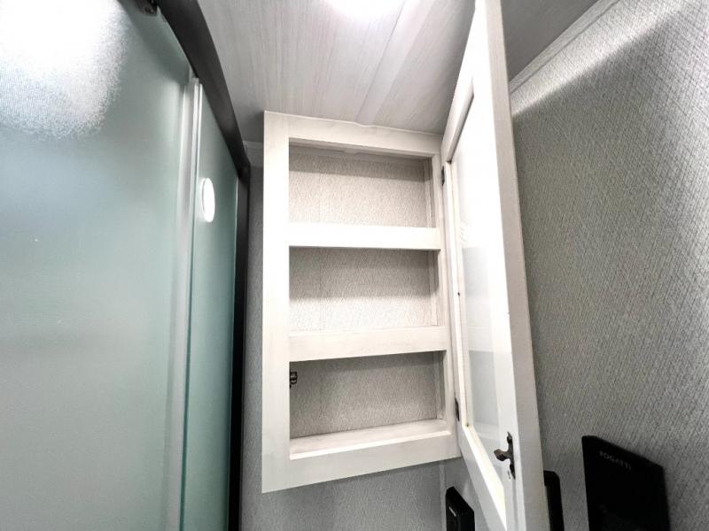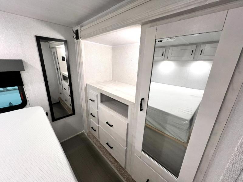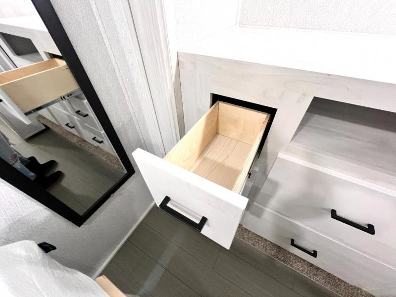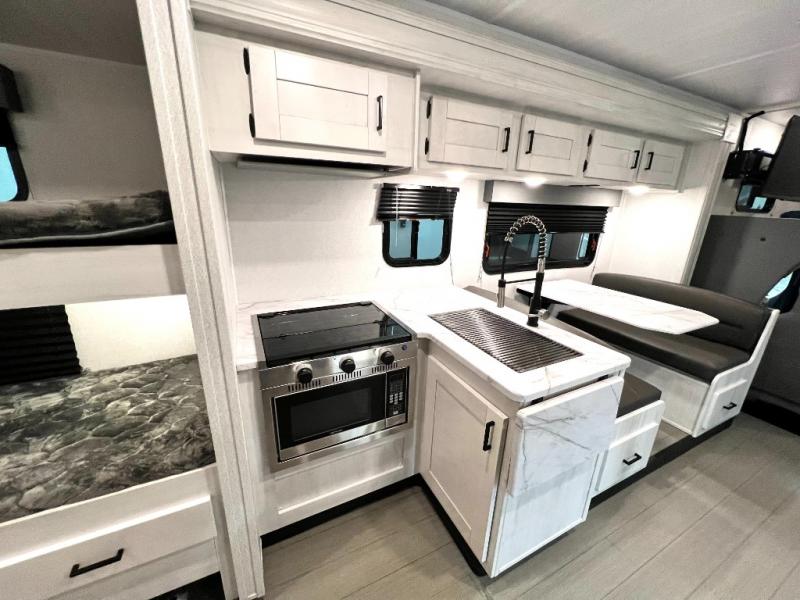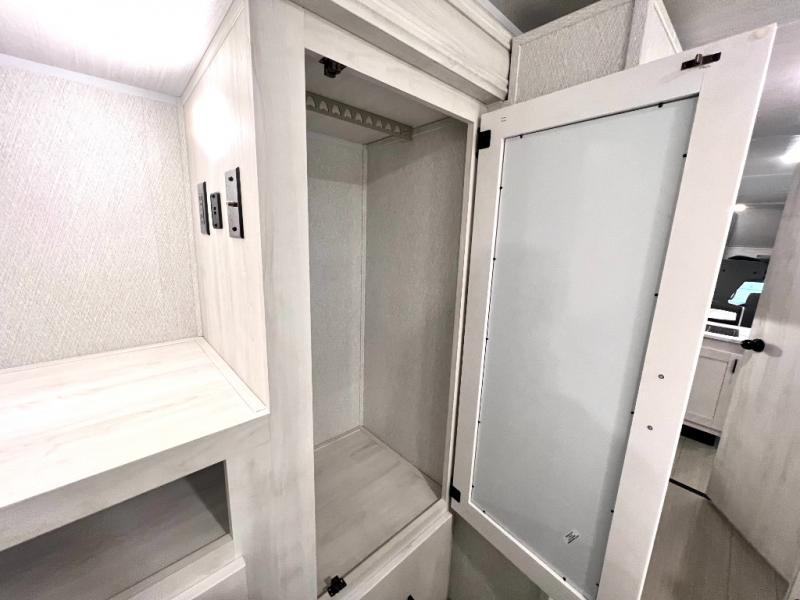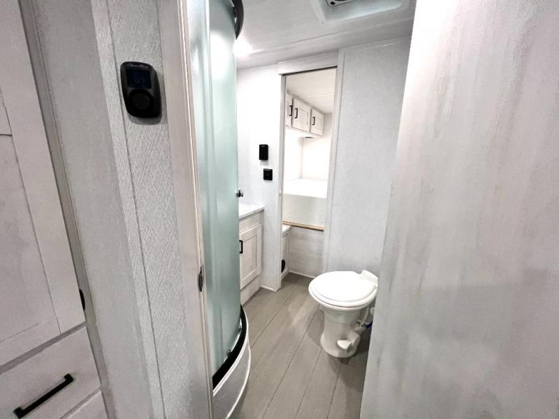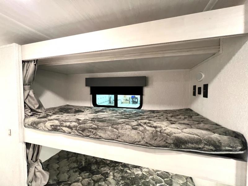 This Entrada Class C gas motorhome has quite a lot of class and comfort! Every inch of this coach has added living space because of the full-wall slide on the driver's side, and this slide adds extra room for additions like the bunk beds. Not only is there a set of bunks on the slide, but there is also a bunk above the cab if someone else wants to spend the night on a bunk bed. You will have a great night's rest on the queen bed in the rear master suite, and since this bedroom gives you a private entrance into the dual-entry bathroom, you won't have to go far in the middle of the night. This coach also has great entertainment with a 40" 12V LED Swing Arm TV over the cab, and there is a space prepped in the bedroom if you decide to add another.
