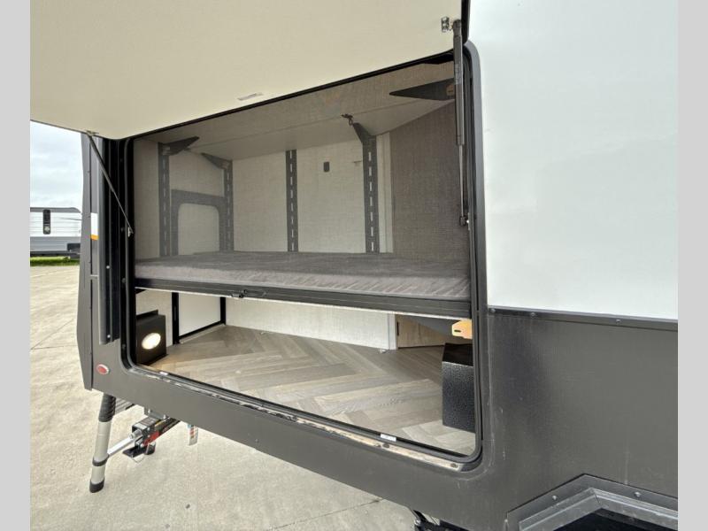 This unique travel trailer offers versatile living! Starting with the front Murphy bed that has a 60" x 80" queen bed to lay your head on at night and can convert into a sofa for seating during the day with a nightstand and a 12V HDTV/AV system to watch your favorite movies in bed. Create your best home cooked meals with the two burner cooktop and 12V refrigerator then enjoy them at the jackknife sofa slide with a removable table. Behind the sofa are dual storage cubbies and it can also convert into an extra sleeping space. The repositionable Embertack E-track bunk/storage system has a 74" x 46" cargo space for your items and a storage locker door to access them from the exterior. You can enjoy twin bunks or convert them to double-size bunks to sleep two to four. The exterior also has a kayak/bike storage door, front pass-through storage area, and a 2" accessory receiver!