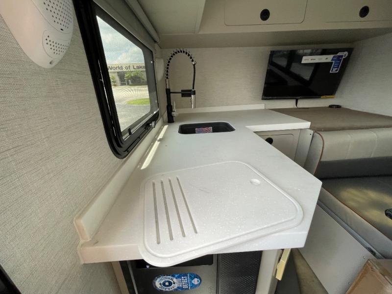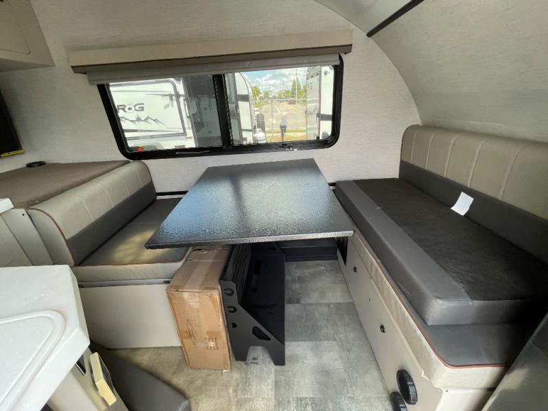 You and your spouse will enjoy the woods in this teardrop trailer! The convertible dinette transforms into an 80" x 48" bed so you can get a good night's rest after an adventurous day. The 12V power roof vent helps to circulate the air flow and the 21 gallon on-demand water system provides hot water quick. There are plenty of overhead aluminum cabinets throughout to keep your items out of the way. The entry door comes with a window and shade for added privacy or sunlight. Crank up the tunes with the Bluetooth stereo and stay connected with the TV/satellite/cable/HDMI prep. With 12V LED lighting, you will be able to see clearly day or night! Add the optional off-road package if you enjoy a little boondocking off the beaten path!