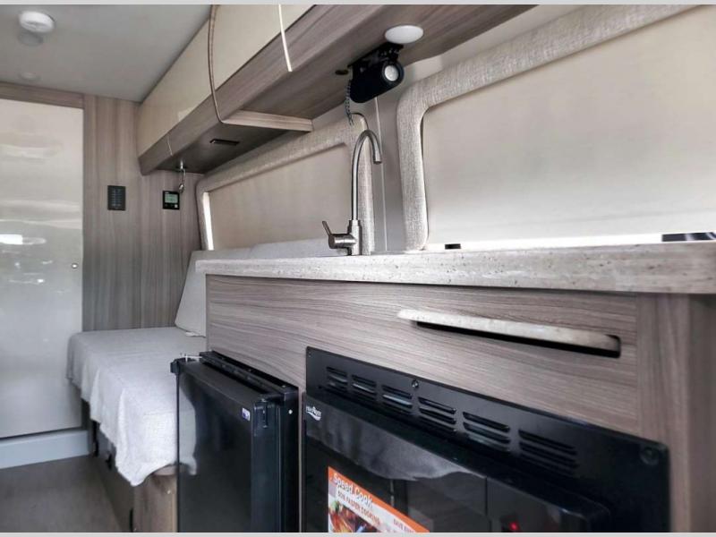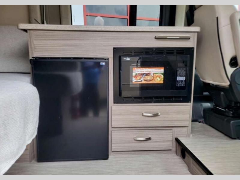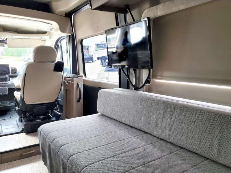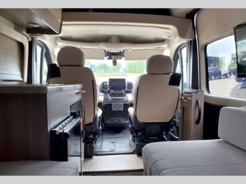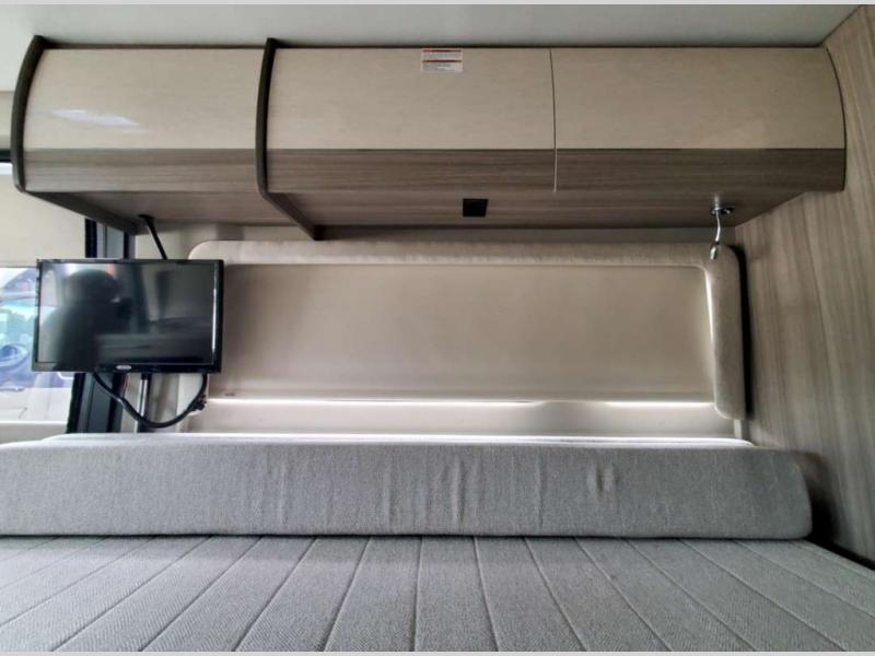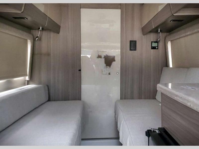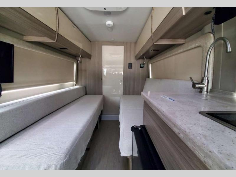 Your trek across country is made comfortable in this coach for two. You can swivel the captains seats around when you get to your destination, or head outdoors to sit under the 13' Thule armless awning with LED lights. The pull-out table indoors will provide a space for your coffee in the morning, while breakfast is being cooked in the convection microwave or on the two burner cooktop. A rear wet bath will allow you to stay clean throughout your trip, and you'll find plenty of storage space for your belongings. You'll love the versatile sleeping arrangements in this model that includes twin-size beds with a filler cushion that converts to a king-size bed, plus there is under-bed storage for your luggage. The optional Li Package can also be added which includes a 48V-210 amp hour smart lithium battery, providing 10KW hours of power, and more- see dealer for more details!