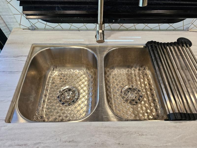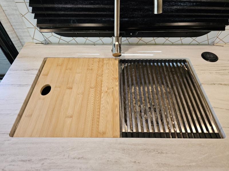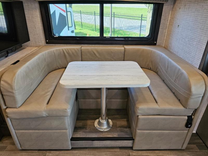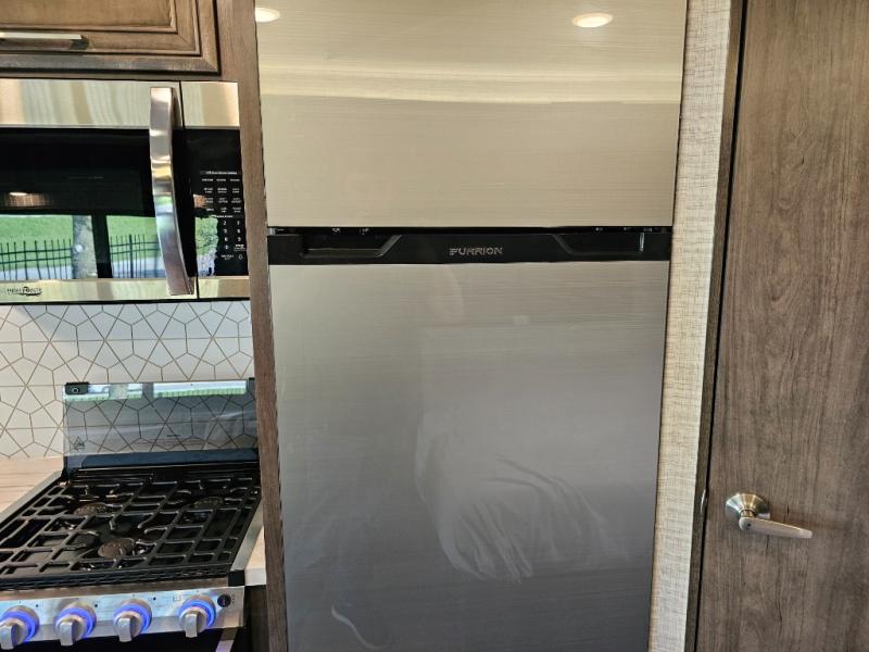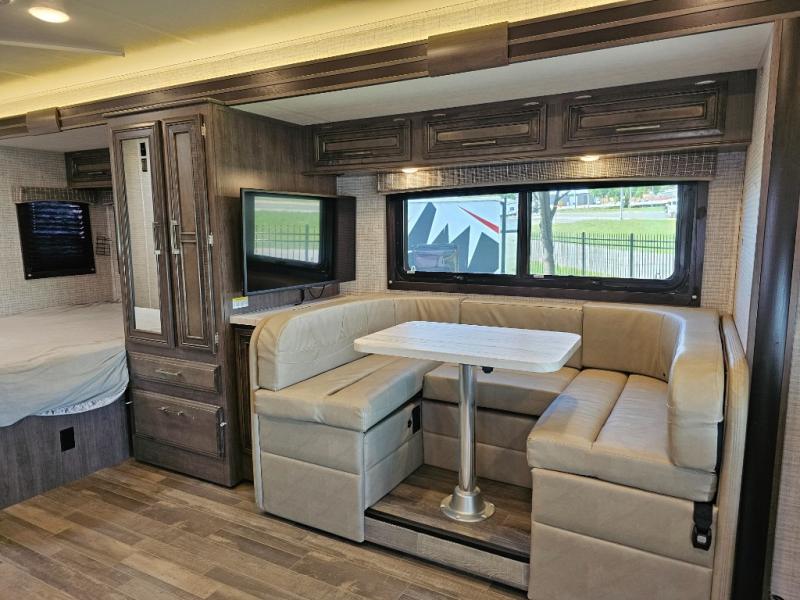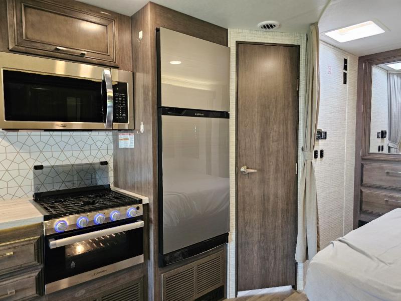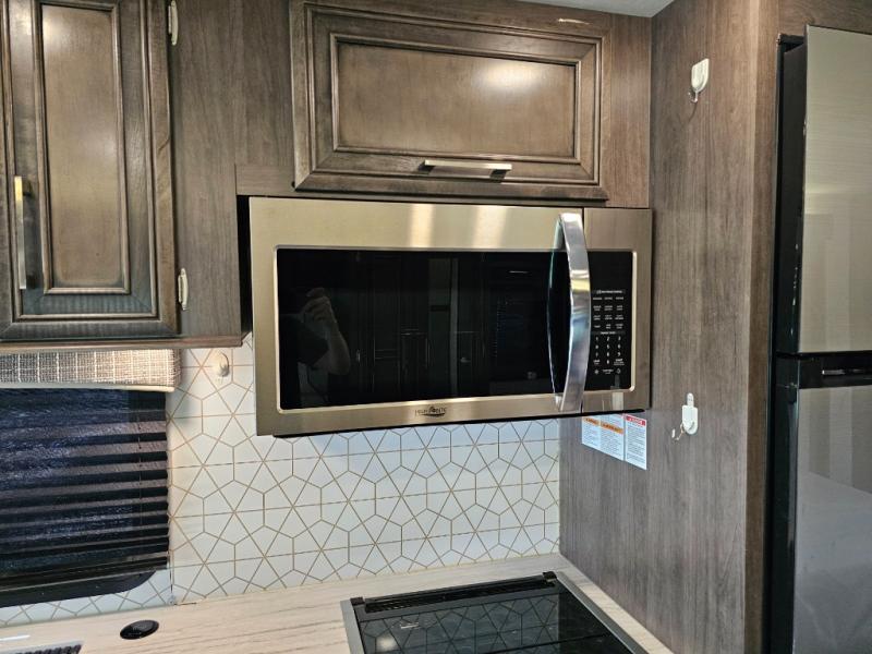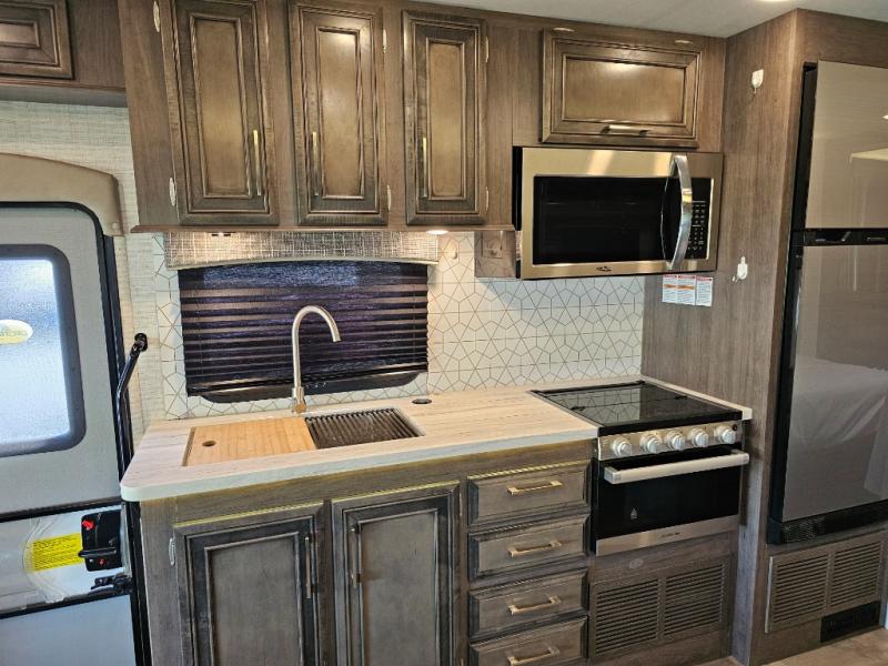 With any Odyssey Class C gas motorhome by Entegra Coach, the driver will appreciate the power from the 325 HP engine, the towing capacity from the 7,500 lb. hitch, the tire pressure monitoring system, the navigation from the Sony infotainment center with Apple CarPlay and Android Auto, plus the backup and side-view cameras when parking and driving down the highway. The kitchen offers full amenities including a recessed stainless steel sink with a cutting board sink cover, LED-lit countertops, a decorative backsplash, and a pop-up charging station with 110 outlet and USB plugs to keep your smart phones charged. Get ready for luxury in a Class C, choose your favorite today!