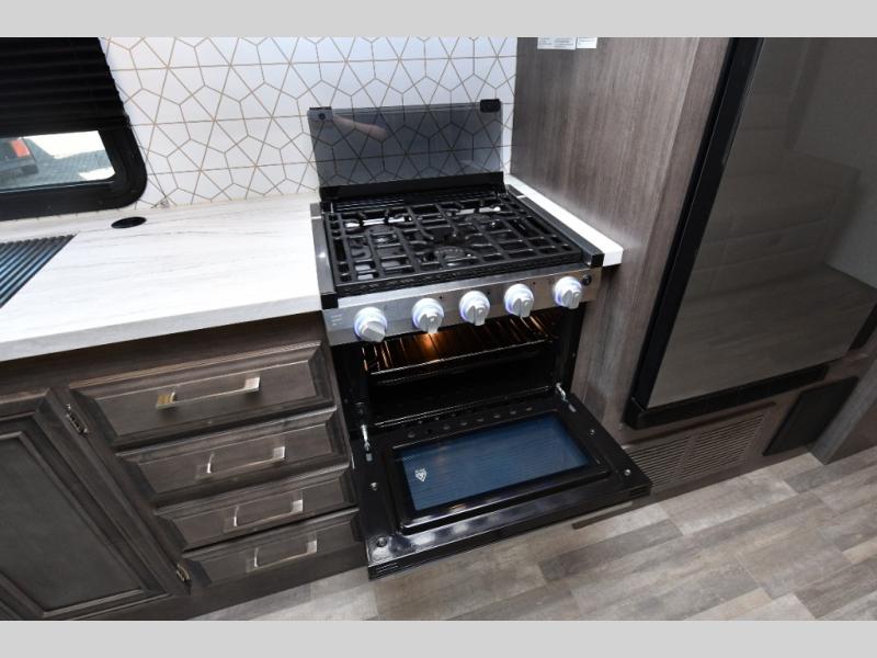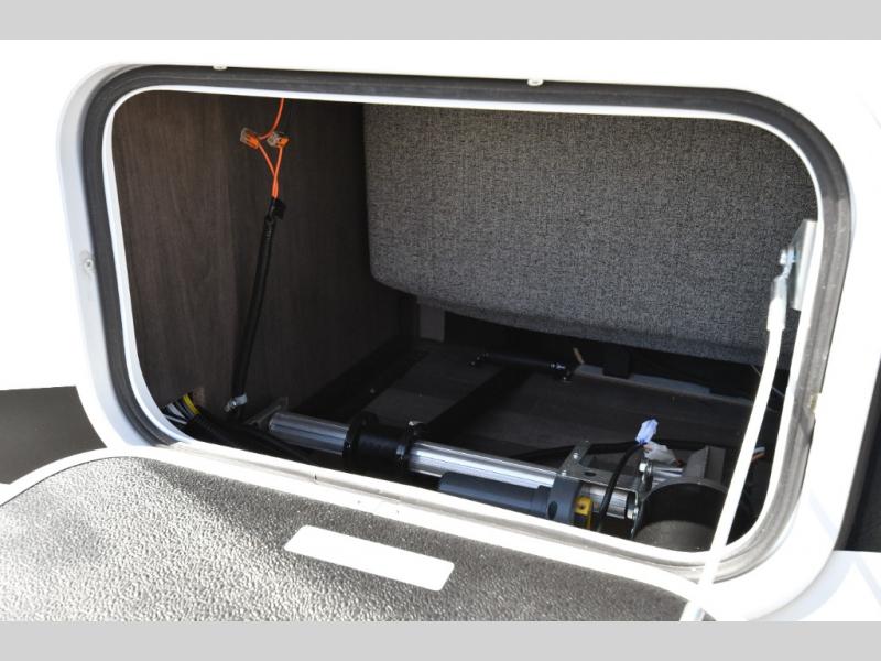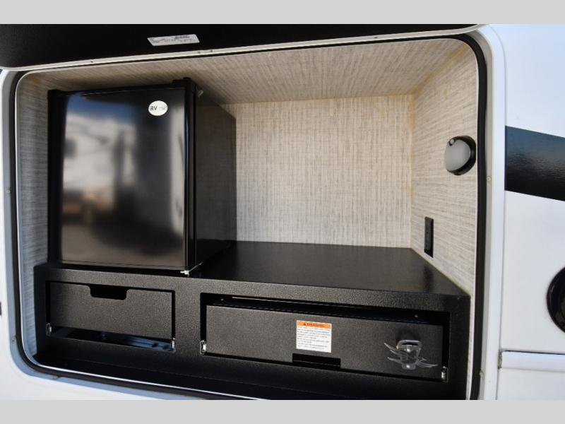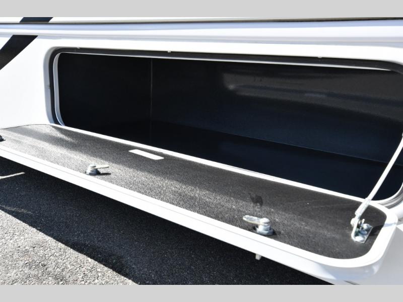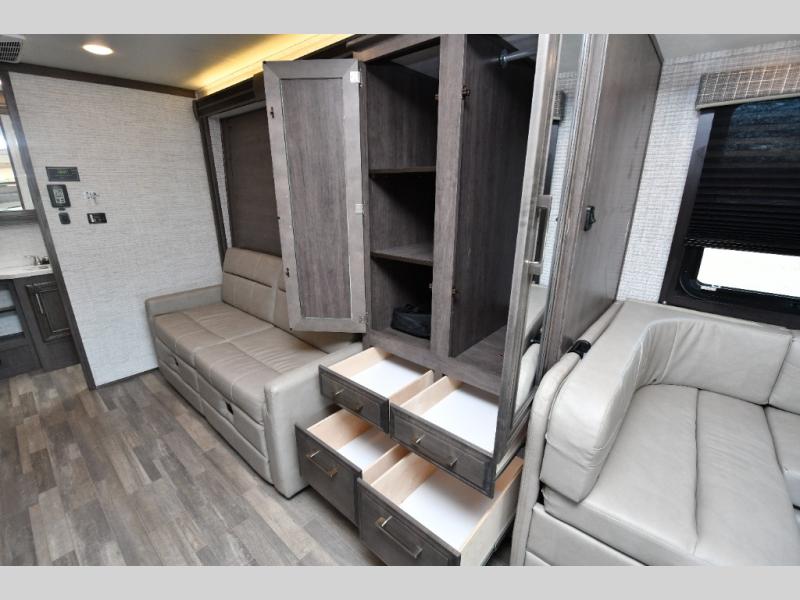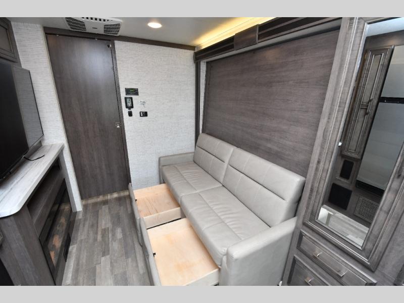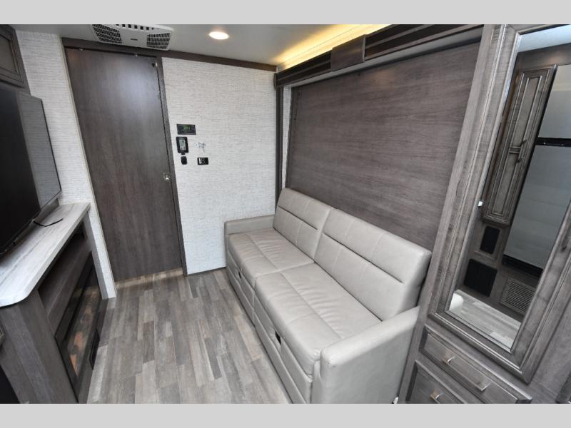 The thoughtfully designed floorplan offers space for everyone with flexible living areas and high-end finishes throughout. The queen Murphy bed and sofa combo gives you both a comfortable living space by day and a restful retreat by night. A cozy fireplace and LED HD Smart TV create a welcoming lounge for movie nights or relaxation after a long day of exploring. When the weather’s perfect, move outdoors to enjoy the exterior entertainment center and outdoor kitchen under the 19’ power awning—ideal for morning coffee or grilling at sunset.