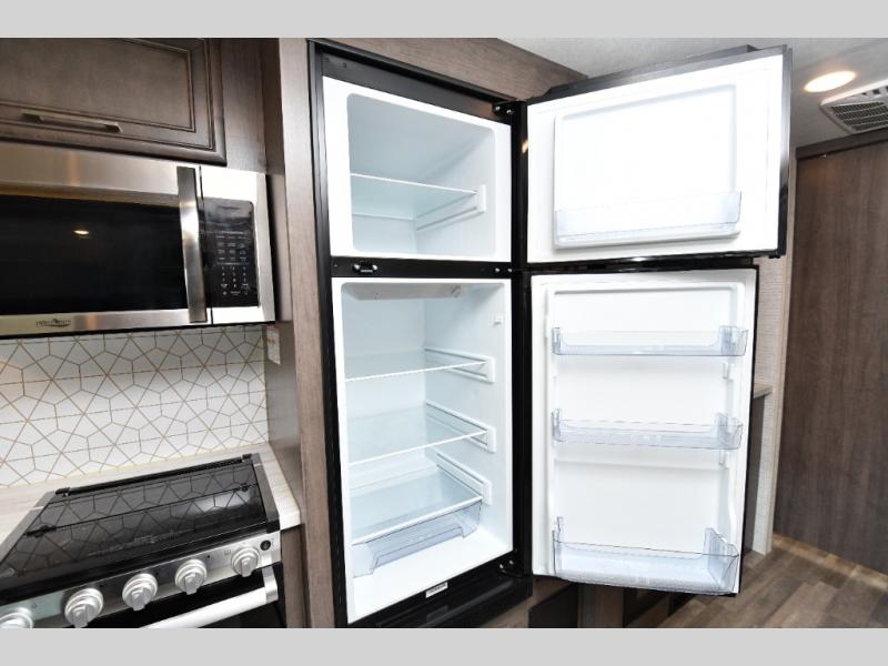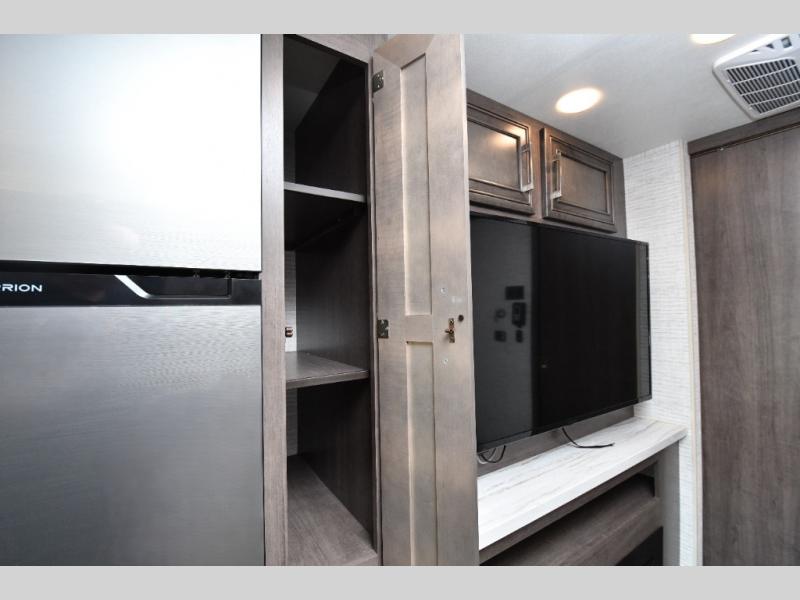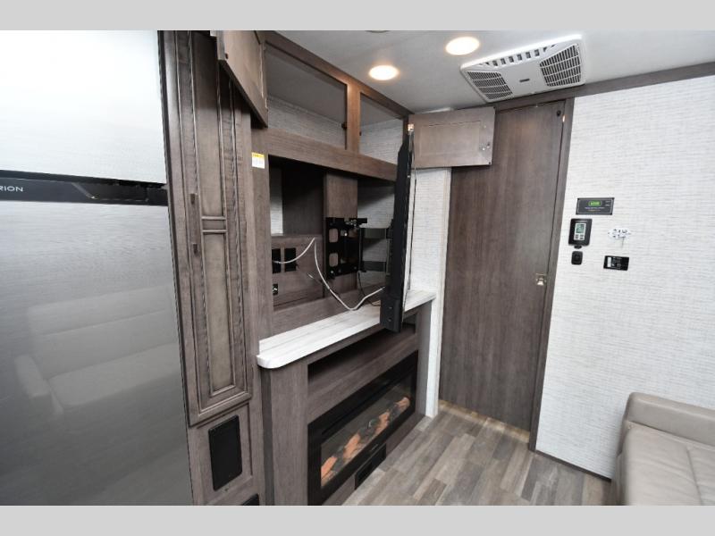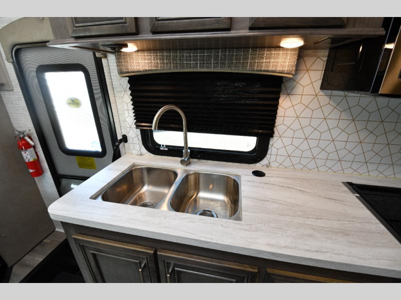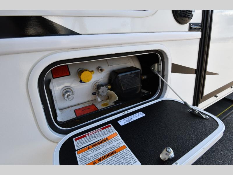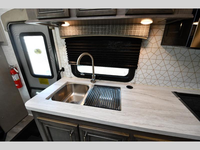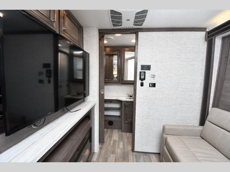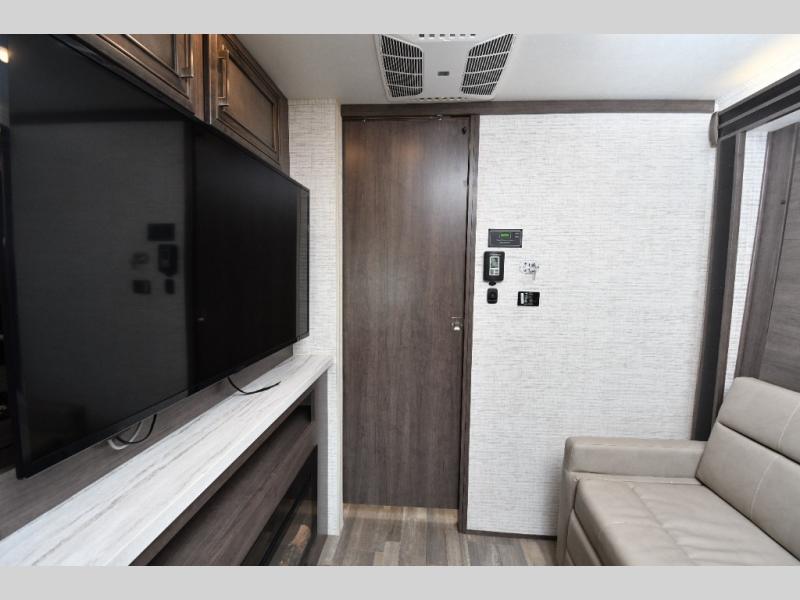The thoughtfully designed floorplan offers space for everyone with flexible living areas and high-end finishes throughout. The queen Murphy bed and sofa combo gives you both a comfortable living space by day and a restful retreat by night. A cozy fireplace and LED HD Smart TV create a welcoming lounge for movie nights or relaxation after a long day of exploring. When the weather’s perfect, move outdoors to enjoy the exterior entertainment center and outdoor kitchen under the 19’ power awning—ideal for morning coffee or grilling at sunset.