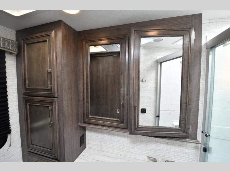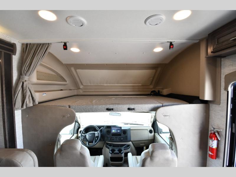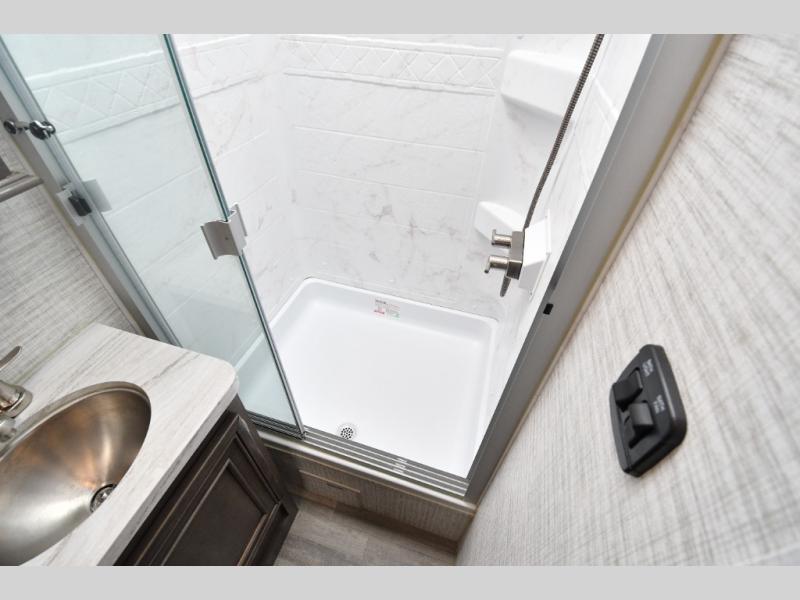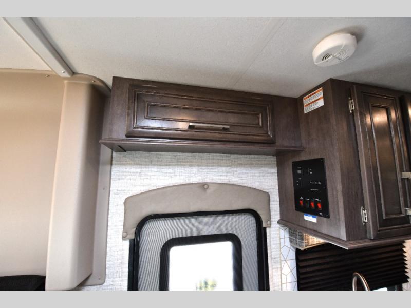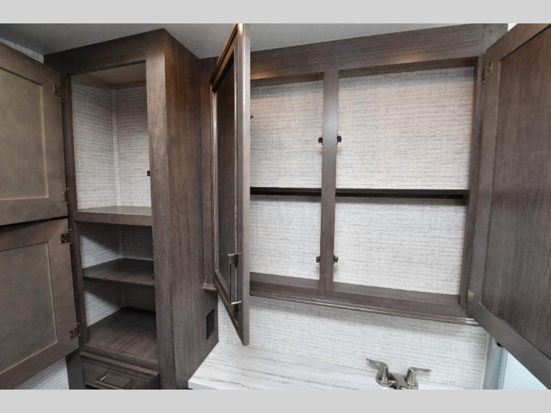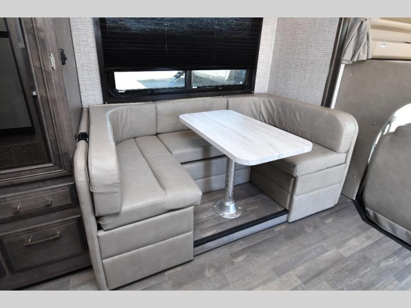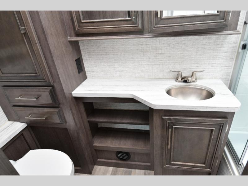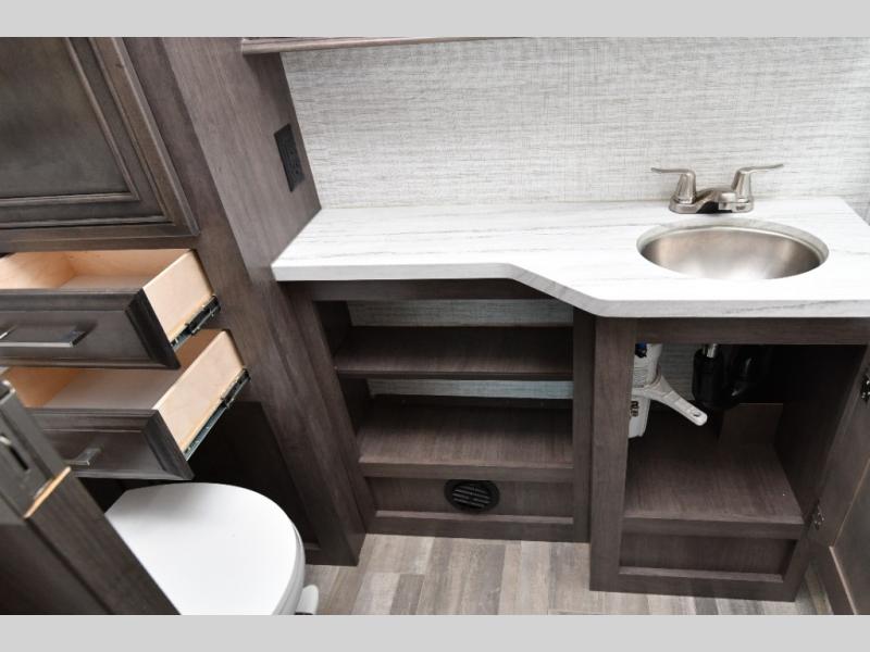 The rear full bath provides privacy and convenience with a spacious shower, counter space for toiletries, and a linen closet behind a space-saving sliding door. The U-shaped dinette and swivel captain’s chairs make dining or socializing effortless, while the cab-over bunk adds an extra sleeping space for guests or kids.