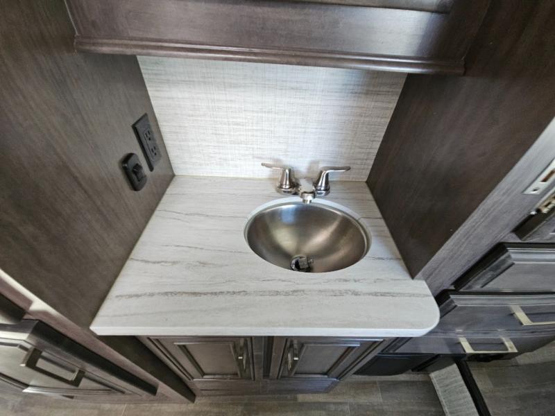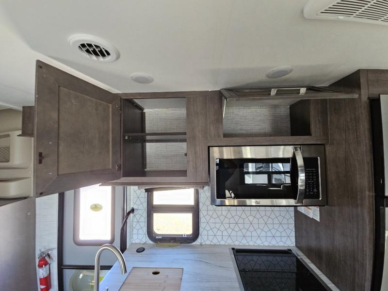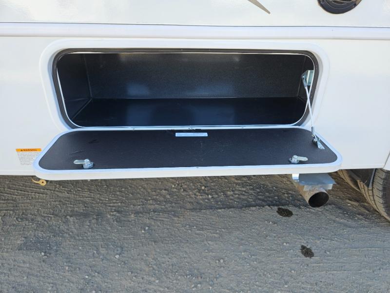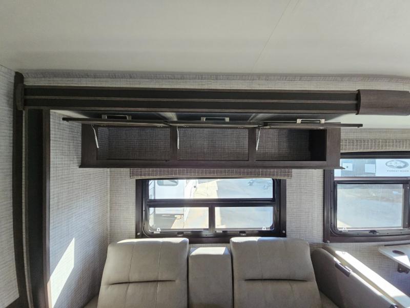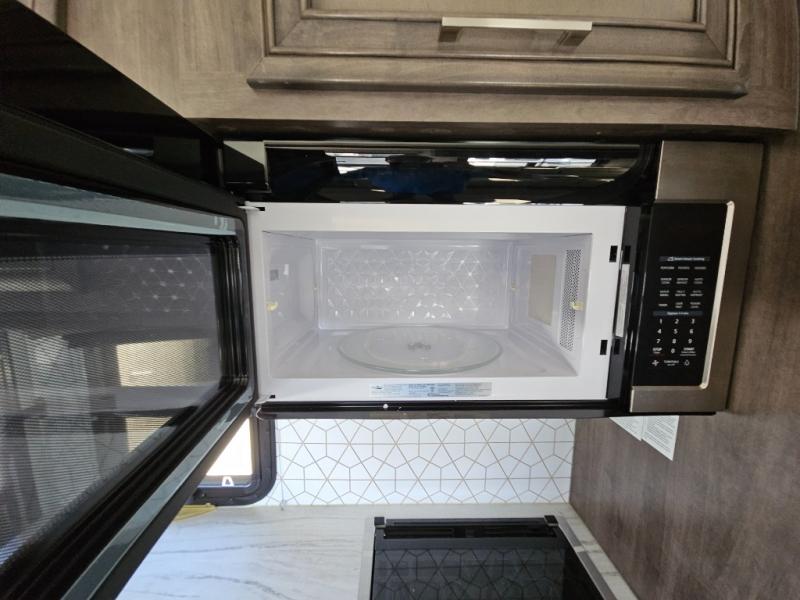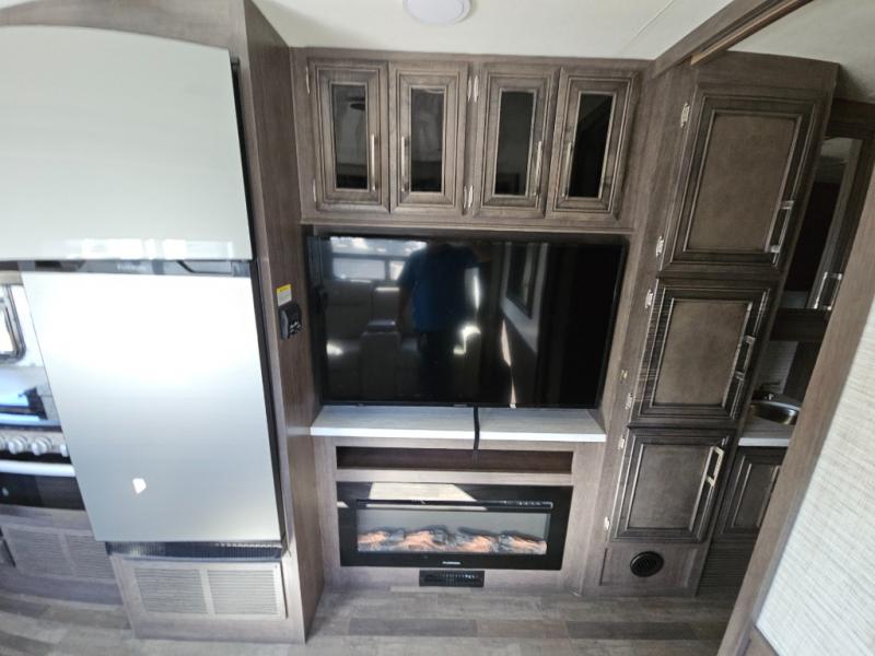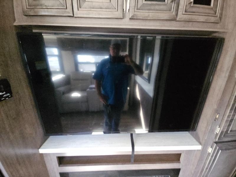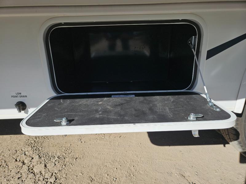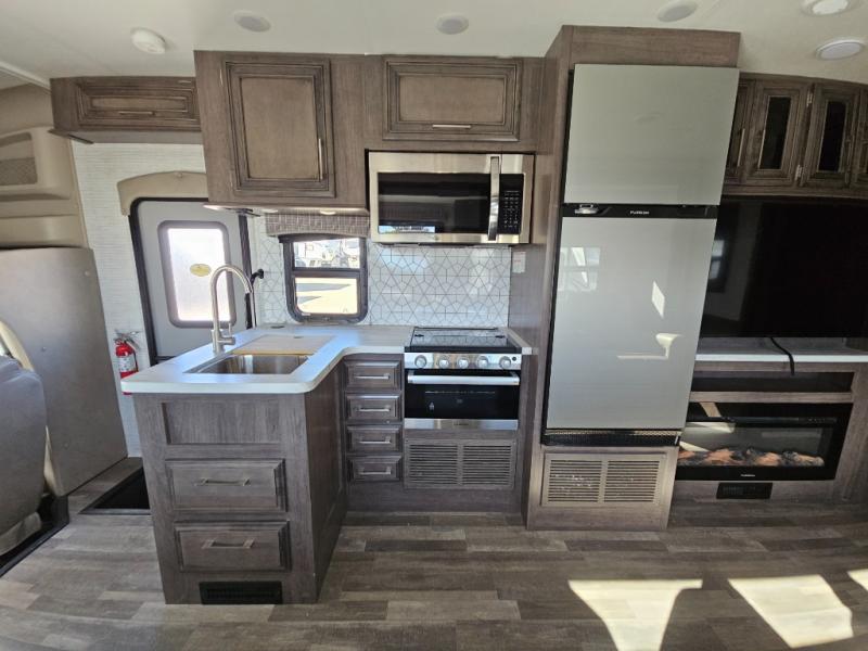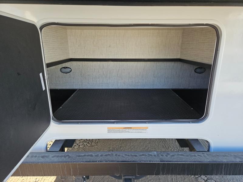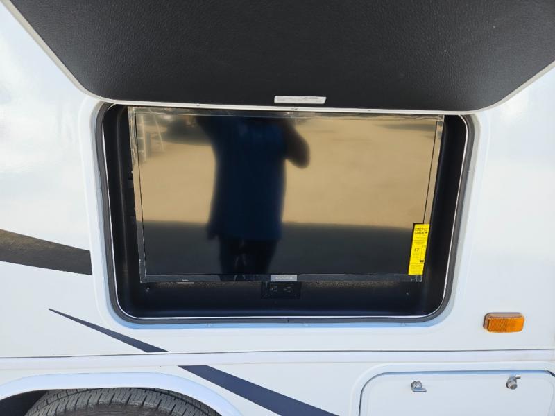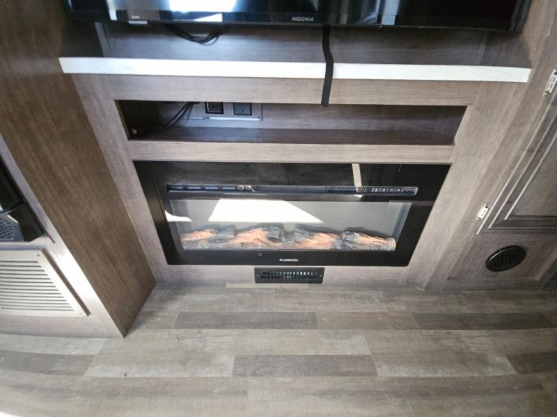 Relax inside while sitting on the sofa, at the booth dinette or on the swivel captains chairs while enjoying the fireplace and 50" TV, or unwind outside under the 18' electric awning while watching the exterior TV. After shopping in town or hiking the trails you can get cleaned up in the private toilet and shower room then brush your teeth in the bathroom sink a few steps outside the door. The private bedroom includes a space saving sliding door, a unique rear queen bed slide, plus storage. The cook will enjoy making meals using the residential-size microwave and Furrion all-in-one cooktop and oven, then storing leftovers in the 8 cu. ft. refrigerator. And the L-shaped counter with sink will come in handy.