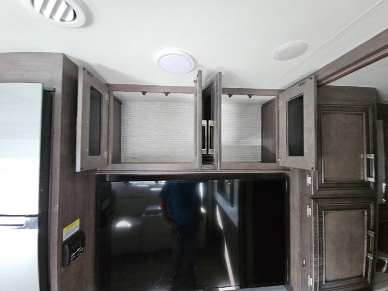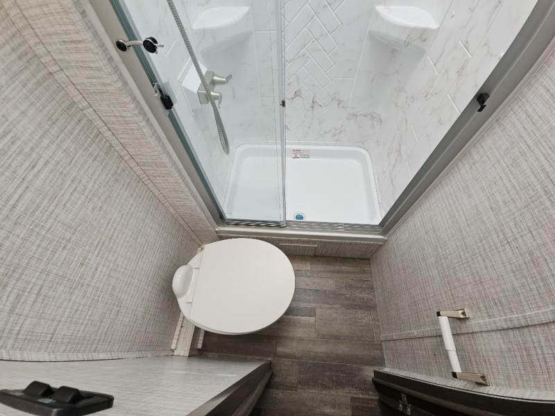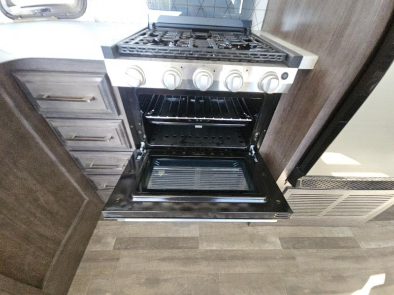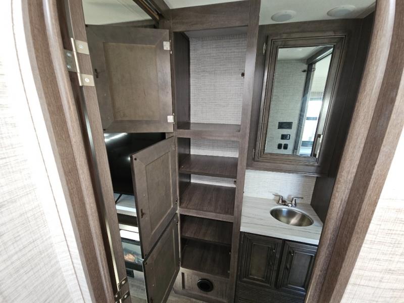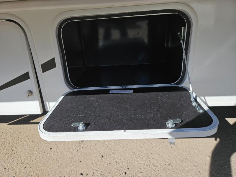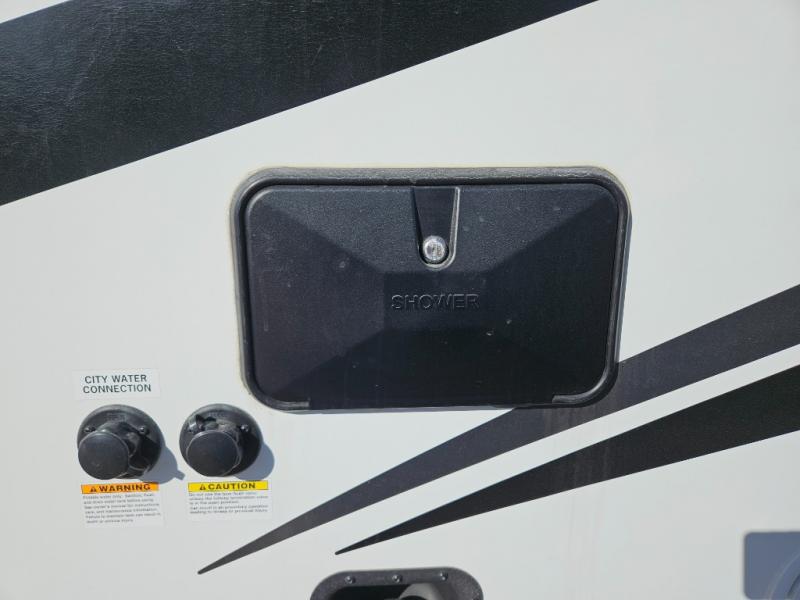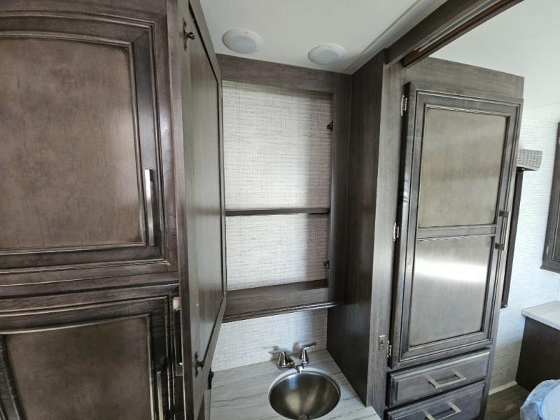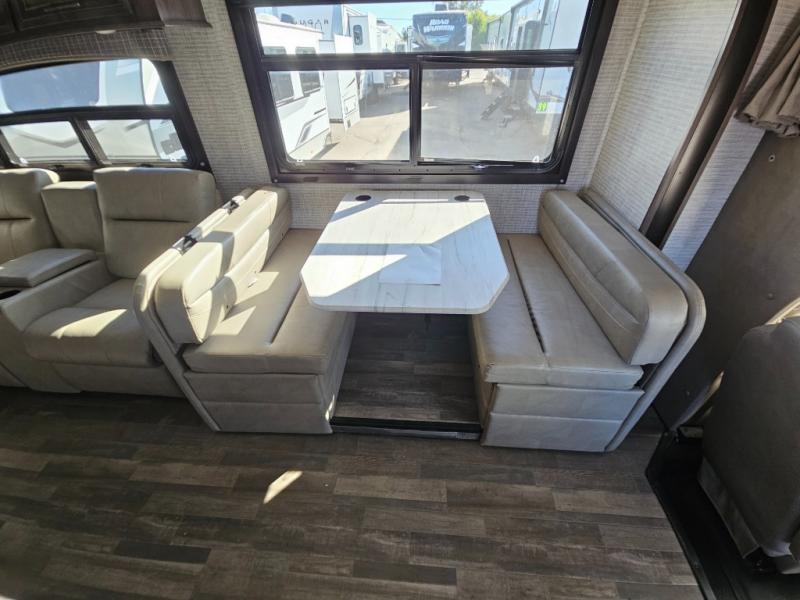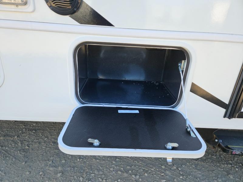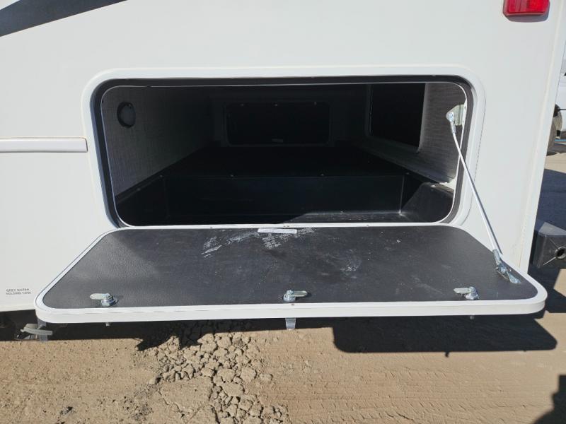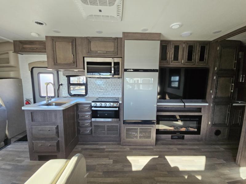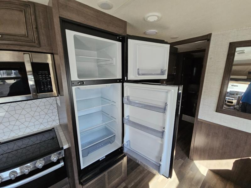 Relax inside while sitting on the sofa, at the booth dinette or on the swivel captains chairs while enjoying the fireplace and 50" TV, or unwind outside under the 18' electric awning while watching the exterior TV. After shopping in town or hiking the trails you can get cleaned up in the private toilet and shower room then brush your teeth in the bathroom sink a few steps outside the door. The private bedroom includes a space saving sliding door, a unique rear queen bed slide, plus storage. The cook will enjoy making meals using the residential-size microwave and Furrion all-in-one cooktop and oven, then storing leftovers in the 8 cu. ft. refrigerator. And the L-shaped counter with sink will come in handy.