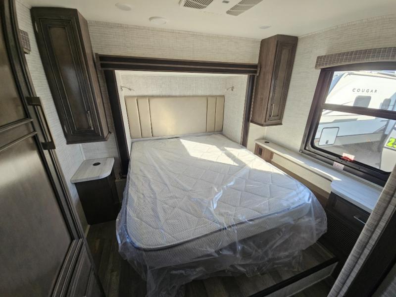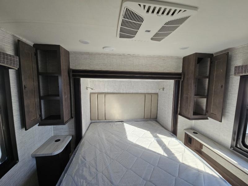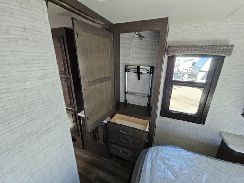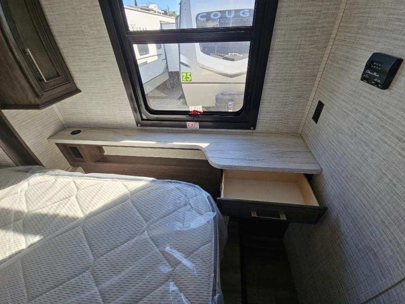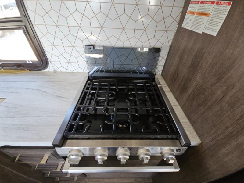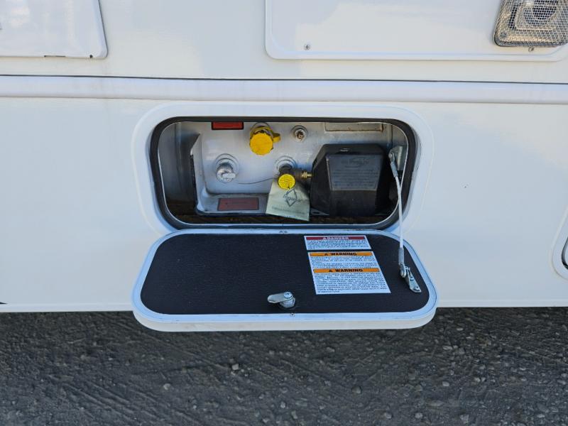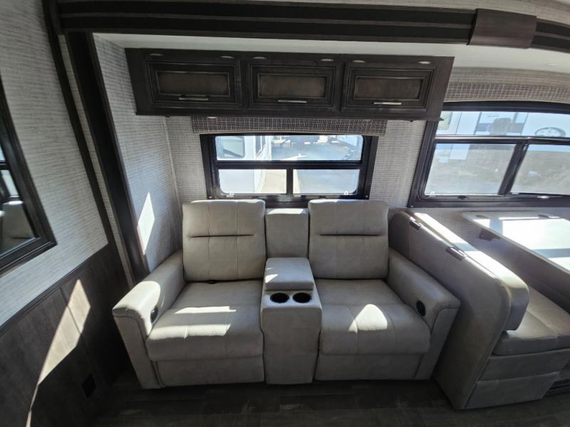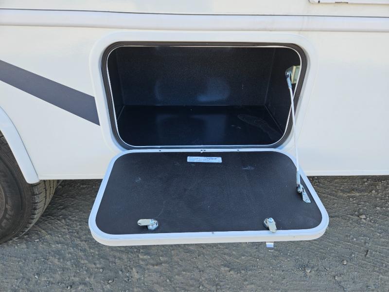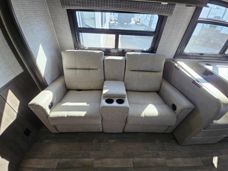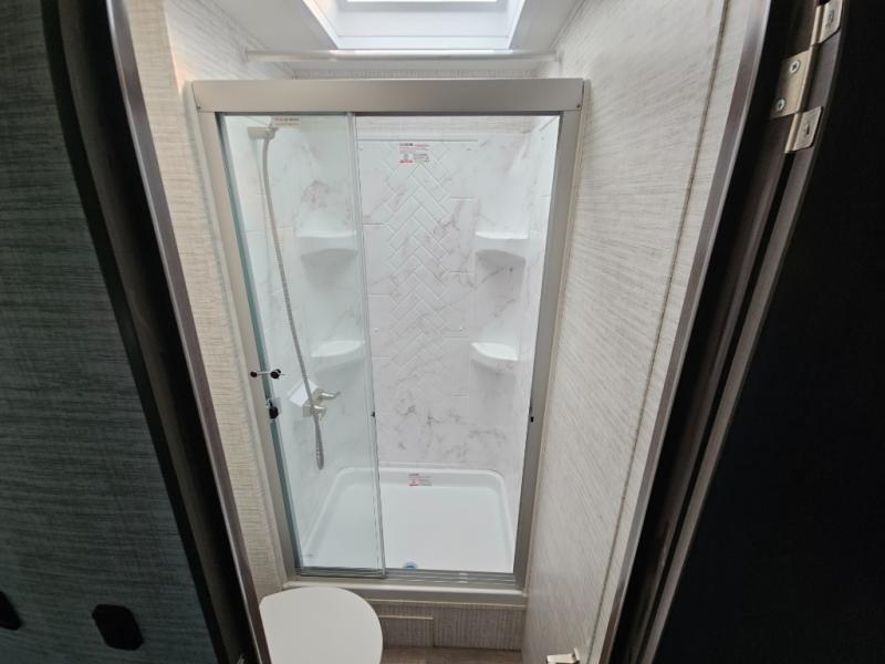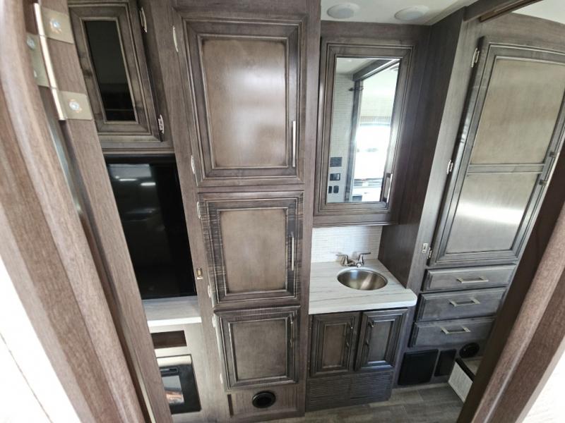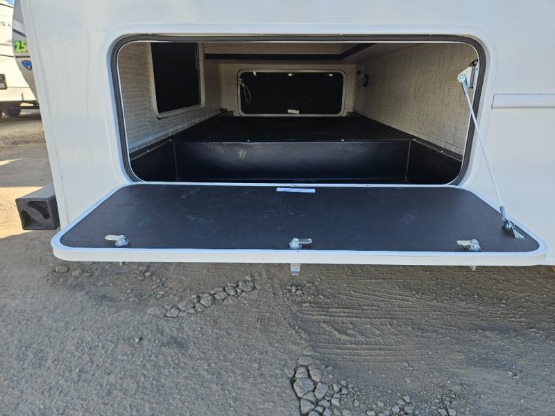 Relax inside while sitting on the sofa, at the booth dinette or on the swivel captains chairs while enjoying the fireplace and 50" TV, or unwind outside under the 18' electric awning while watching the exterior TV. After shopping in town or hiking the trails you can get cleaned up in the private toilet and shower room then brush your teeth in the bathroom sink a few steps outside the door. The private bedroom includes a space saving sliding door, a unique rear queen bed slide, plus storage. The cook will enjoy making meals using the residential-size microwave and Furrion all-in-one cooktop and oven, then storing leftovers in the 8 cu. ft. refrigerator. And the L-shaped counter with sink will come in handy.