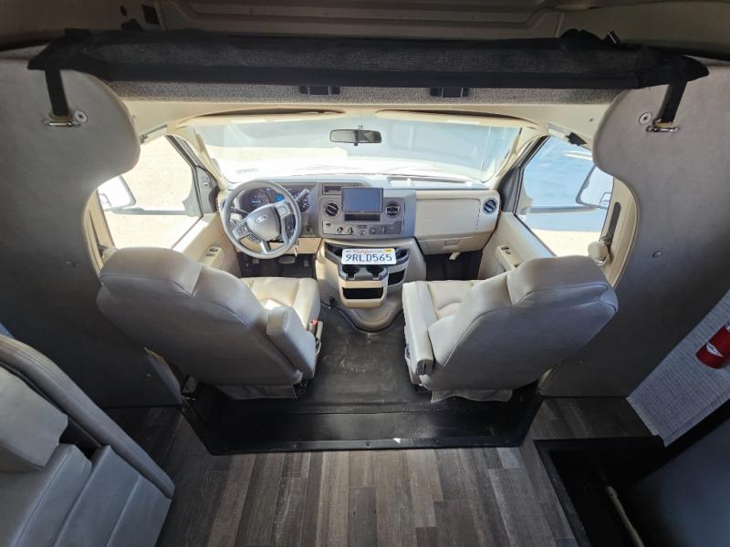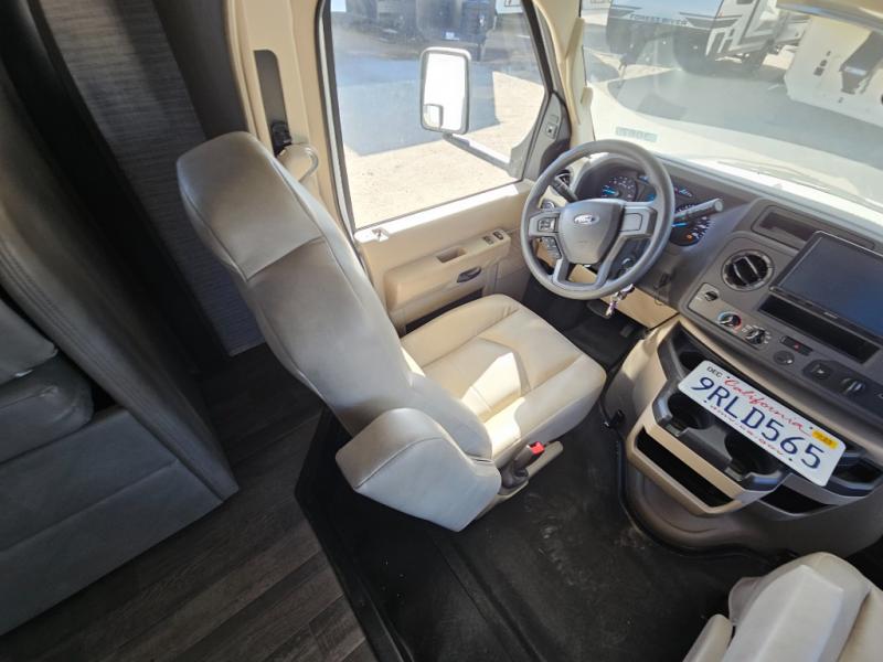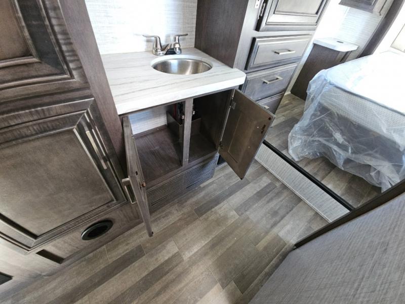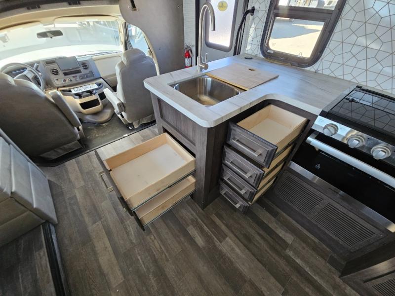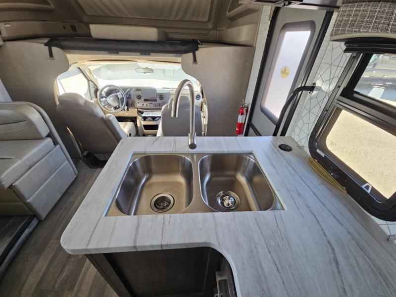 With any Odyssey Class C gas motorhome by Entegra Coach, the driver will appreciate the power from the 325 HP engine, the towing capacity from the 7,500 lb. hitch, the tire pressure monitoring system, the navigation from the Sony infotainment center with Apple CarPlay and Android Auto, plus the backup and side-view cameras when parking and driving down the highway. The kitchen offers full amenities including a recessed stainless steel sink with a cutting board sink cover, LED-lit pressed countertops, a decorative backsplash, and a pop-up charging station with 110 outlet and USB plugs to keep your smart phones charged. Get ready for luxury in a Class C, choose your favorite today!