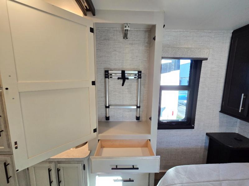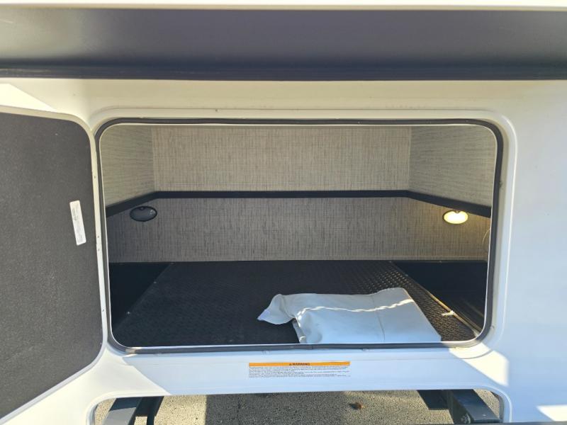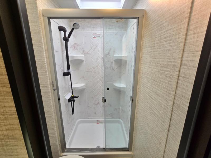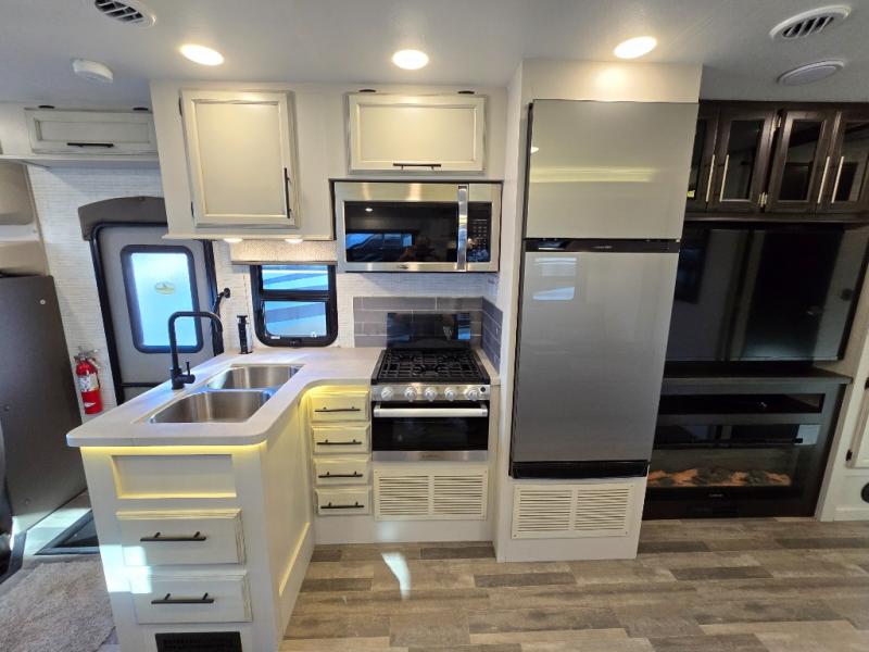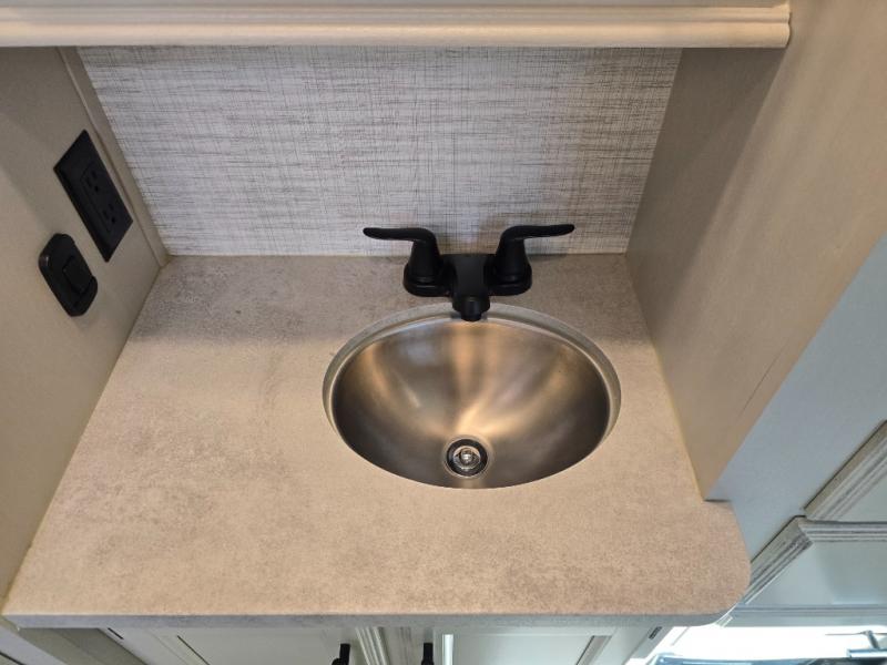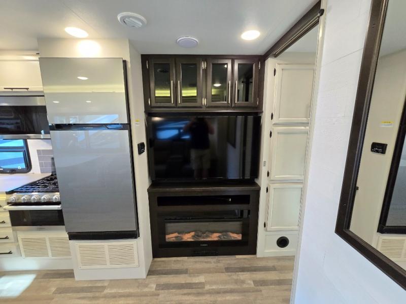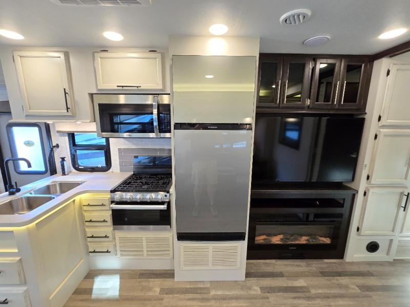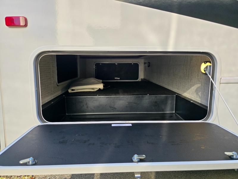 Relax inside while sitting on the sofa, at the booth dinette or on the swivel captains chairs while enjoying the fireplace and 50" TV, or unwind outside under the 18' electric awning while watching the exterior TV. After shopping in town or hiking the trails you can get cleaned up in the private toilet and shower room then brush your teeth in the bathroom sink a few steps outside the door. The private bedroom includes a space saving sliding door, a unique rear queen bed slide, plus storage. The cook will enjoy making meals using the residential-size microwave and Furrion all-in-one cooktop and oven, then storing leftovers in the 8 cu. ft. refrigerator. And the L-shaped counter with sink will come in handy.