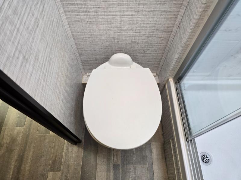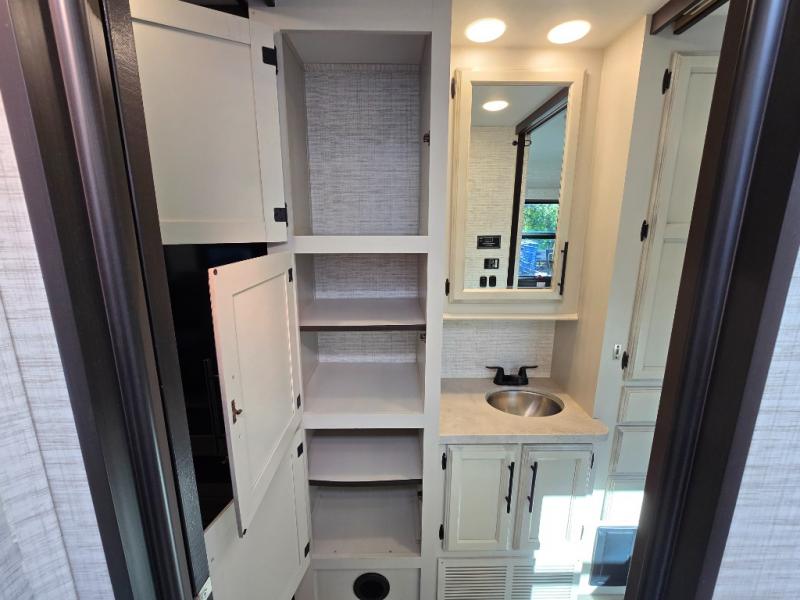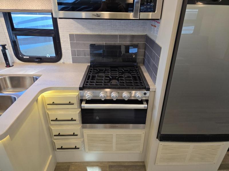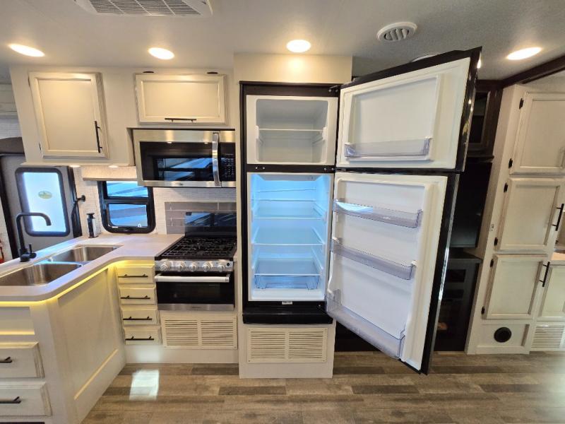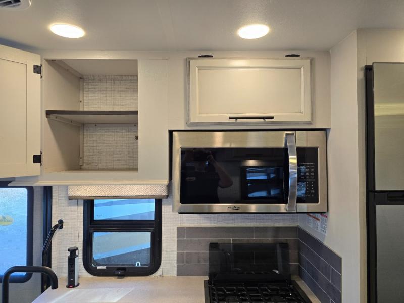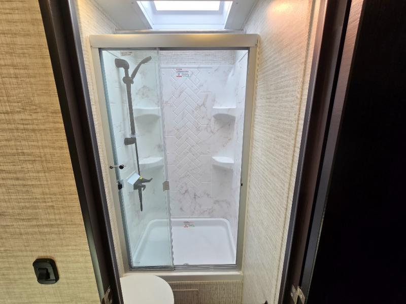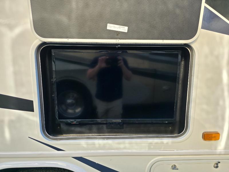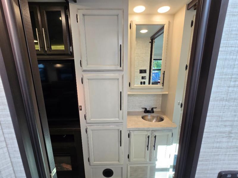 Relax inside while sitting on the sofa, at the booth dinette or on the swivel captains chairs while enjoying the fireplace and 50" TV, or unwind outside under the 18' electric awning while watching the exterior TV. After shopping in town or hiking the trails you can get cleaned up in the private toilet and shower room then brush your teeth in the bathroom sink a few steps outside the door. The private bedroom includes a space saving sliding door, a unique rear queen bed slide, plus storage. The cook will enjoy making meals using the residential-size microwave and Furrion all-in-one cooktop and oven, then storing leftovers in the 8 cu. ft. refrigerator. And the L-shaped counter with sink will come in handy.