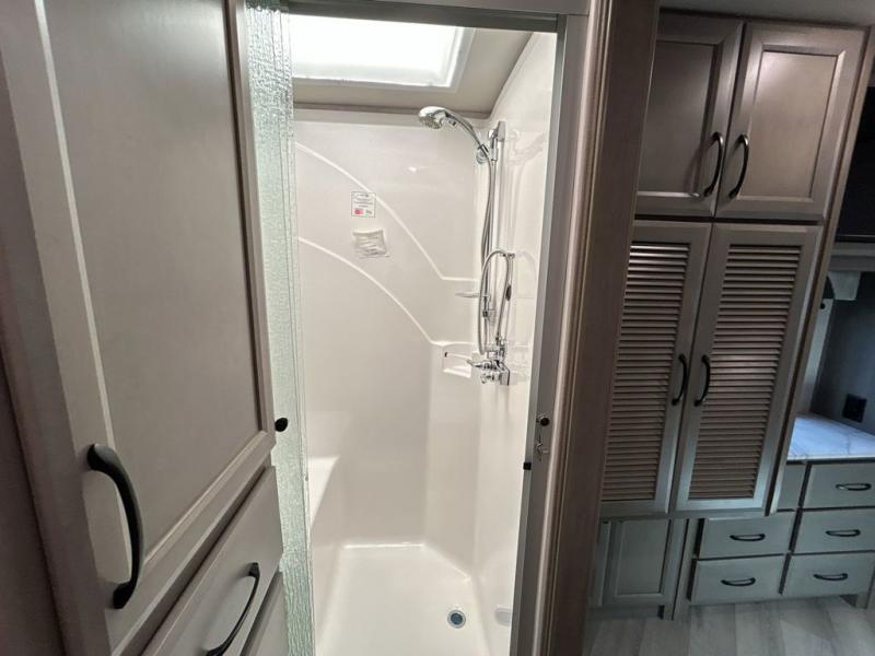 With any Bounder Class A gas motorhome by Fleetwood, you can travel in luxury and style with the power you desire to enjoy the ride as much as the destination. Beginning with the Power Platform Ford chassis, the enhanced safety features such as remote, power-heated mirrors with turn indicators and side cameras, and the color monitor for side and rear cameras, traveling is made easy. There is also an automotive one-piece windshield, a 100W solar panel, and WiFi Ranger Sky4 that come standard. A 5.5kW Onan generator will keep you powered up and you'll find plenty of storage both inside and out for personal belongings, camp gear, and more. Inside you will love the look of the durable, hand-laid Tarkett flooring, the energy efficient LED flush mount ceiling lighting, and the fiberglass shower with a glass door. Choose a Bounder Class A gas coach to discover even more stand-out features!