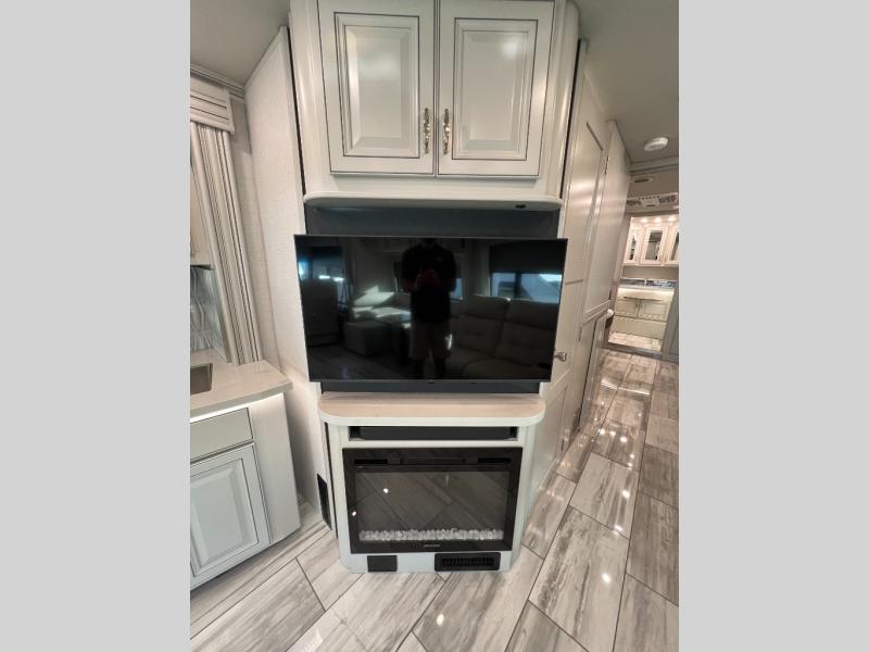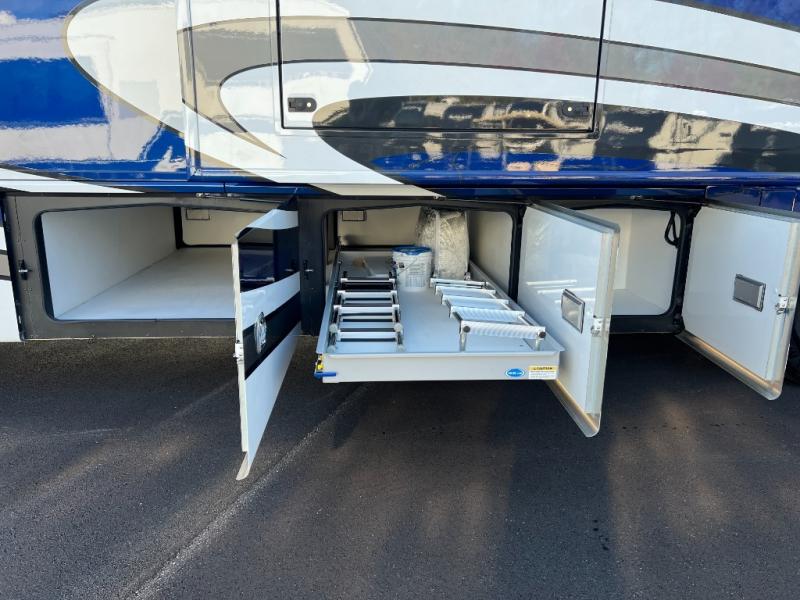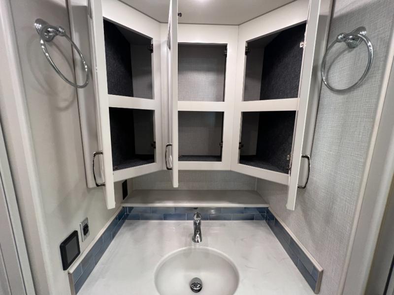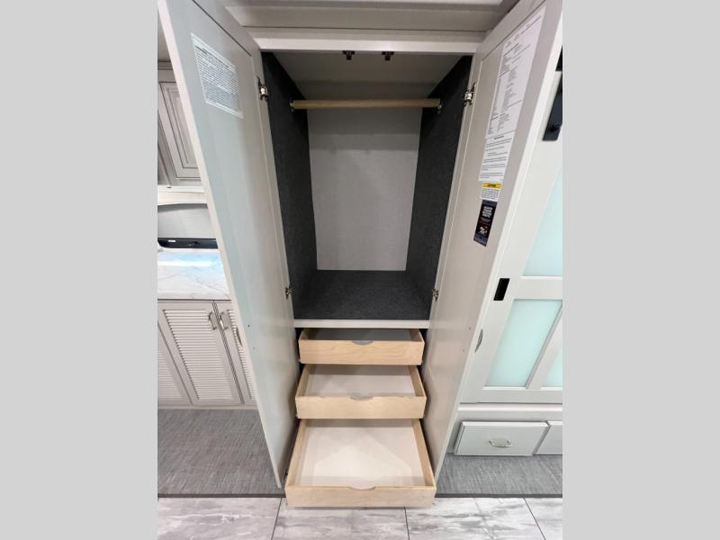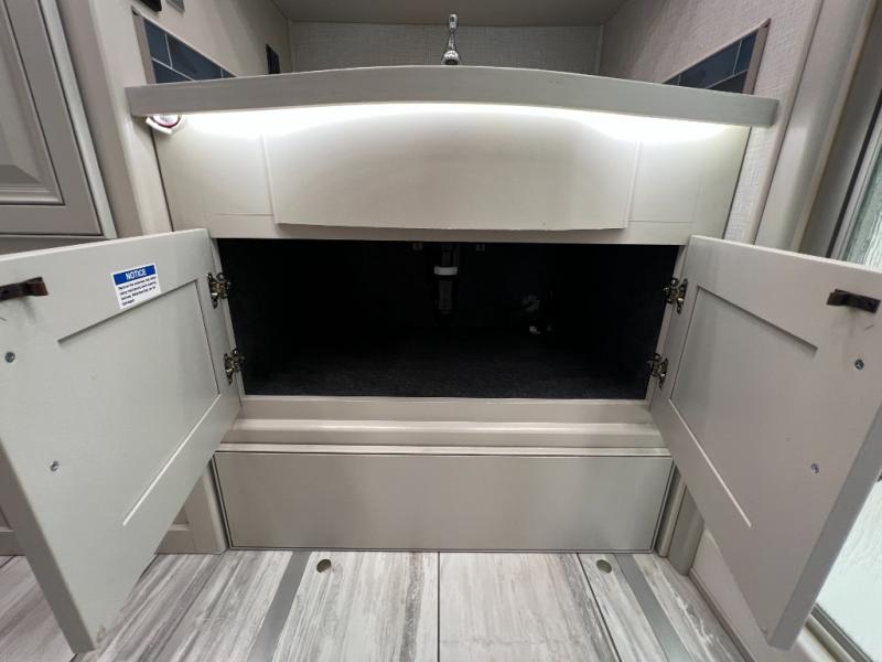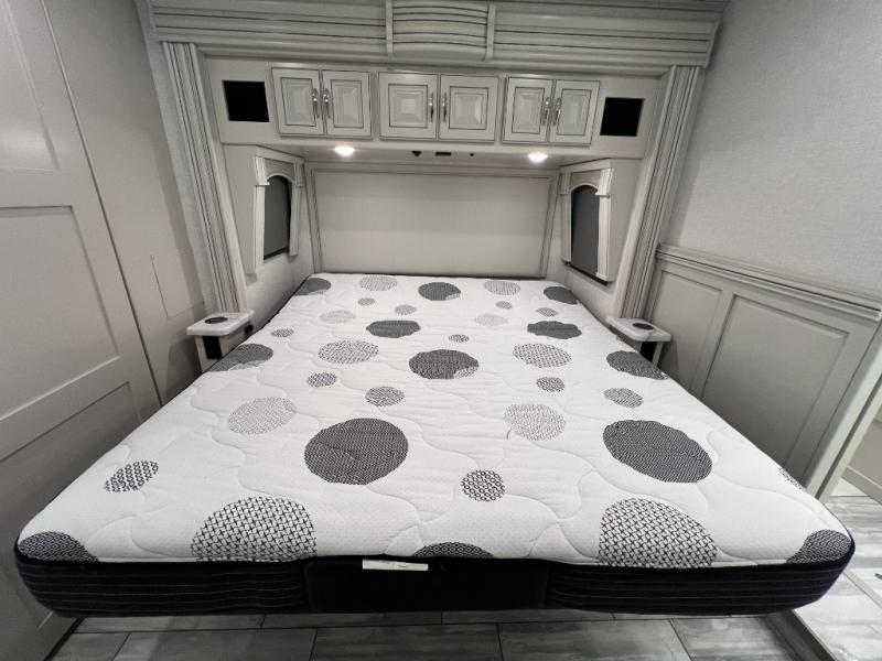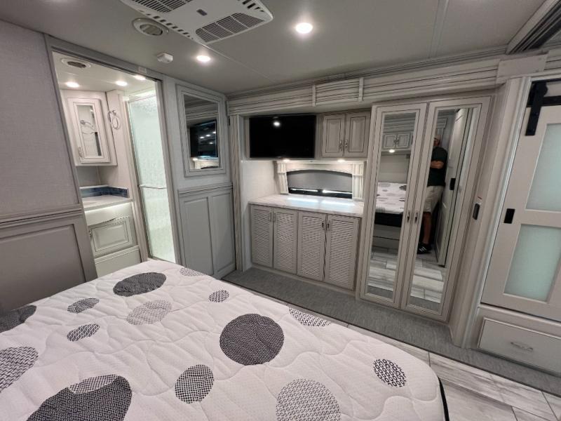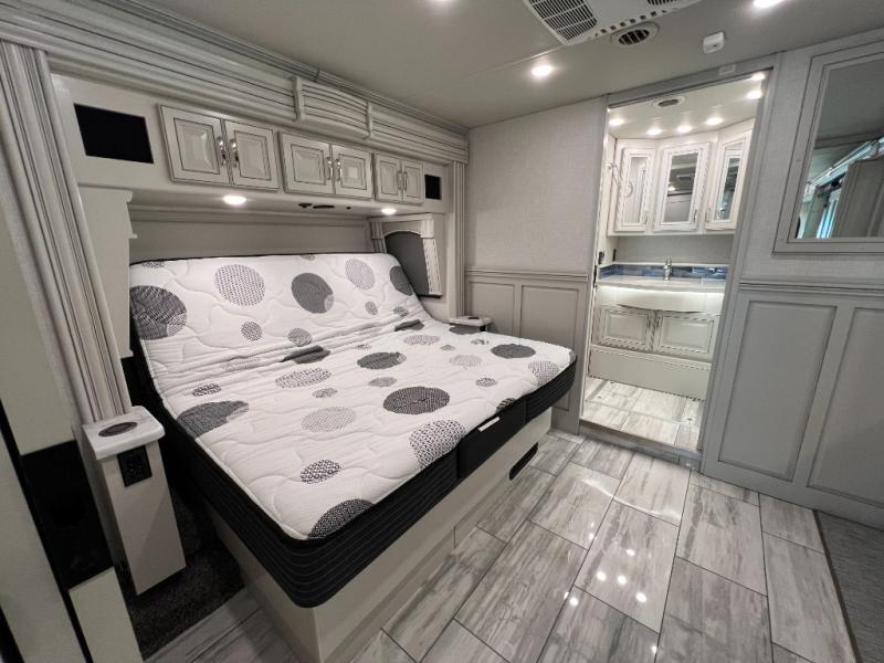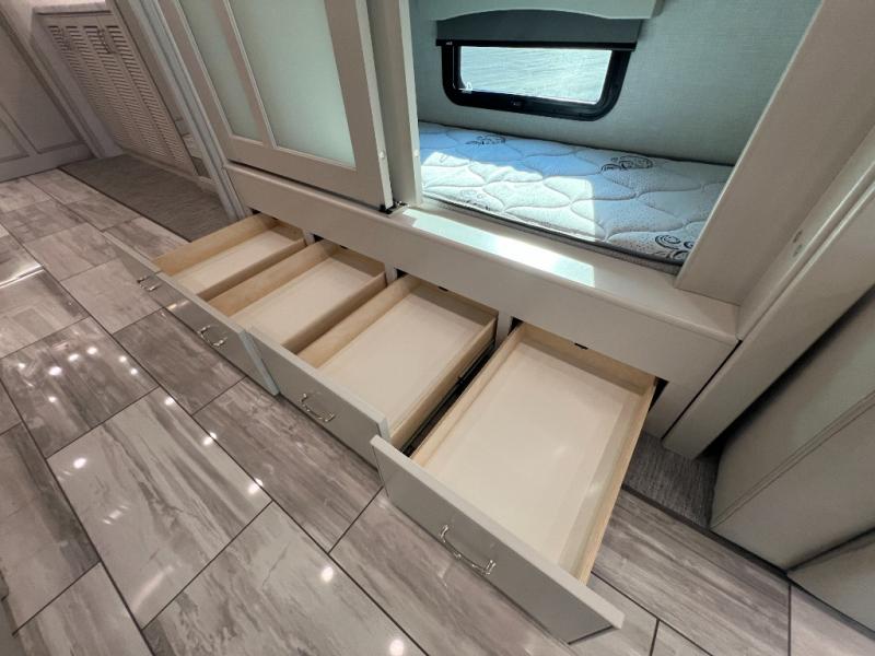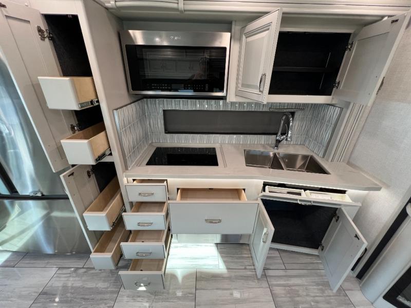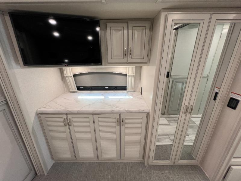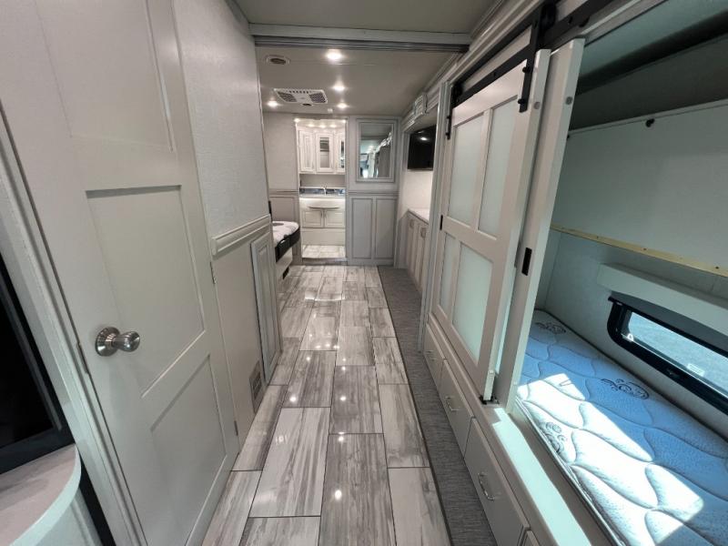 This coach offers a family or a couple that enjoys entertaining overnight guests plenty of sleeping space with the convertible bunk beds with barn doors. You can sleep even more guests when the optional Hide-A-Bed power drop-down overhead bunk is added, plus the sofa sleeper with pull-out twin bed and the booth dinette. The main living area also has an LED TV with a fireplace below and an LED TV over the cab to watch. The two full bathrooms shorten the waiting lines, and are convenient for all. The rear bathroom that is attached to the master bedroom even has a bedroom wardrobe. The bedroom provides a king bed slide for more floor space, and a side-by-side washer/dryer to keep everything clean while on the road, an LED TV to watch before bedtime, and more clothing storage. The kitchen offers stainless steel appliances, a convection microwave, an induction cooktop and so much more!