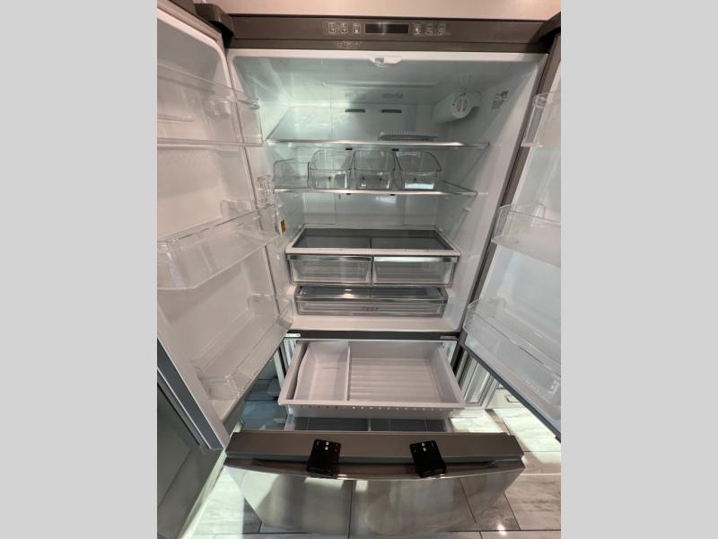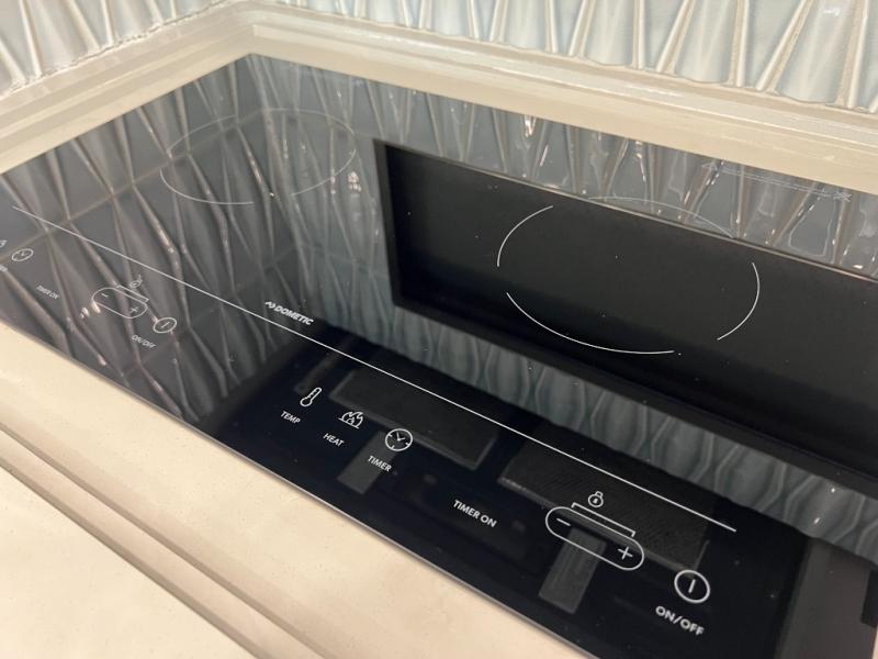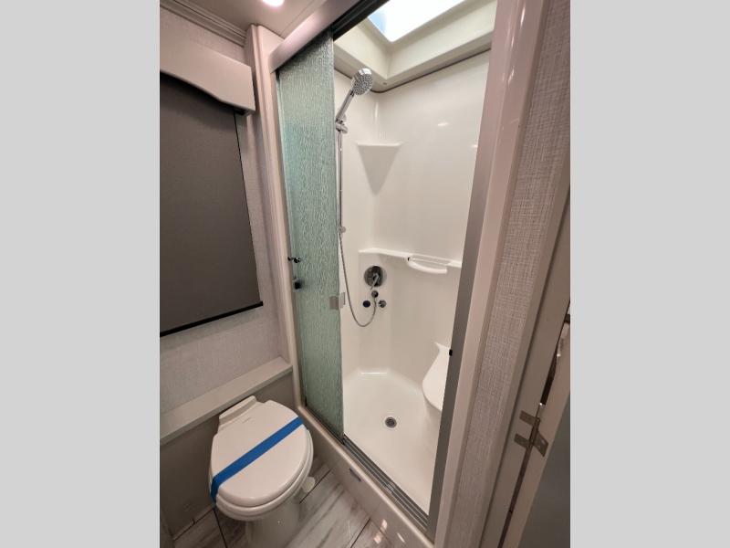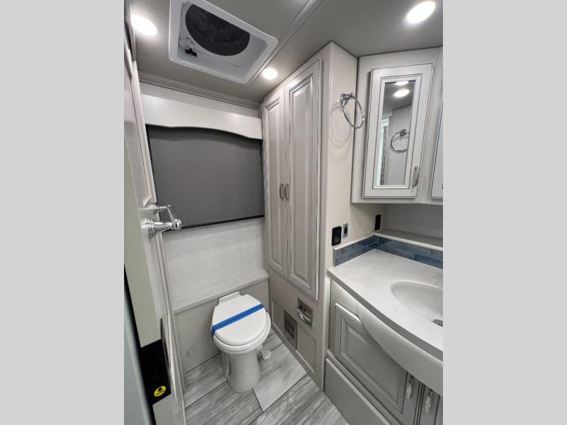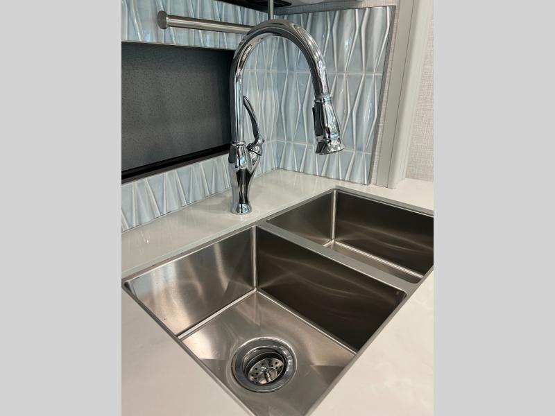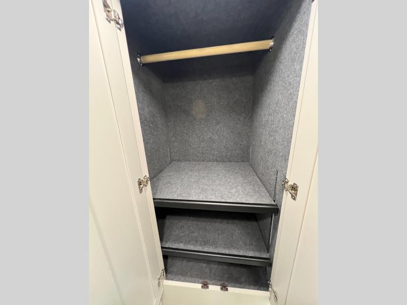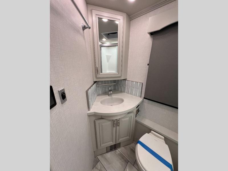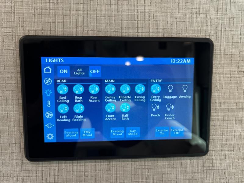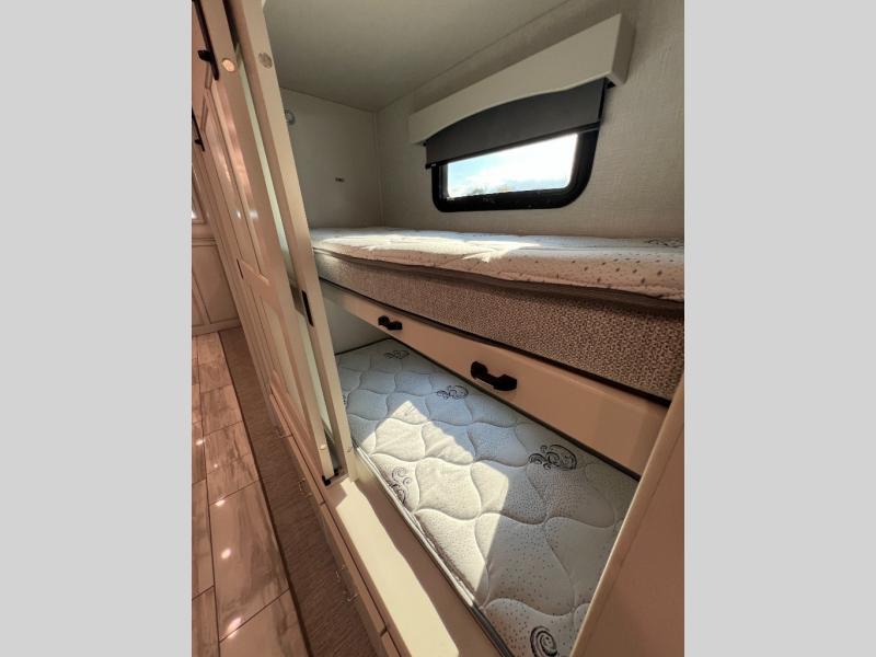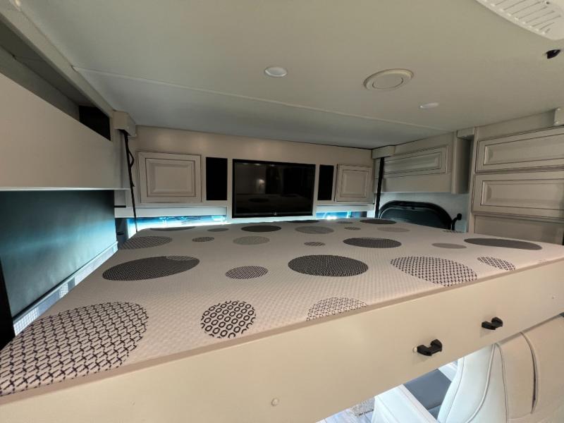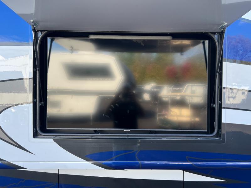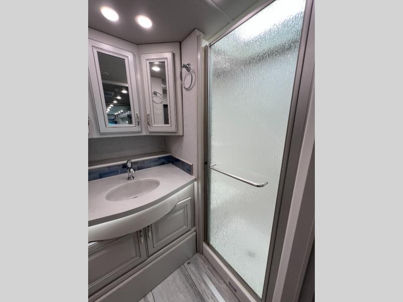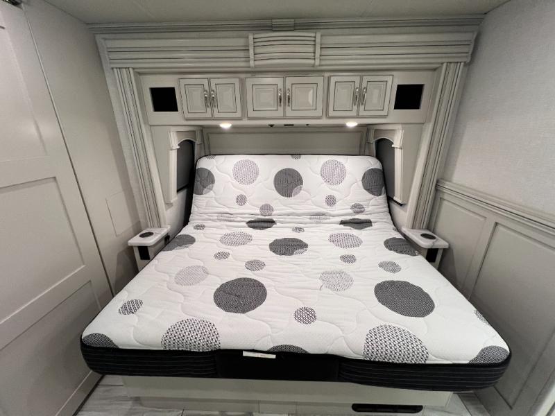This coach offers a family or a couple that enjoys entertaining overnight guests plenty of sleeping space with the convertible bunk beds with barn doors. You can sleep even more guests when the optional Hide-A-Bed power drop-down overhead bunk is added, plus the sofa sleeper with pull-out twin bed and the booth dinette. The main living area also has an LED TV with a fireplace below and an LED TV over the cab to watch. The two full bathrooms shorten the waiting lines, and are convenient for all. The rear bathroom that is attached to the master bedroom even has a bedroom wardrobe. The bedroom provides a king bed slide for more floor space, and a side-by-side washer/dryer to keep everything clean while on the road, an LED TV to watch before bedtime, and more clothing storage. The kitchen offers stainless steel appliances, a convection microwave, an induction cooktop and so much more!