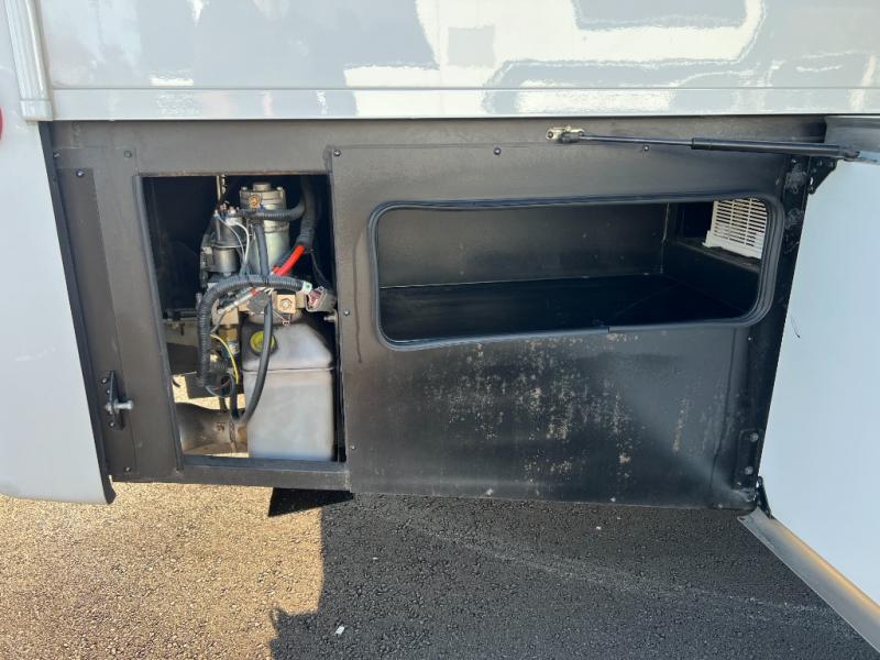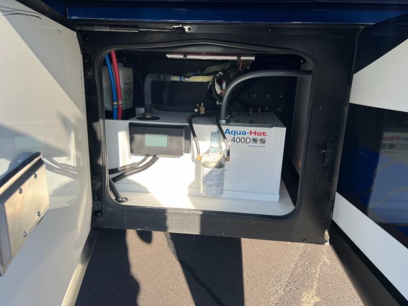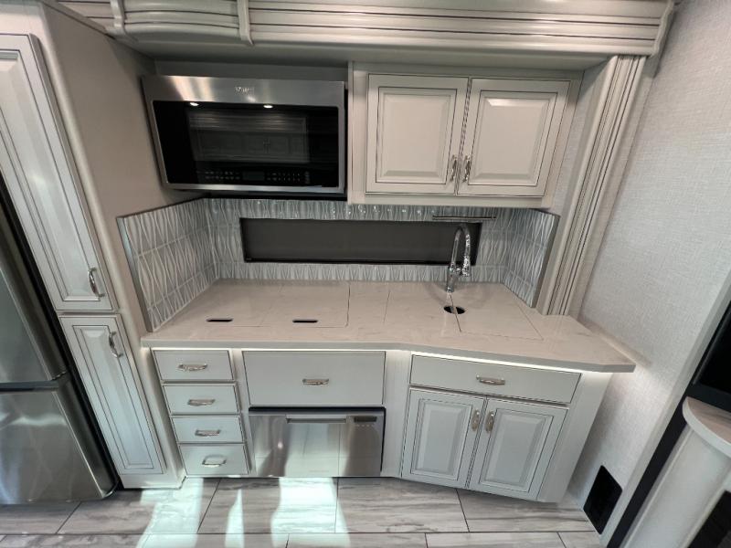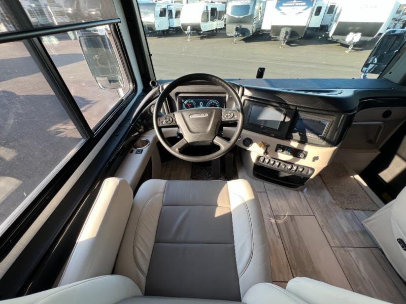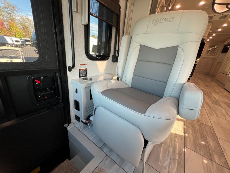 With any Fleetwood Discovery Class A diesel motorhome, the Freedom Bridge custom chassis, the V-Ride rear suspension, and the Cummins ISB turbocharged engine offer a smooth and enjoyable ride to all your destinations. The construction also includes the Powerlock System with interlocking floor, walls and roof, heated fresh water and holding tank compartments, and a full coverage heavy duty undercoating. The interior cabin includes an LED OptiView instrument panel, an air suspension deflation system, and a 10.2" stereo touch screen with lots of functions making traveling easier. And you will love the style of the interior decor and cabinetry, the energy efficient LED flush mount ceiling lighting, the polished solid surface galley countertop with lighting, the residential features throughout, and all the entertainment. Choose to travel and live better in a Discovery!