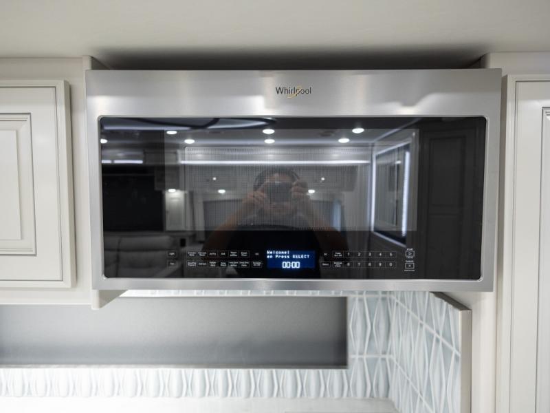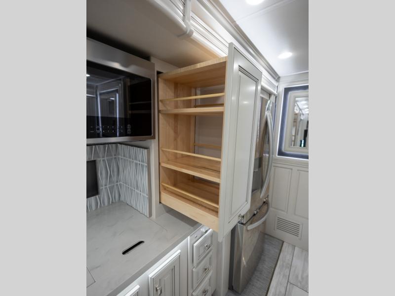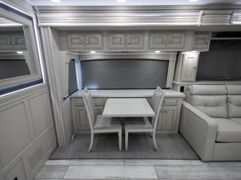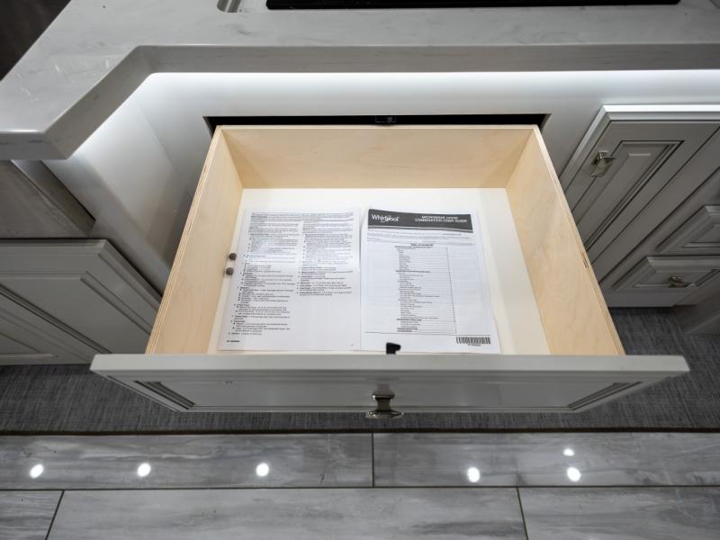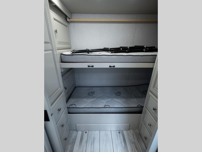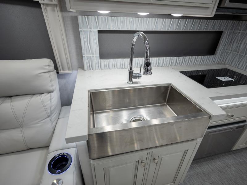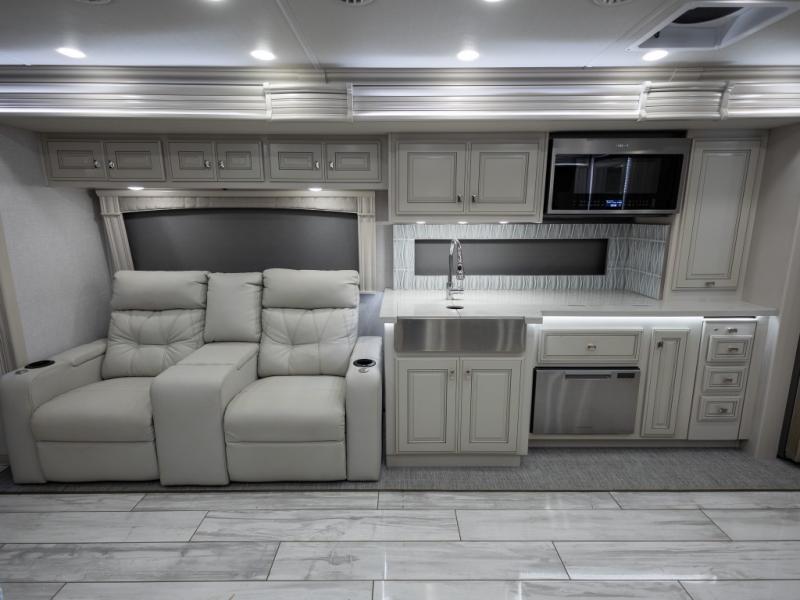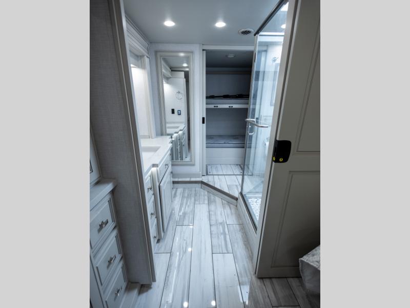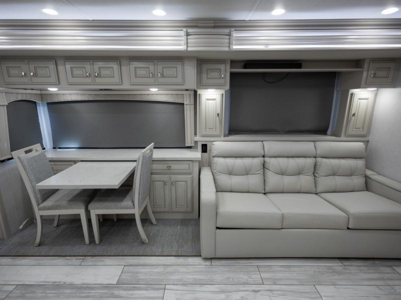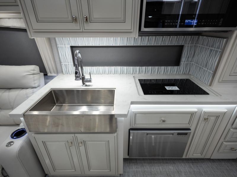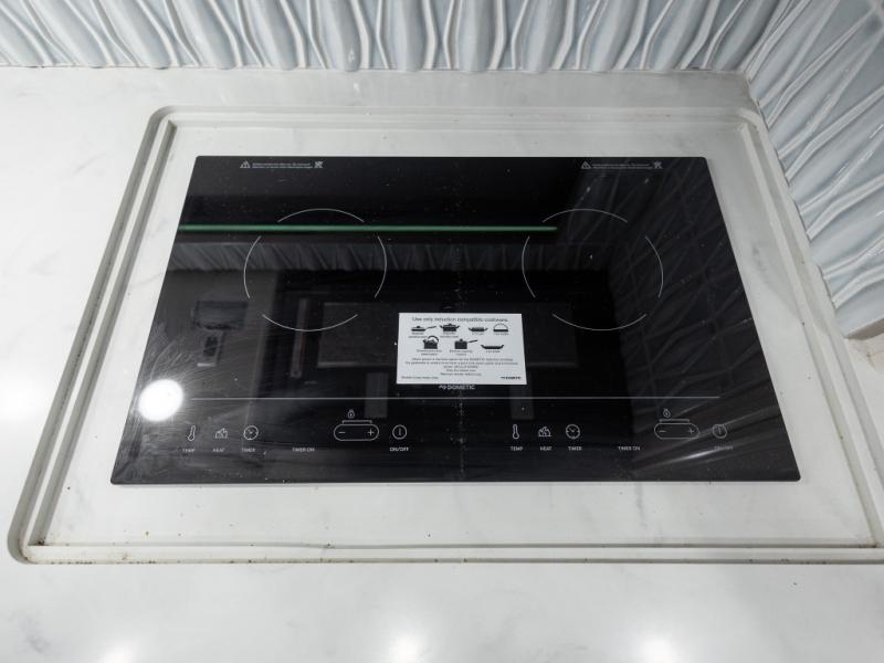 Trips across the country just got sweeter in this four slide out coach that can sleep nine people each night. The rear bunk beds can convert to a wardrobe, and there additional storage here for clothes and belongings. The master bedroom features a LED TV, a side-by-side washer and dryer, and a luxurious Encore Series king bed. This Discovery LXE includes everything you need each day to prepare meals for your crew, including a two burner induction cooktop, a convection microwave, plus a residential refrigerator with ice and water in the door. There are plenty of seating spaces to enjoy, including a U-shaped dinette, a sofa sleeper with a pull-out queen bed, and a sofa with storage!