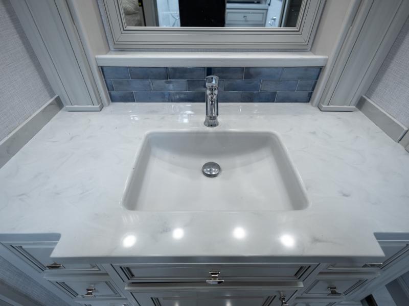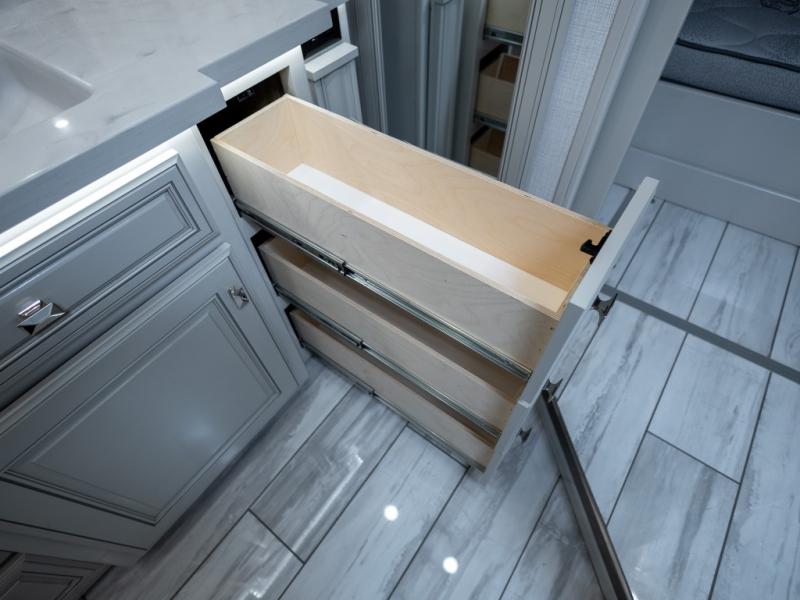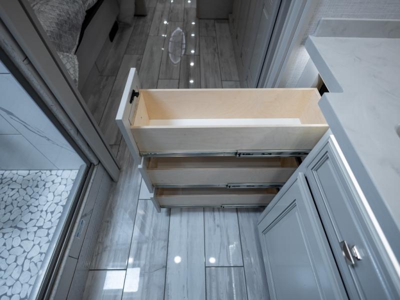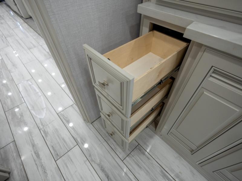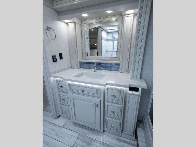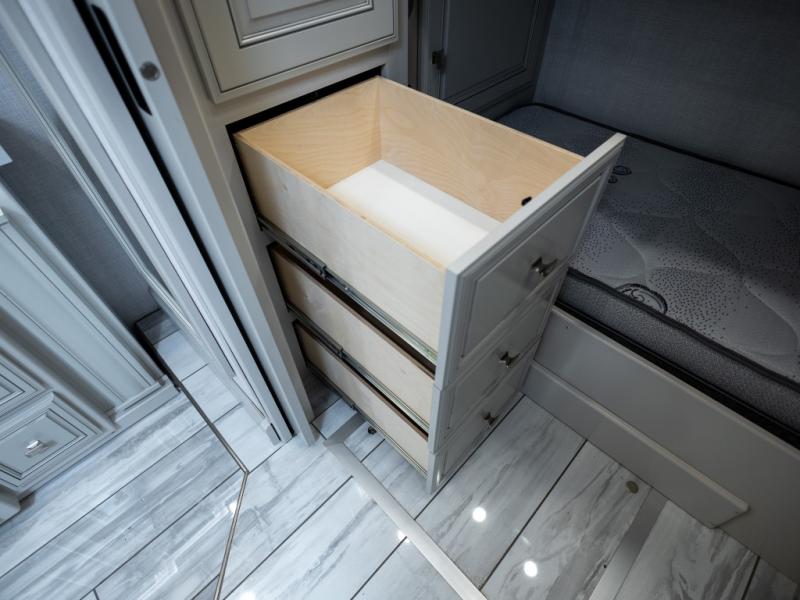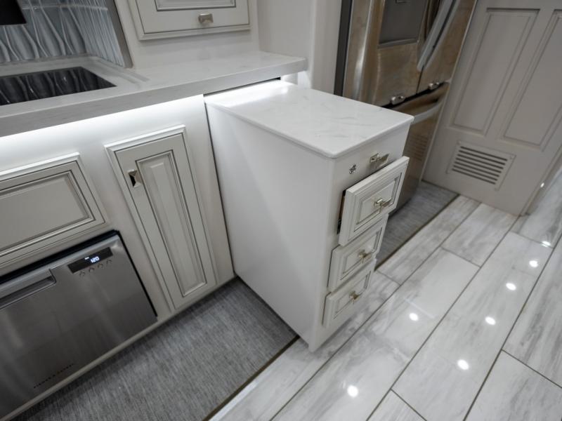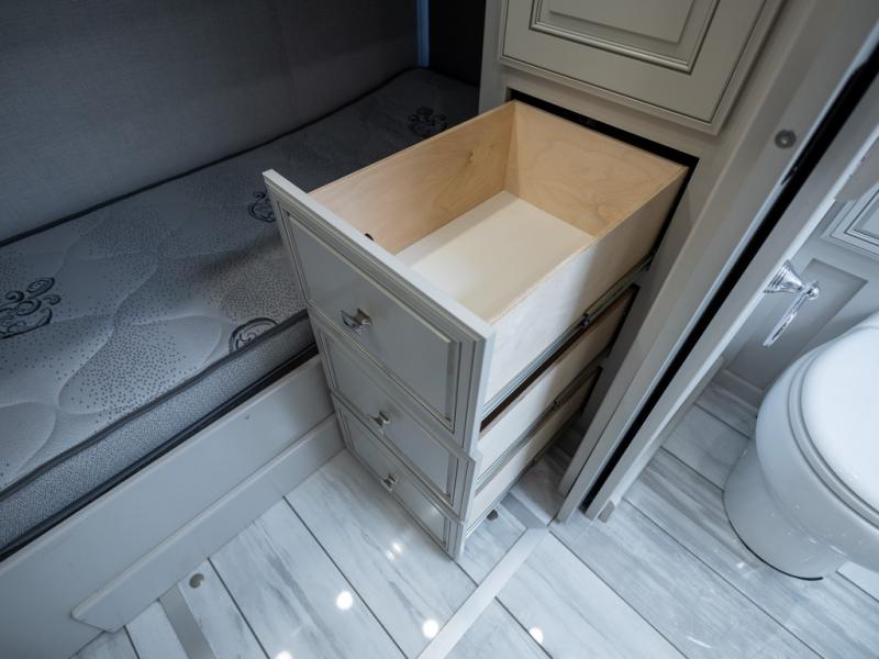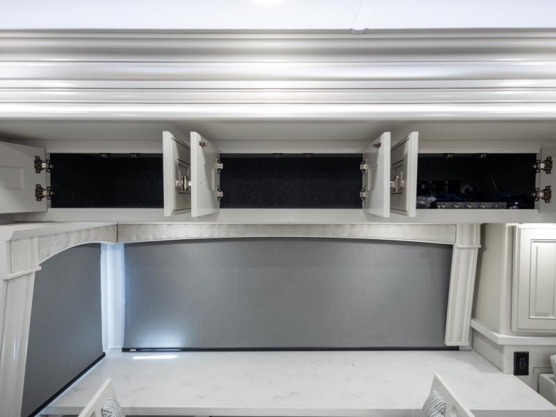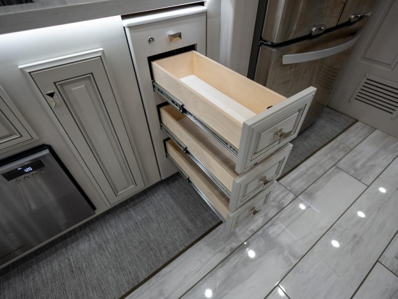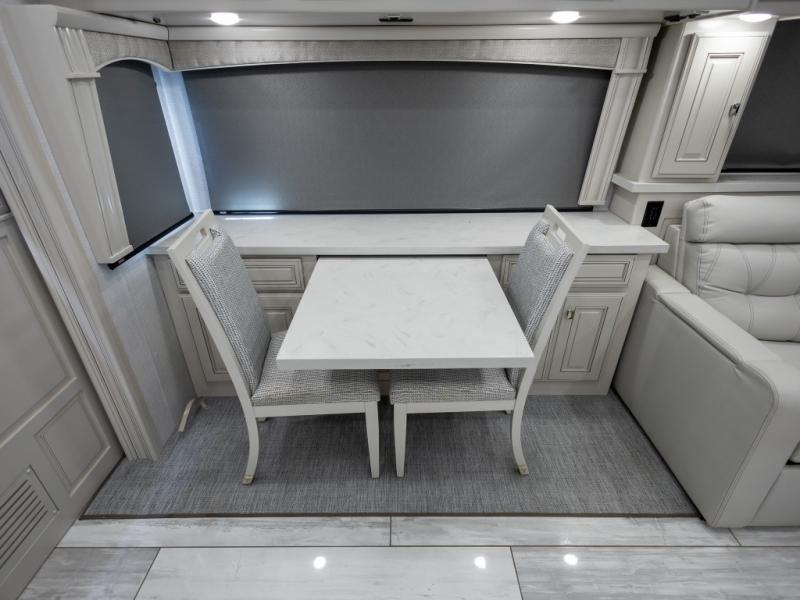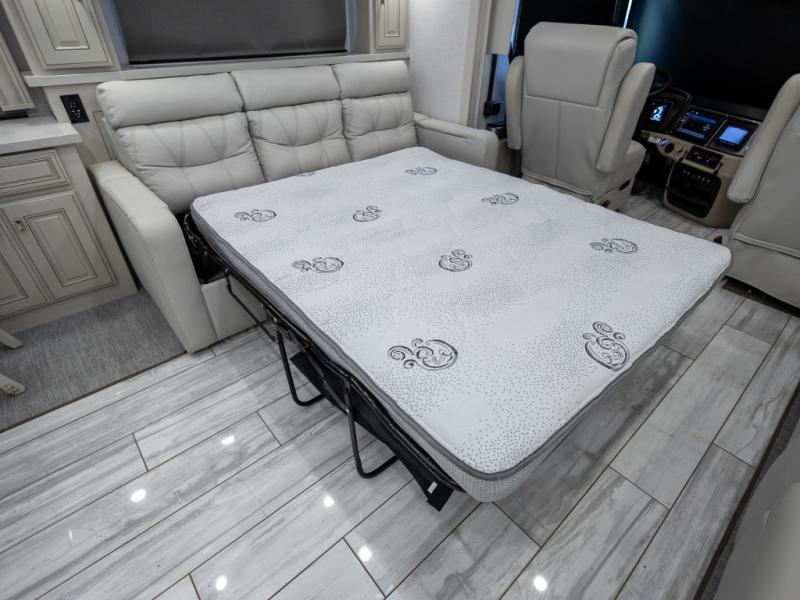 Trips across the country just got sweeter in this four slide out coach that can sleep nine people each night. The rear bunk beds can convert to a wardrobe, and there additional storage here for clothes and belongings. The master bedroom features a LED TV, a side-by-side washer and dryer, and a luxurious Encore Series king bed. This Discovery LXE includes everything you need each day to prepare meals for your crew, including a two burner induction cooktop, a convection microwave, plus a residential refrigerator with ice and water in the door. There are plenty of seating spaces to enjoy, including a U-shaped dinette, a sofa sleeper with a pull-out queen bed, and a sofa with storage!