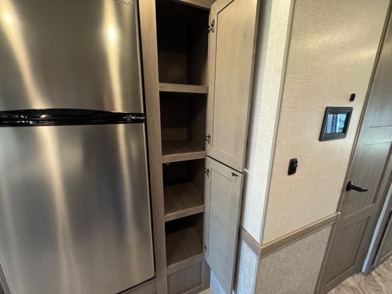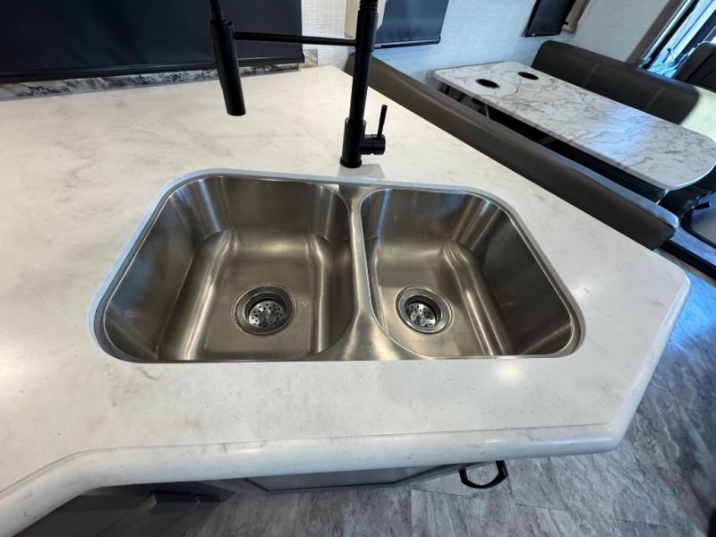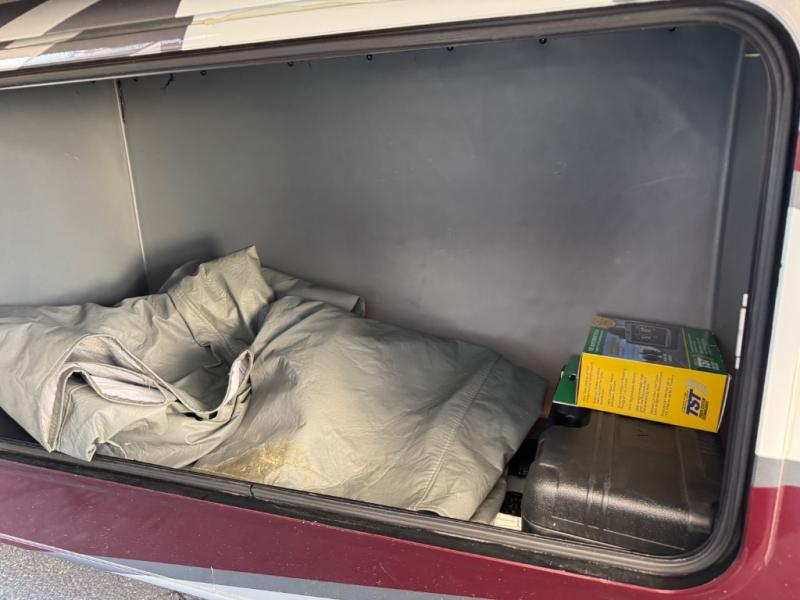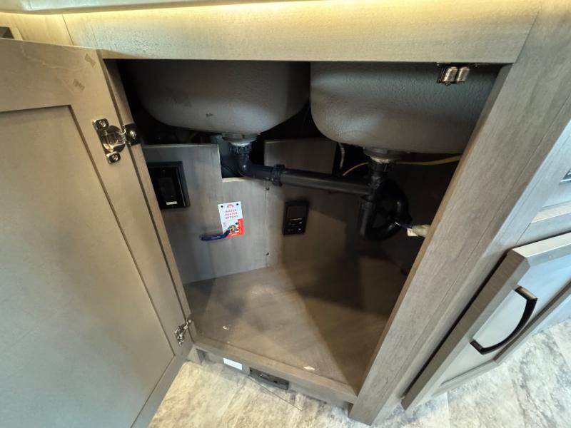 Bunks for everyone in this Fleetwood Flex Class A motorhome! Two 28" x 73" bunk beds are tucked away behind sliding barn doors, while the Hide-A-Loft electric drop down bed provides additional sleeping space over the cab. Outside there's a convenient exterior kitchen complete with refrigerator, microwave, sink, and storage for cooking up snacks to eat while you watch the exterior LED TV. You will also enjoy added space throughout thanks to the full-wall slide!