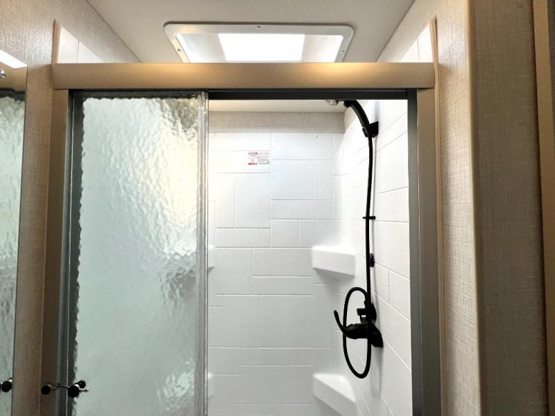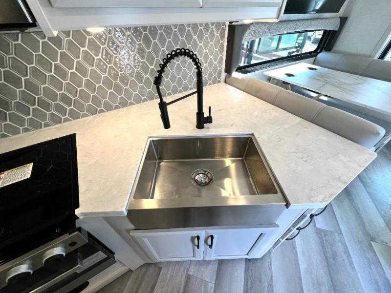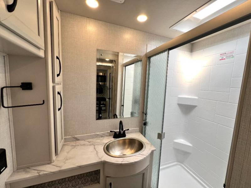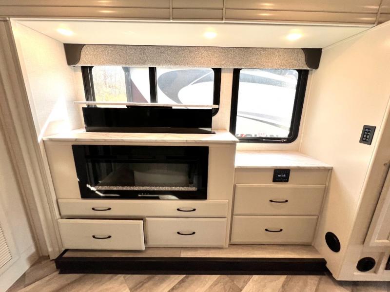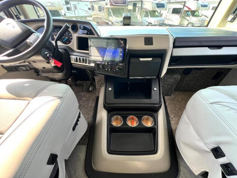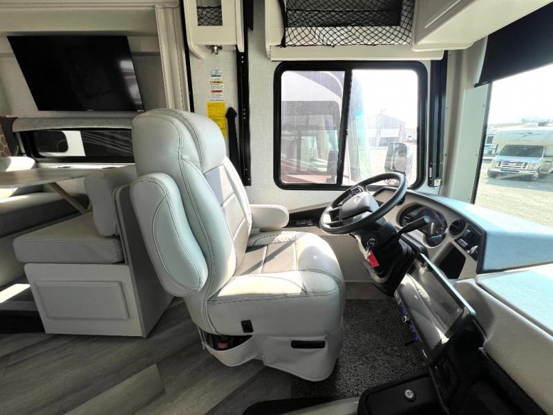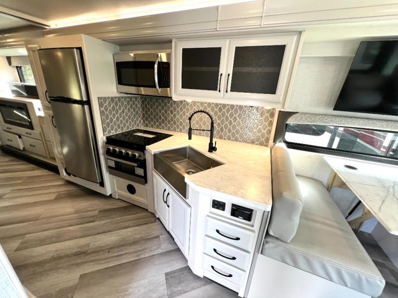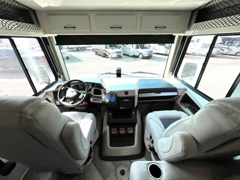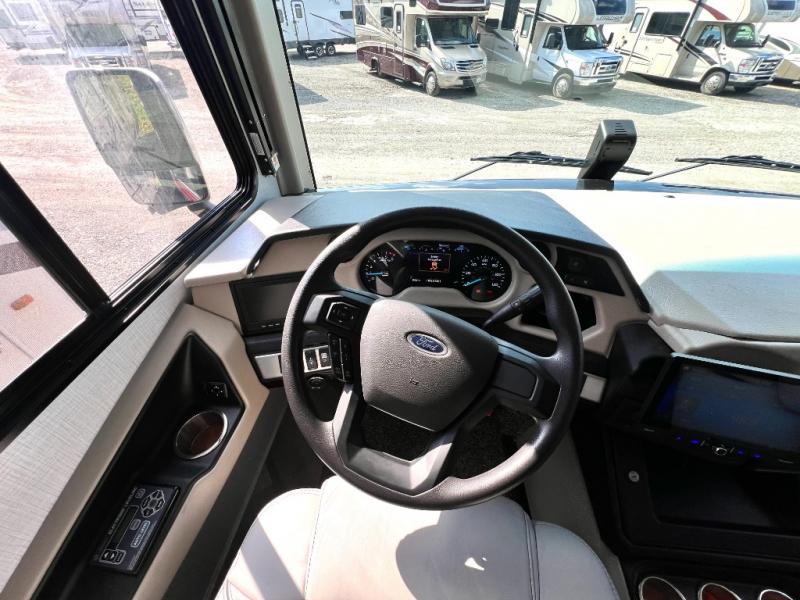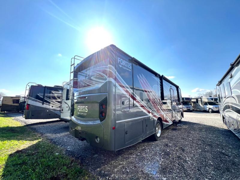 The Fleetwood Fortis Class A gas motorhome is a powerhouse of luxury and convenience, and it also is quite literally a powerhouse with its Ford 7.3L V8 350HP engine with 468 LB/FT of torque. The construction includes a Dryseal edge coating for all ceilings, walls, and floor, and the Powerlock System 2 has interlocking walls to the roof for stability. Automatic hydraulic leveling jacks make the set-up process easier, and the cab has excellent features, like a 9" stereo with AM/FM/Bluetooth, backup camera, reclining/swivel cab seats, driver/passenger center table, and an automotive-style dash with dual monitors and workstation. You will find vinyl tile flooring all throughout the interior, as well as full-extension drawer guides with latches, coordinating window treatments, and energy-efficient LED flush-mount ceiling lighting.