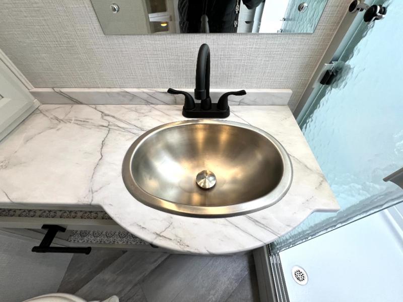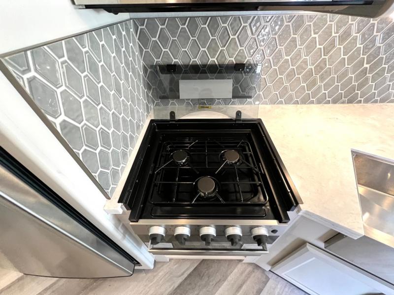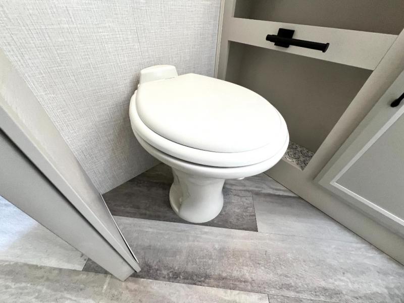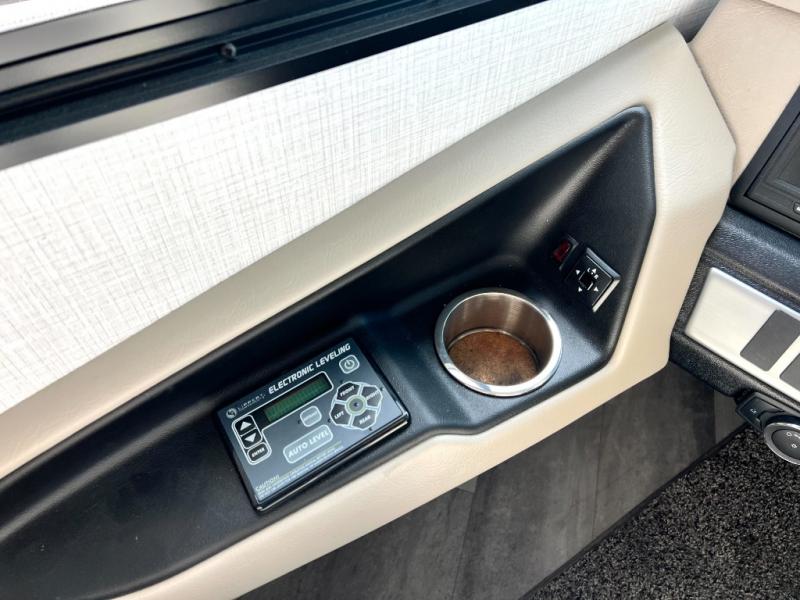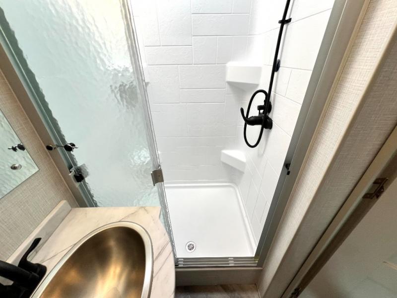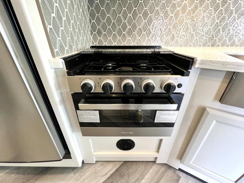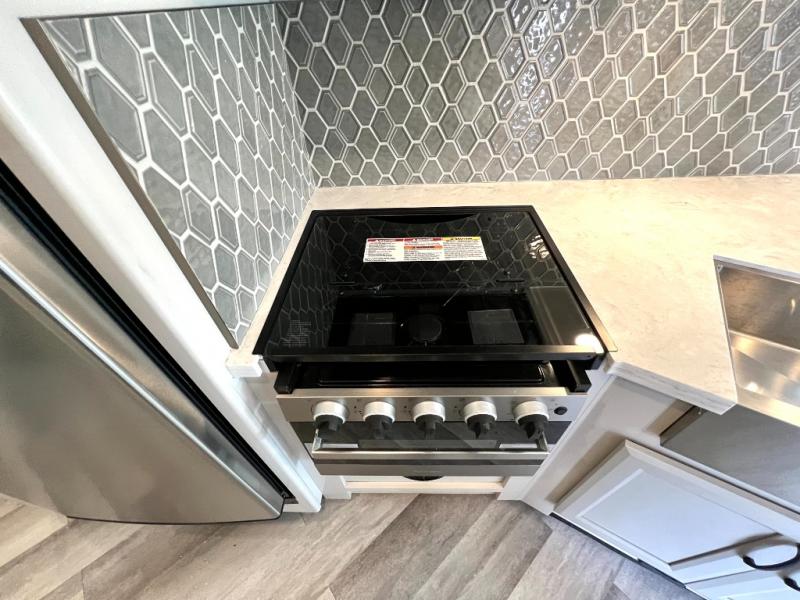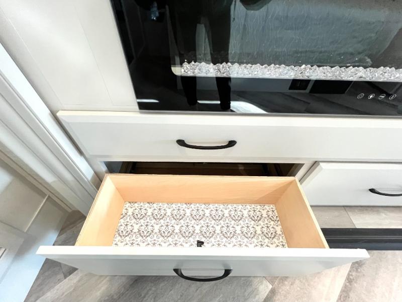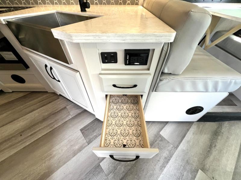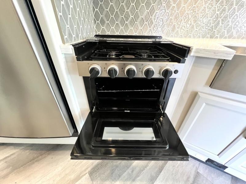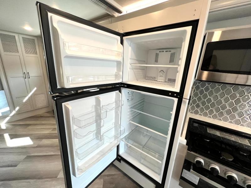 The Fleetwood Fortis Class A gas motorhome is a powerhouse of luxury and convenience, and it also is quite literally a powerhouse with its Ford 7.3L V8 350HP engine with 468 LB/FT of torque. The construction includes a Dryseal edge coating for all ceilings, walls, and floor, and the Powerlock System 2 has interlocking walls to the roof for stability. Automatic hydraulic leveling jacks make the set-up process easier, and the cab has excellent features, like a 9" stereo with AM/FM/Bluetooth, backup camera, reclining/swivel cab seats, driver/passenger center table, and an automotive-style dash with dual monitors and workstation. You will find vinyl tile flooring all throughout the interior, as well as full-extension drawer guides with latches, coordinating window treatments, and energy-efficient LED flush-mount ceiling lighting.