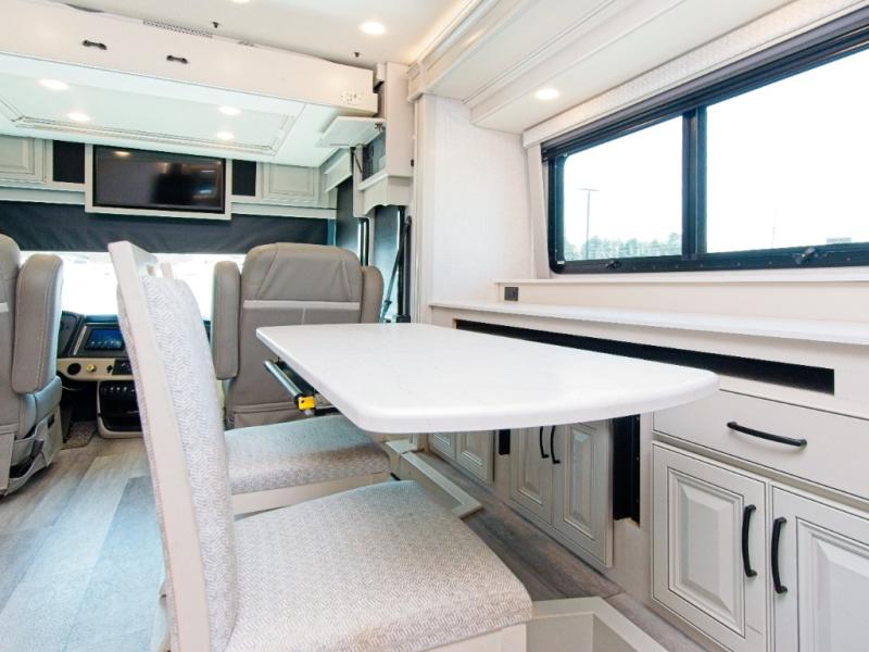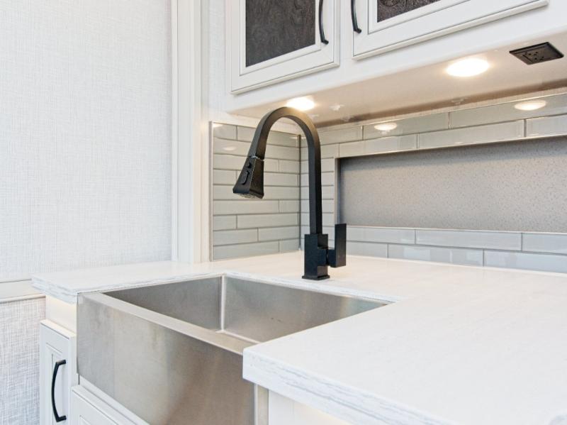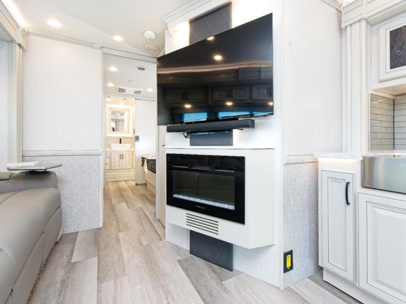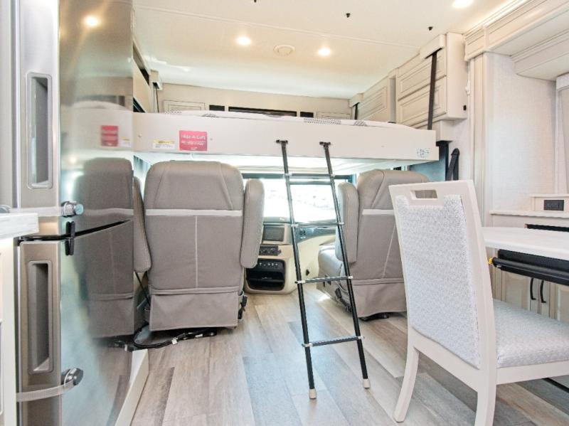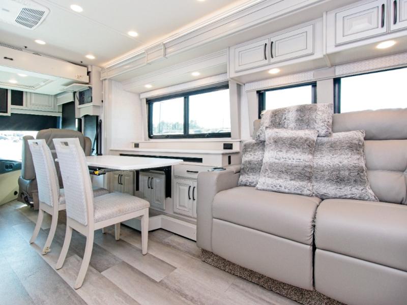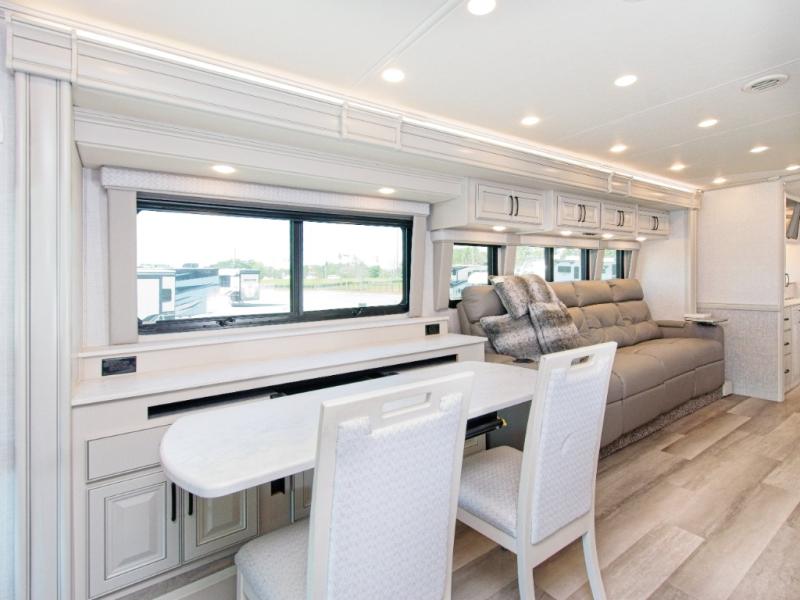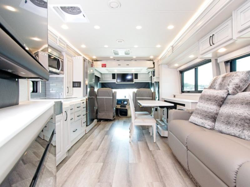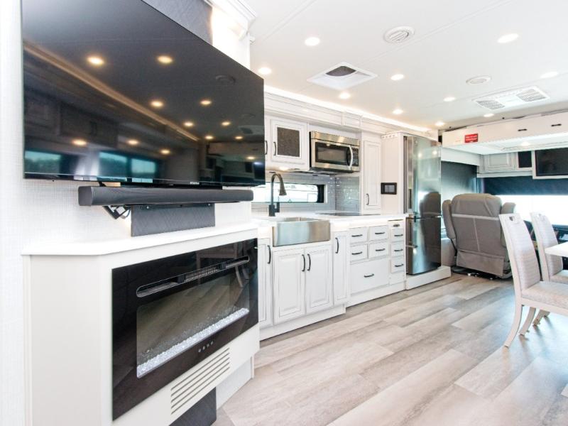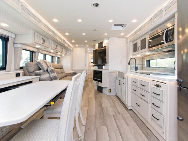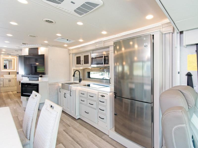 The fully equipped kitchen includes a convection microwave, residential refrigerator, and plenty of storage, allowing you to cook your favorite meals on the road.