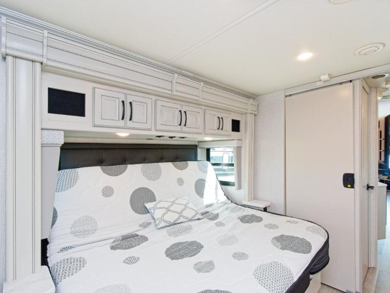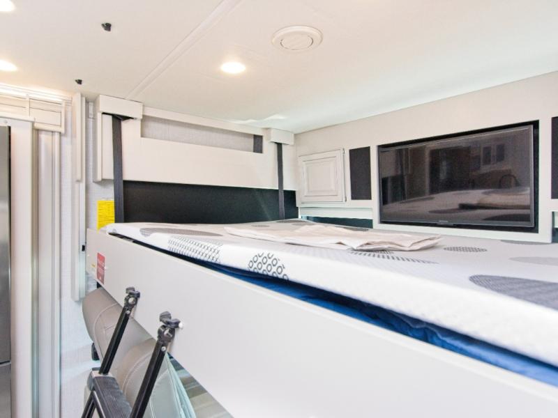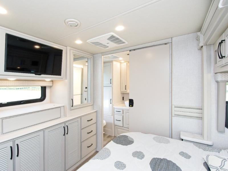 Unwind in the private master suite featuring a walk-around Encore Series king bed, dual wardrobes, dressers, and a mounted LED TV. The rear full bath includes an oversized 50" x 28" shower with built-in seat, delivering a true residential spa feel.