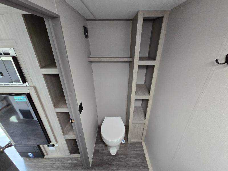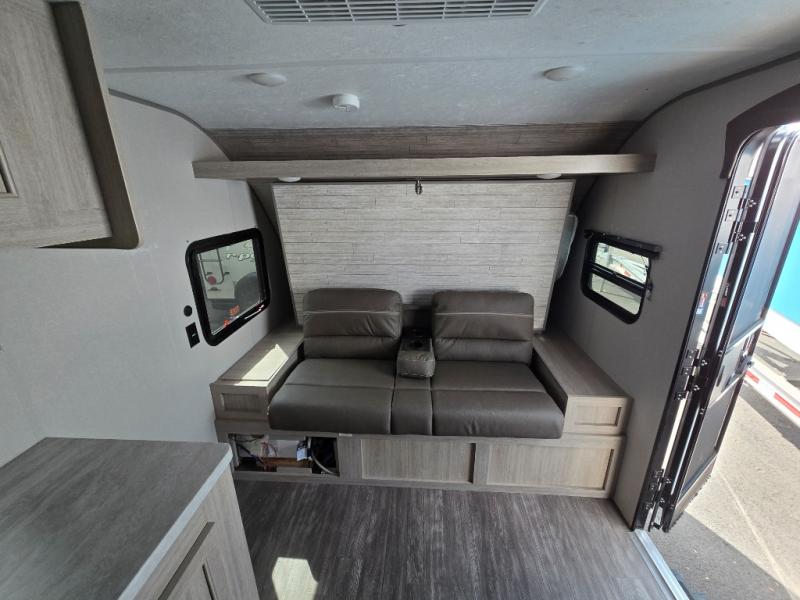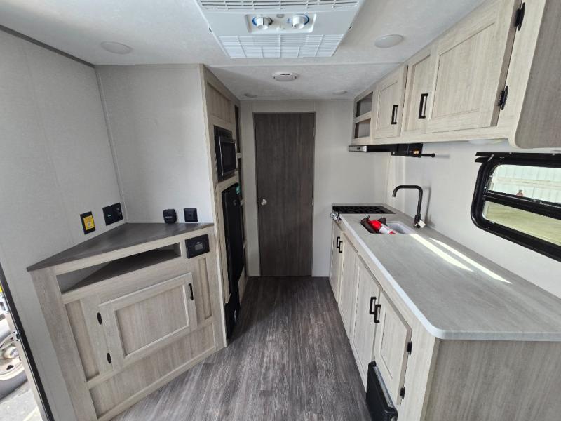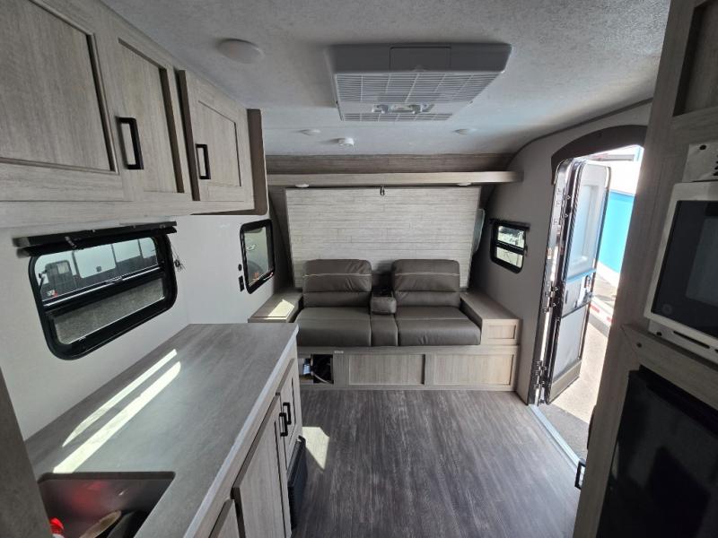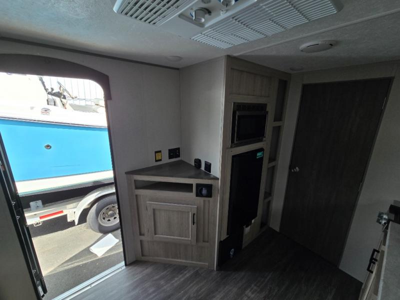 This value price point Aurora Light allows you versatility as you camp! You can sleep comfortably each night on the Murphy bed up front, then fold it away in the morning to relax on the sofa. There are dual nightstands for your things, plus overhead storage. This Aurora kitchen includes a 12V 3.3 cu. ft. refrigerator, a two burner cooktop, plus a microwave oven to easily make meals each day, and the full rear bath will come in handy after a day at the lake. After dinner, relax on the sofa, or head outdoors to relax under the 10' awning!