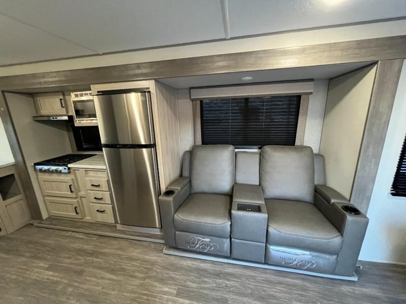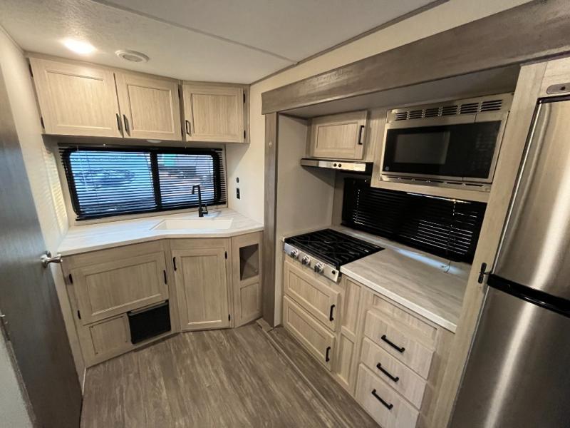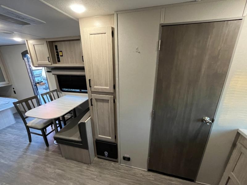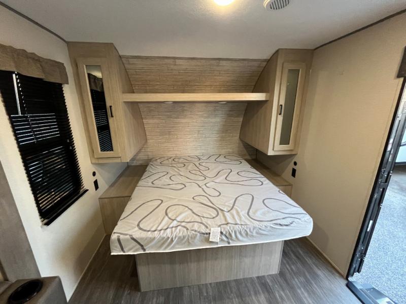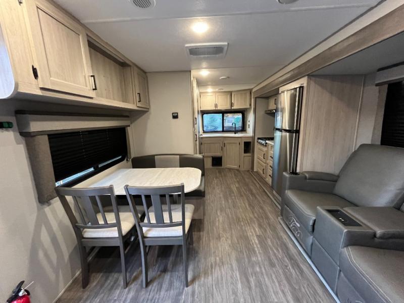 The chef will love cooking in the rear corner kitchen of this travel trailer! You will feel right at home in the front private bedroom with a 60" x 74" RV queen bed with dual bedside wardrobes and an overhead shelf for your personal items. There is a dinette with one bench seat and two chairs just to the left of the entry door for dining, and there is a TV mount above plus overhead cabinets for storage. Opposite, a slide out featuring a 68" theater seat, plus the kitchen appliances. Stay clean and fresh with the rear corner bath including a 36" x 30" shower featuring a skylight above for natural lighting as you get ready each morning. The 18' electric awning has multicolor lights for you to choose your favorite color as you enjoy an evening outside beneath it with family and friends. A nice pass-through storage compartment will hold your camp chairs and outdoor games, plus more.