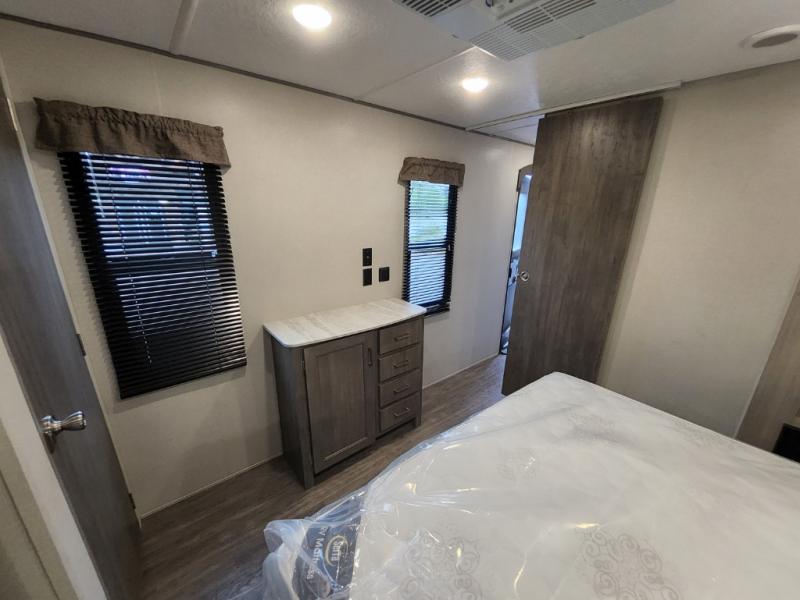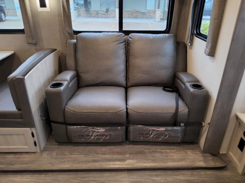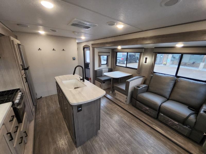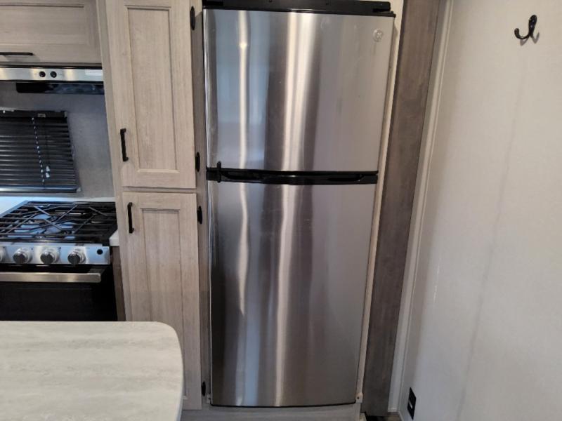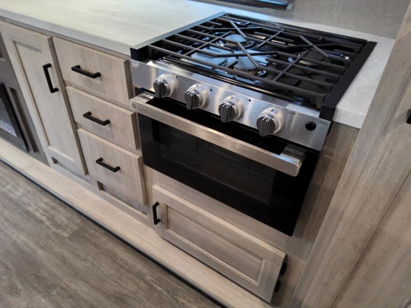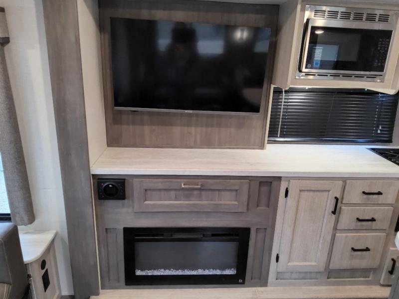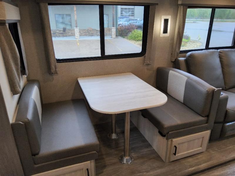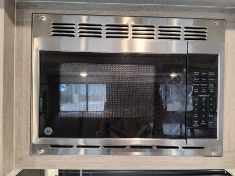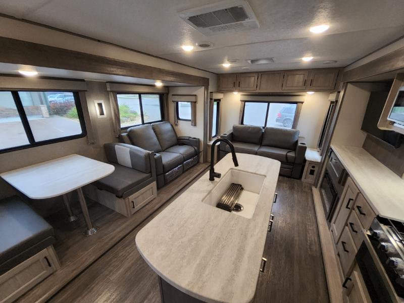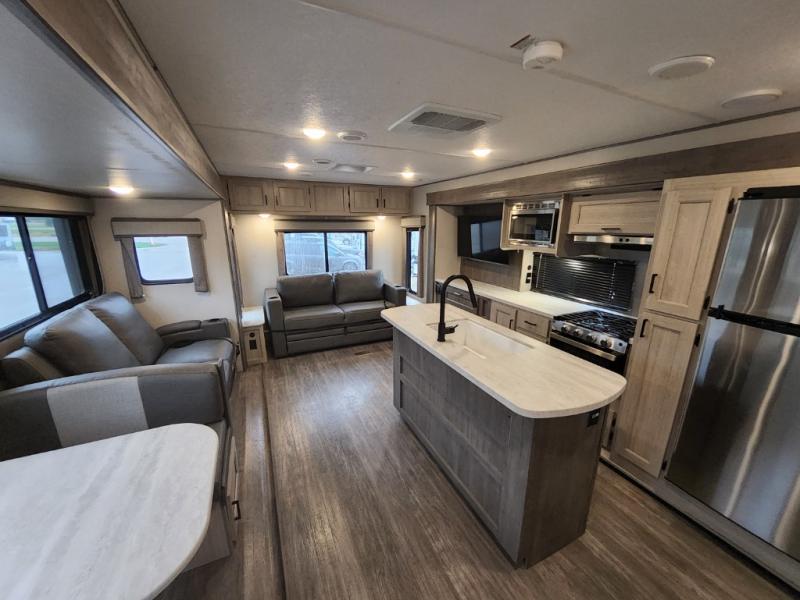 This travel trailer will feel a little more like home with its front private bedroom that includes a 60" x 74" queen bed, plus two closets for storage. And one of the closets includes washer and dryer prep if you choose that option. The rear living area will be a favorite hangout spot with its 68" sofa, theater seating, and entertainment center, plus there is a booth dinette for dining or game night. A kitchen island comes standard, along with a 12V 10.7 cu. ft. refrigerator, a three burner cooktop, plus a microwave oven; everything you need to make home-cooked meals!