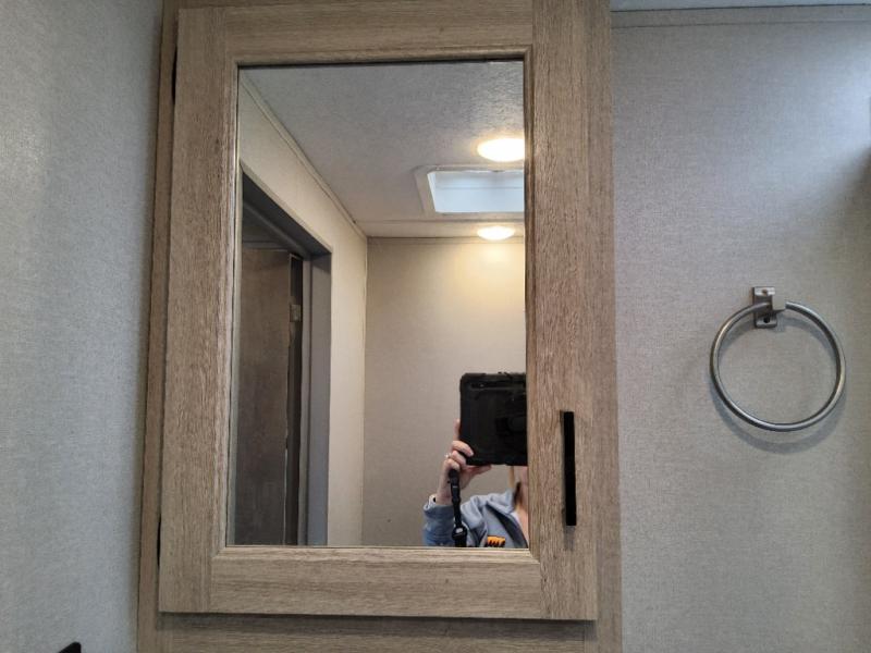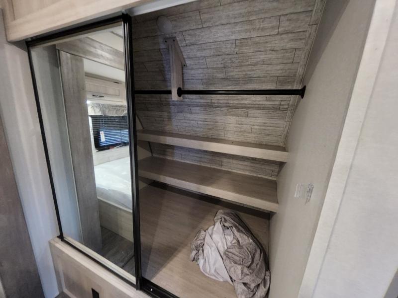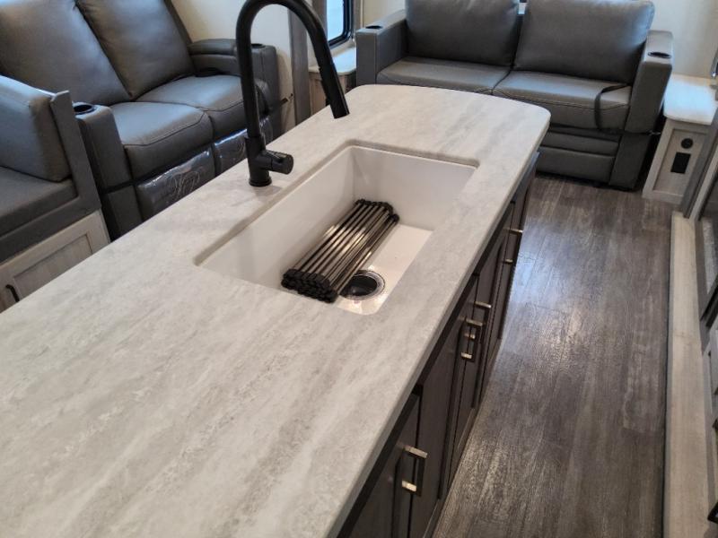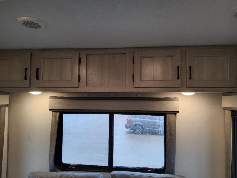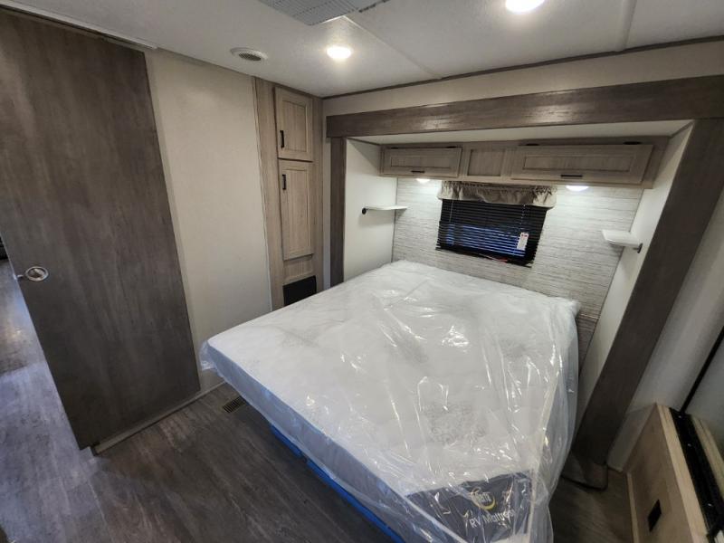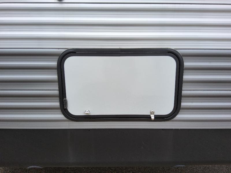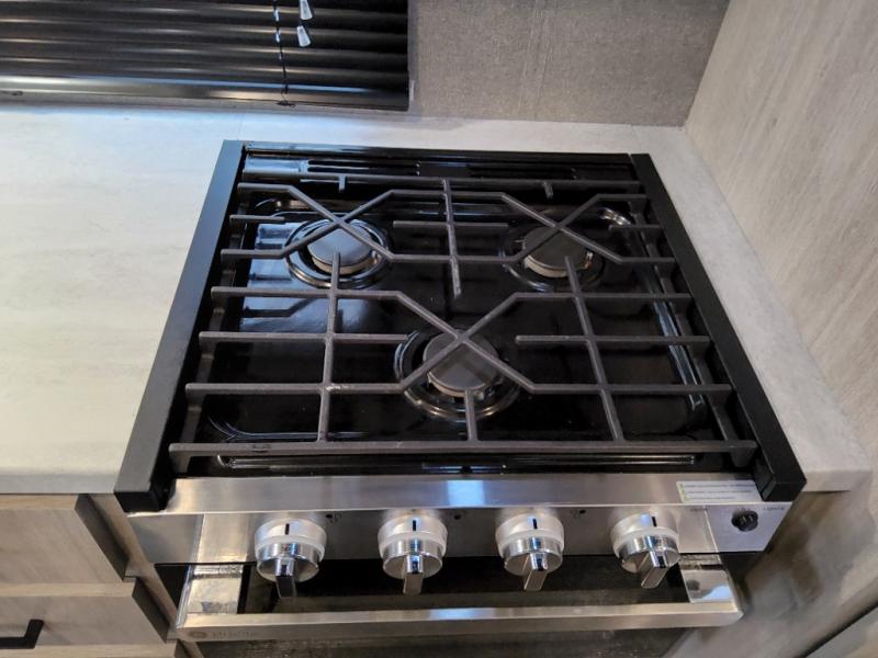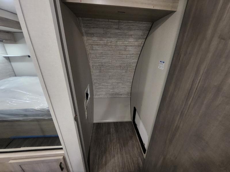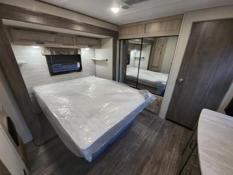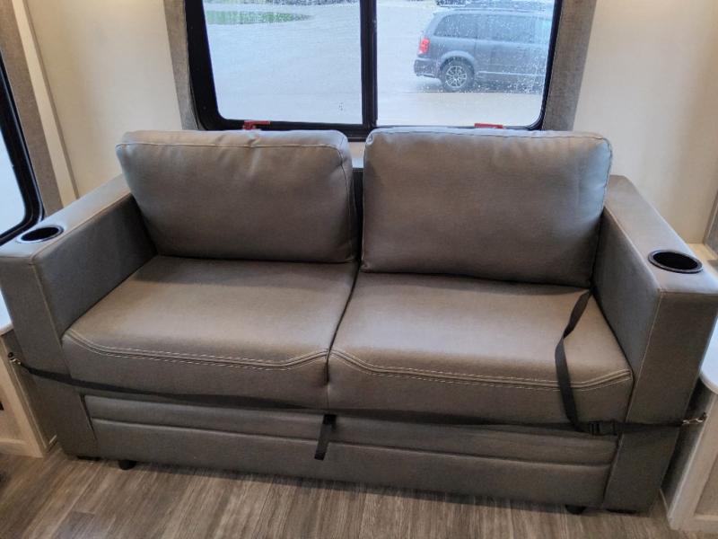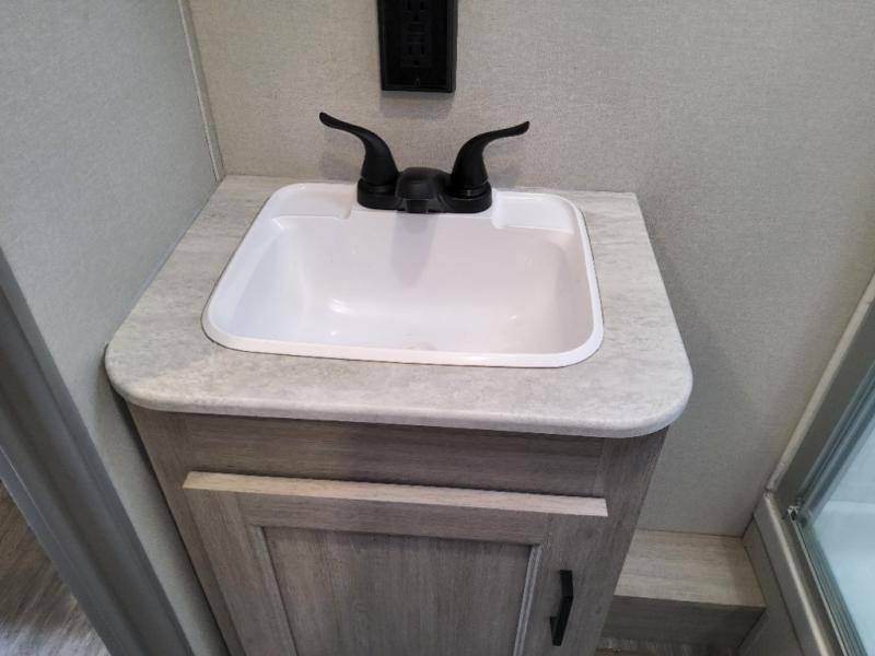 This travel trailer will feel a little more like home with its front private bedroom that includes a 60" x 74" queen bed, plus two closets for storage. And one of the closets includes washer and dryer prep if you choose that option. The rear living area will be a favorite hangout spot with its 68" sofa, theater seating, and entertainment center, plus there is a booth dinette for dining or game night. A kitchen island comes standard, along with a 12V 10.7 cu. ft. refrigerator, a three burner cooktop, plus a microwave oven; everything you need to make home-cooked meals!
