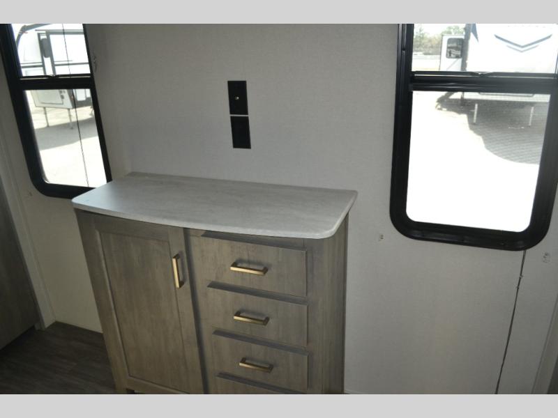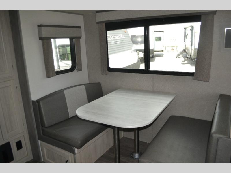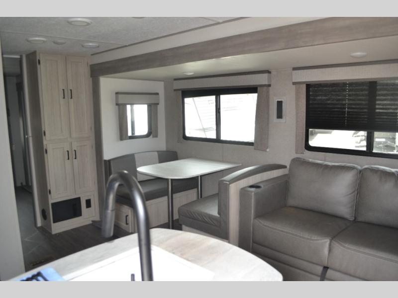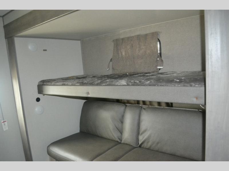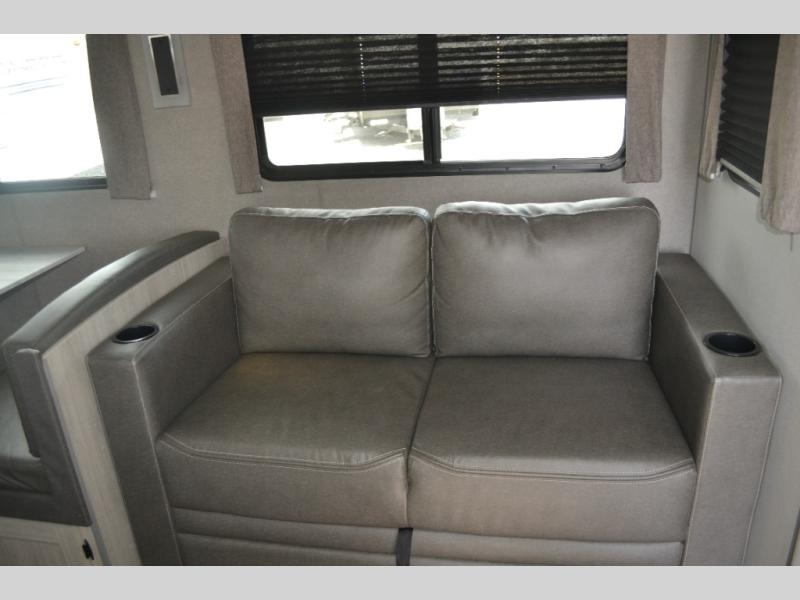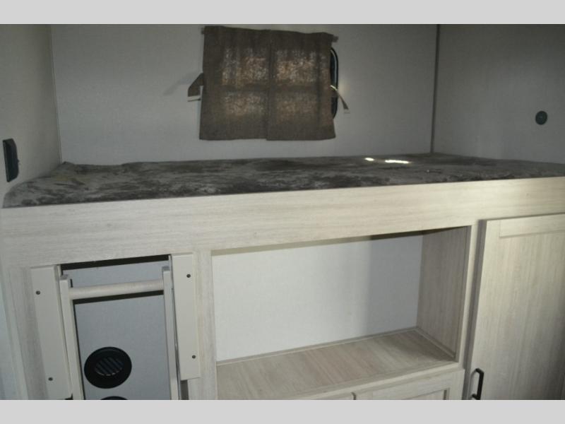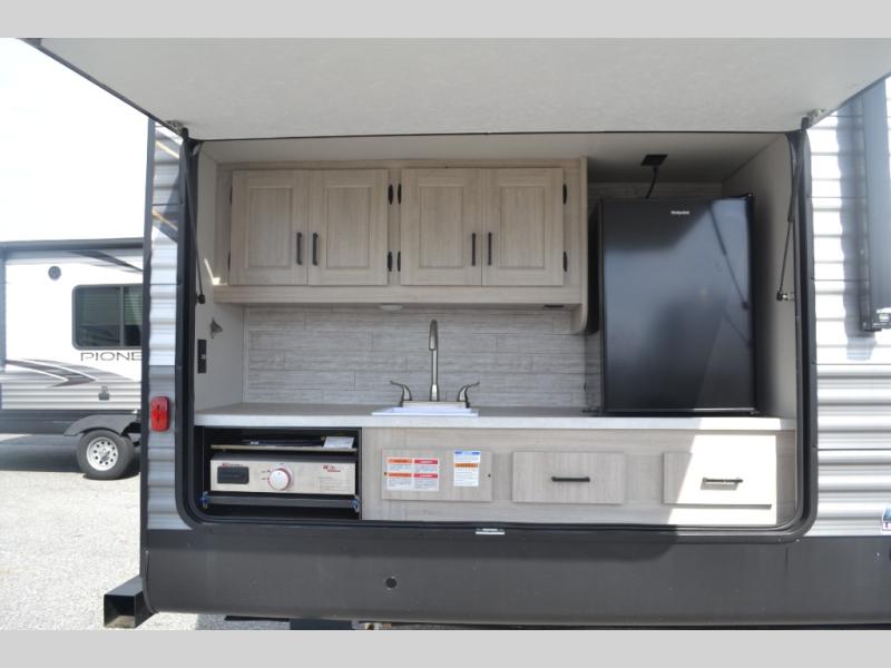 The whole gang will have a good time camping in this travel trailer! There is a place for everyone to sleep between the rear private bunkhouse with a 40" x 74" loft bed and a flip up bunk bed above a jackknife sofa, and the front private bedroom has a 60" x 74" queen bed slide, plus the booth dinette and 60" sofa in the main living area can provide extra sleeping spaces. You could even choose to switch out the bunk and sofa for an optional queen bed instead. The bedroom also has a dresser and a front closet that is big enough for your clothes and an area with washer and dryer prep. The chef can choose to either cook indoors with the three burner cooktop or breathe in some fresh air while cooking at the outside camp kitchen with a refrigerator, a sink, overhead cabinets, and a grill with drawers next to it for your cooking utensils!