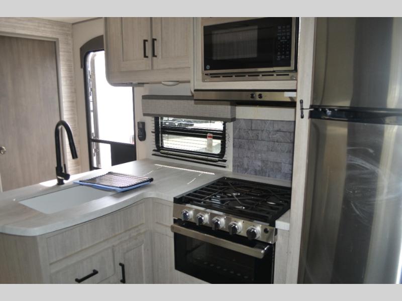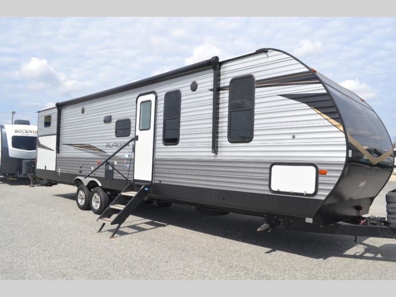 Comfortability, usability, and quality is what you will find in each one of these Forest River Aurora travel trailers, toy haulers or destination trailers! They are designed with a superior build and packed full with industry leading, functional, and distinctive standard features. SolidStep entrance steps and a Safe-T rail door assist on main entry door to help you safely enter and exit the unit. The diamond plate rock guard will protect your unit from road debris and the nitrogen filled radial tires, which keep their pressure longer, offer better fuel economy. You will also find upgraded JBL Elite exterior speakers outside, an electric awning with multicolor lights and remote, plus flush mount baggage doors for easy packing. The interiors are beautifully designed with a deep undermount farm style sink, stainless steel appliances, and linoleum flooring throughout which will be easy to clean. Come find your favorite model today!