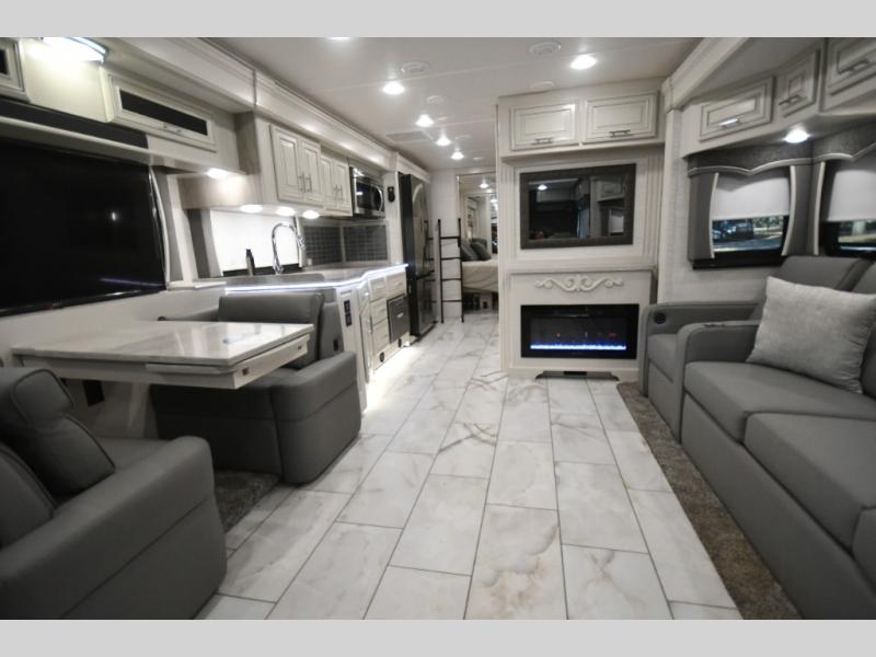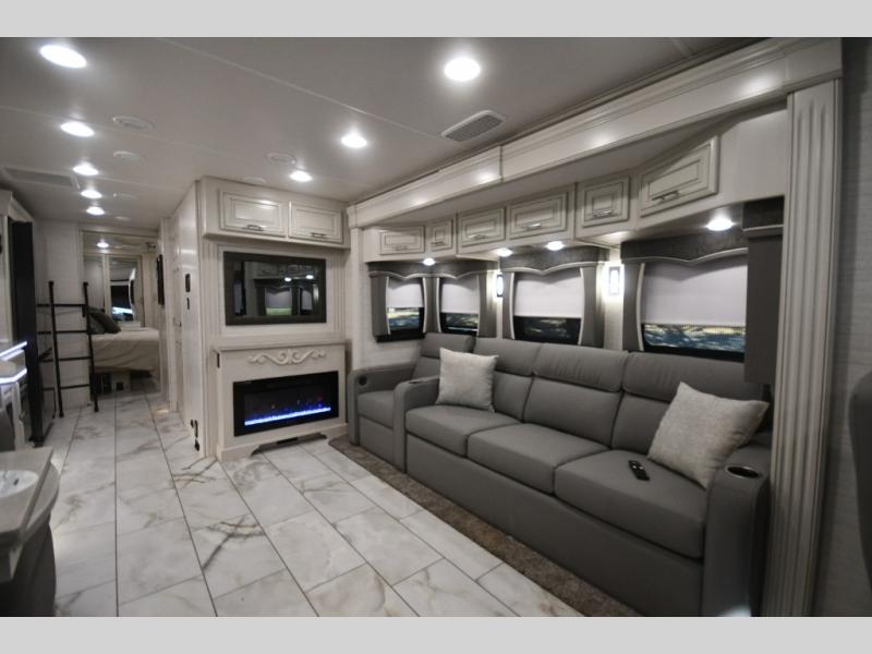 Step inside and discover upscale finishes, polished solid-surface countertops, premium cabinetry, and designer furnishings throughout. The spacious living area features plush seating, a large flat-screen TV, electric fireplace, and expansive windows that fill the coach with natural light.