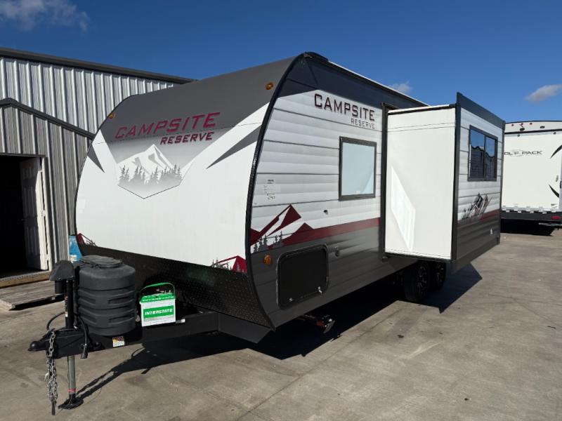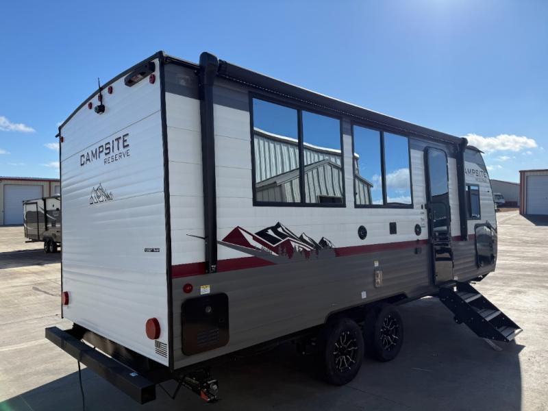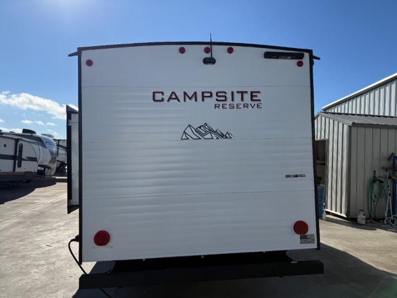 With any Campsite Reserve travel trailer by Forest River, you will enjoy comfort and convenience at every turn! These models feature the most storage in their class, along with the biggest windows in their class plus a mega pass-through storage so nothing gets left behind. Since they are built with a TimberStong UltraCore engineered superstructure, they will last for years to come, and the diamond plate on the front will help protect your unit from rock and debris on the way to your destination. Each model also includes a power awning with LED lights, a 100-watt solar package, and a sleek glass entrance door that will set you apart at the campground. You will love the interior amenities that make camping easier than ever, like the air fryer, Bluetooth radio, pull-out drawer under the dinette, and much more!