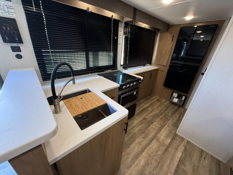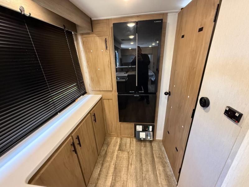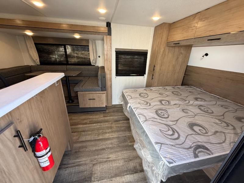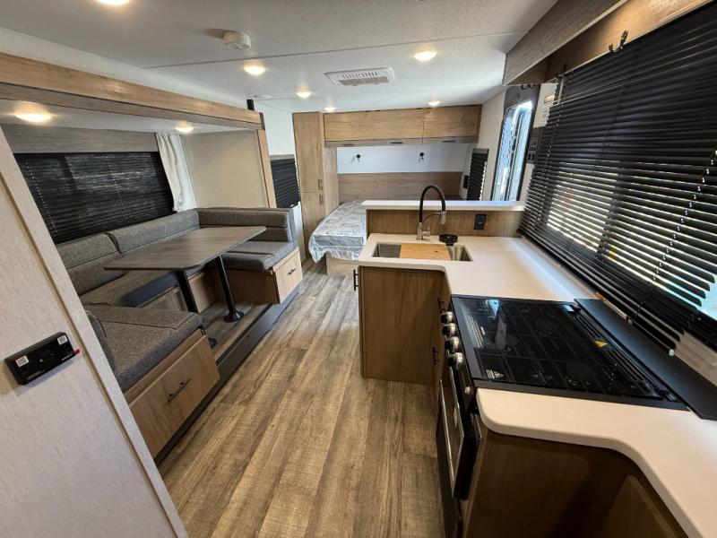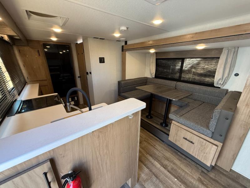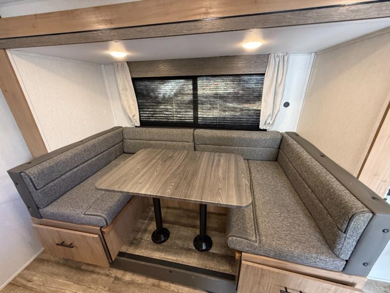Head to the lake, woods, or your favorite secluded camping spot with this travel trailer in tow. You can wake up each morning feeling refreshed after sleeping on the camp king bed, and there is a bedroom wardrobe to keep your clothes wrinkle-free. The full kitchen allows you to cook breakfast and the U-shaped dinette within the slide out provides a place to dine at. There are even panoramic windows for great views as you sip on your coffee. The full bath includes a shower tub with surround, a large bath sink, plus a shower skylight for more standing space and natural light. Get packed for your next adventure now!