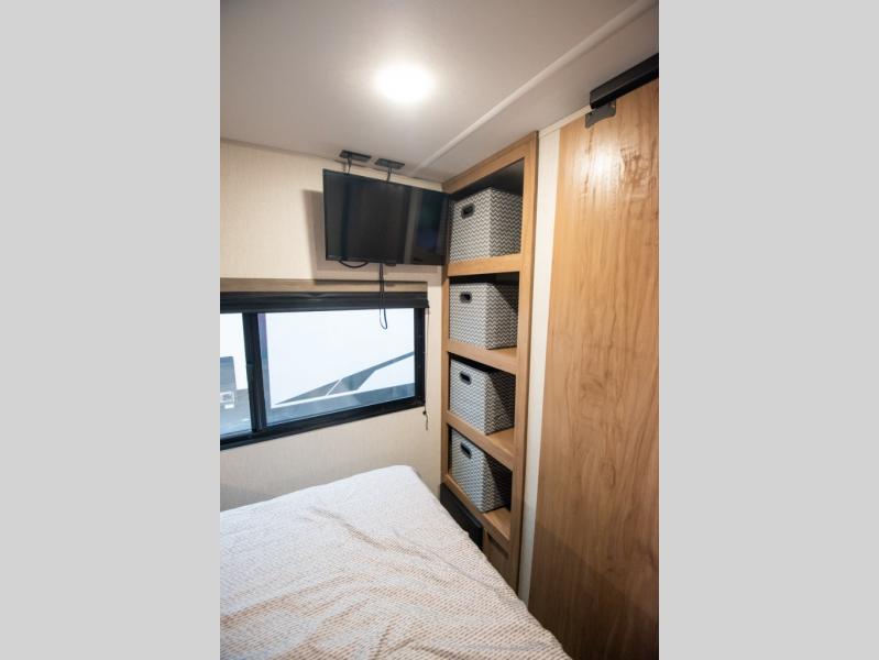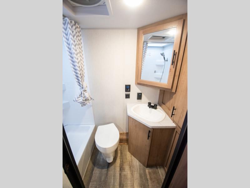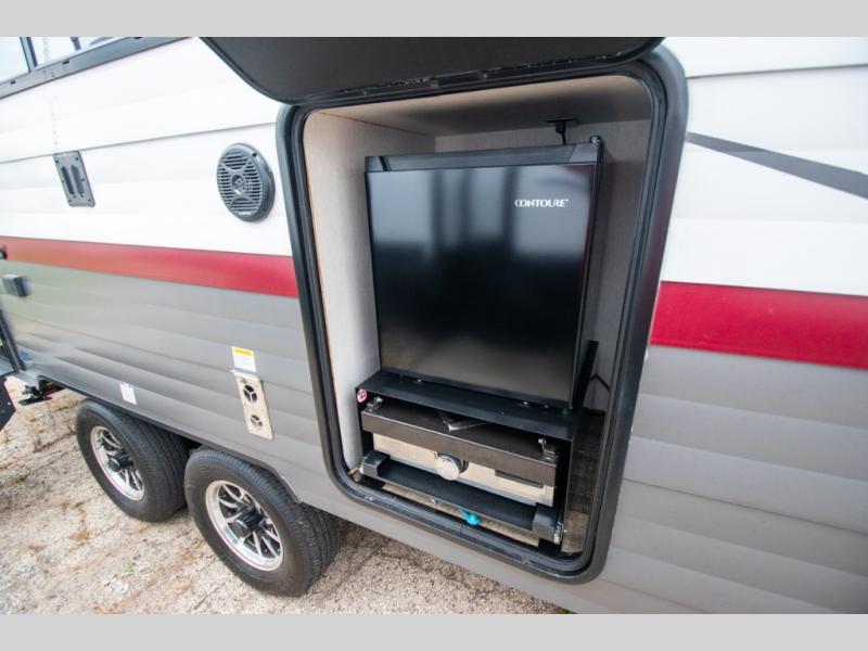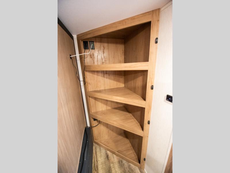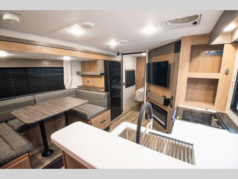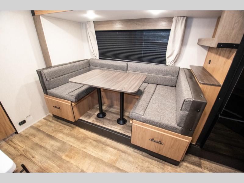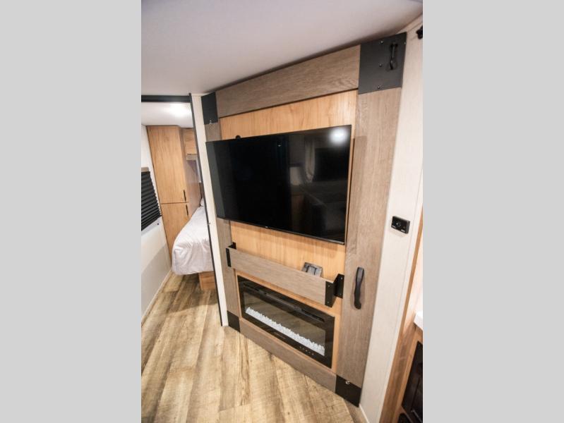 You're going to love this travel trailer with a spacious full rear bath and a front private bedroom. The camp king bed is sure to bring comfort and there is a bedroom TV mount if you want to add entertainment. A U-shaped dinette slide provides more space to move about, and there is an entertainment center with hidden shelves behind it for smart storage solutions. You can cook on the outside kitchen when the weather is nice, and use the indoor kitchen when the weather is raining on your parade!