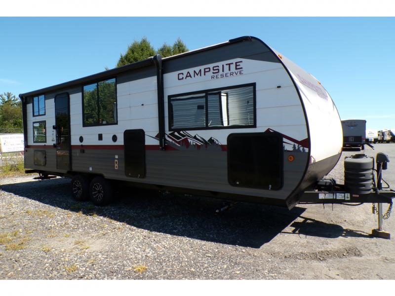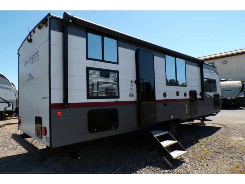 With any Campsite Reserve travel trailer by Forest River, you will enjoy comfort and convenience at every turn! These models feature the most storage in their class, along with the biggest windows in their class plus a mega pass-through storage so nothing gets left behind. Since they are built with a TimberStong UltraCore engineered superstructure, they will last for years to come, and the diamond plate on the front will help protect your unit from rock and debris on the way to your destination. Each model also includes a power awning with LED lights, a 100-watt solar package, and a sleek glass entrance door that will set you apart at the campground. You will love the interior amenities that make camping easier than ever, like the air fryer, Bluetooth radio, pull-out drawer under the dinette, and much more!