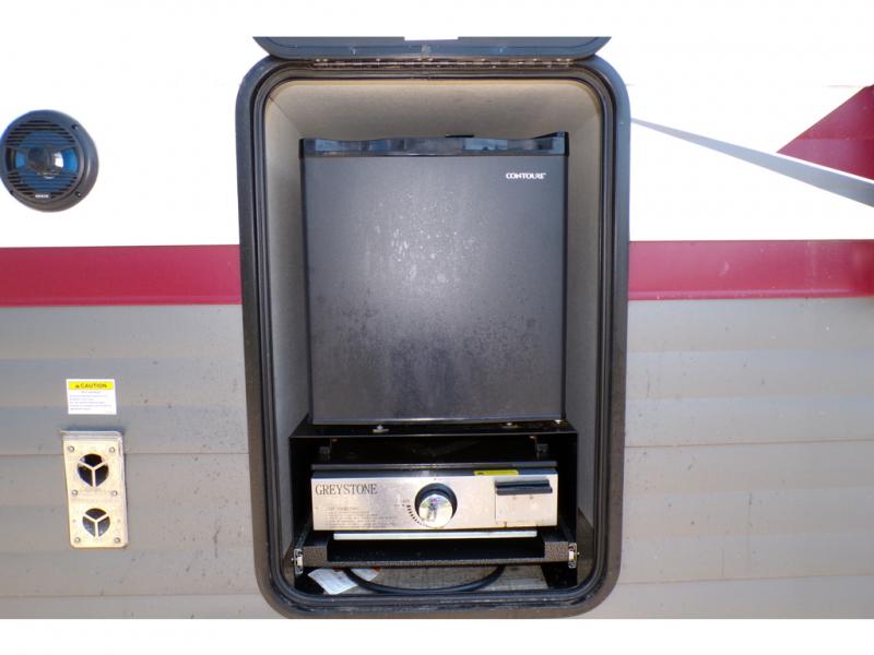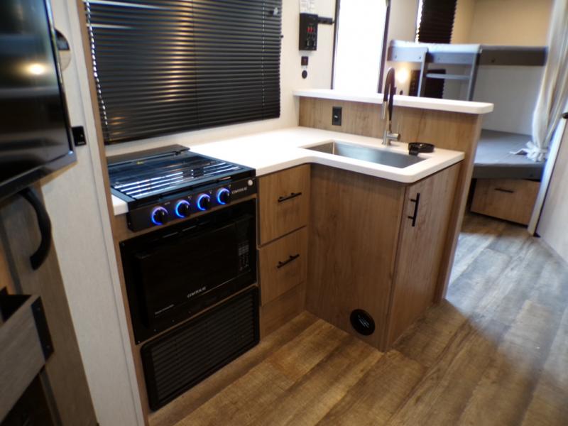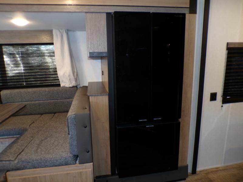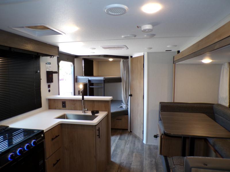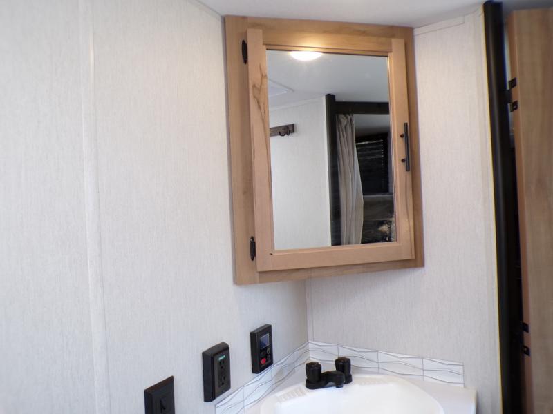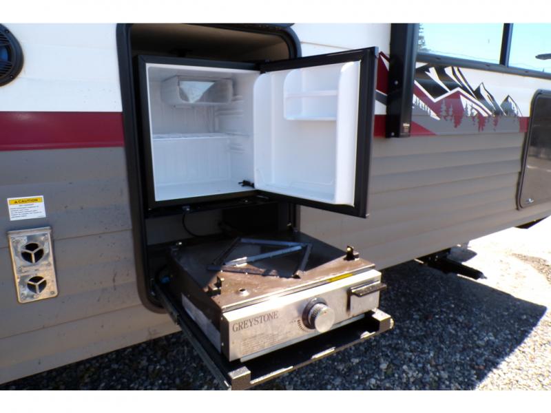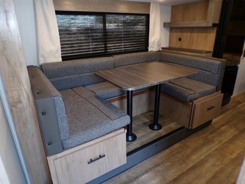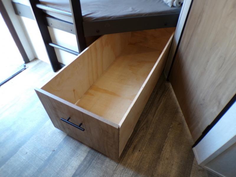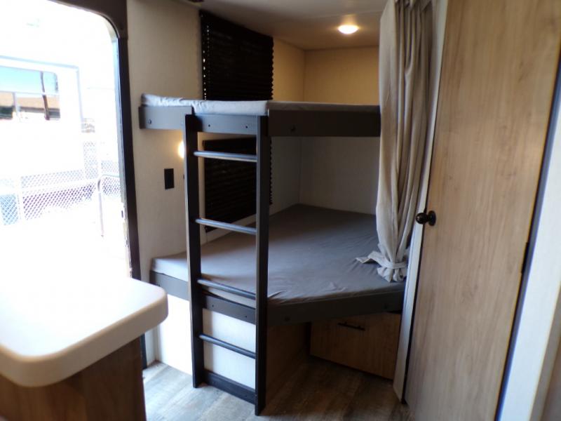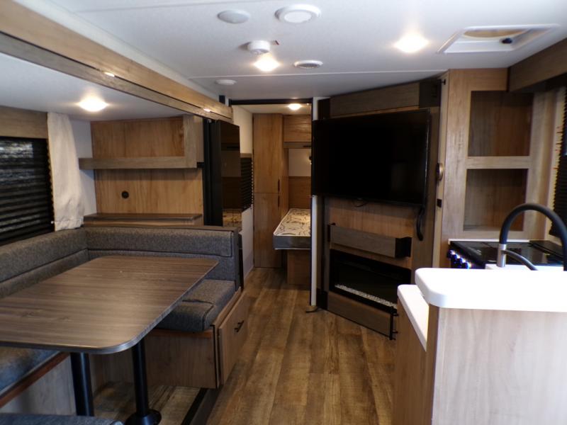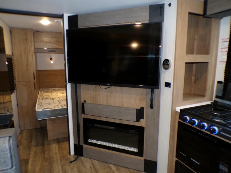 This model resembles the layout of model 23CC, but instead of a full rear bath, you'll enjoy double-size bunks and a full bath in the back of this unit. You will appreciate the extra deep storage under the bunks for your guests' belongings, and there is more storage found throughout for camp necessities. The chef will have their choice to cook at the outside kitchen or stay warm inside by the fireplace. After dinner, everyone can gather around the U-shaped dinette for game night, and the hidden shelves behind the entertainment center will be perfect for books, movies, or snacks! Having your own bedroom with a camp king bed will have you feeling right at home, and you can even bring a television along since there is a TV mount here!