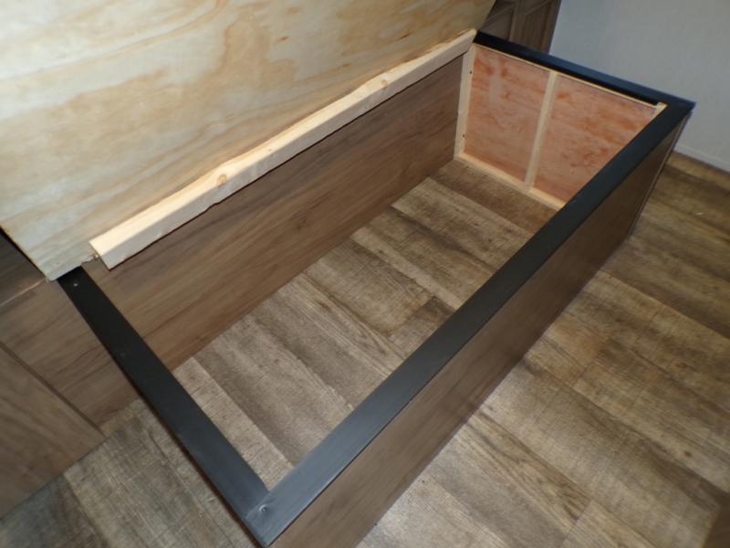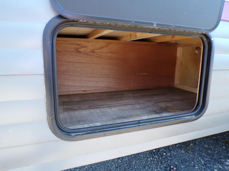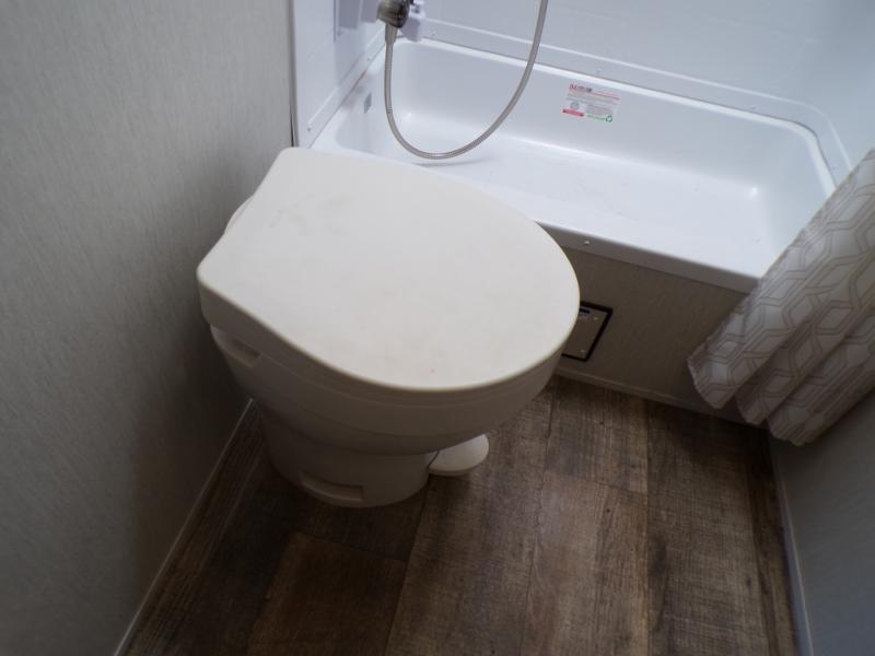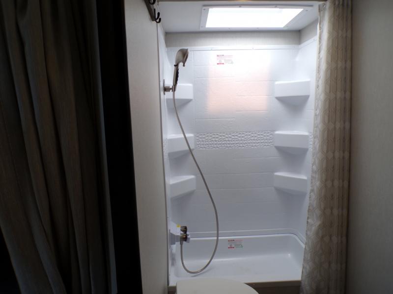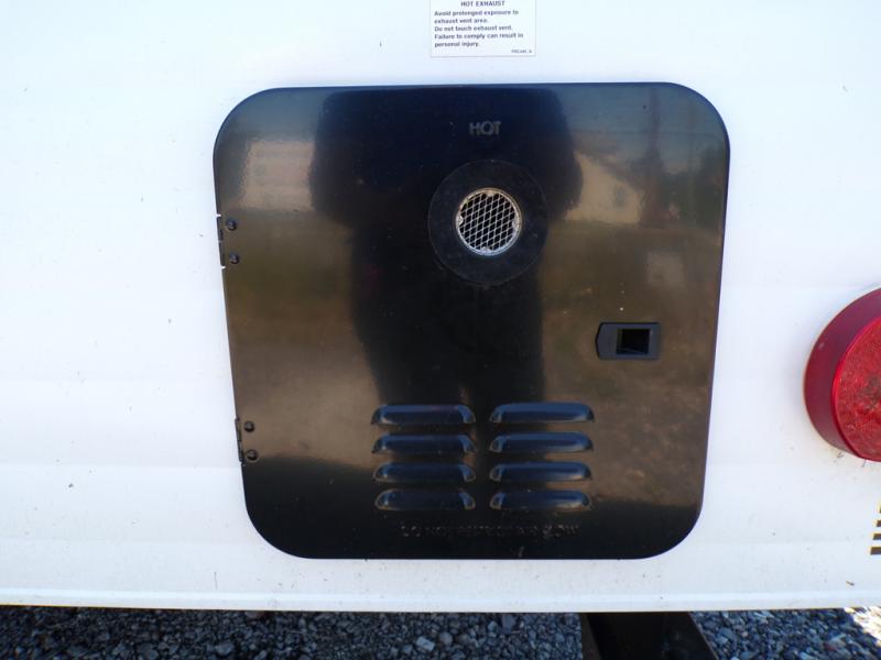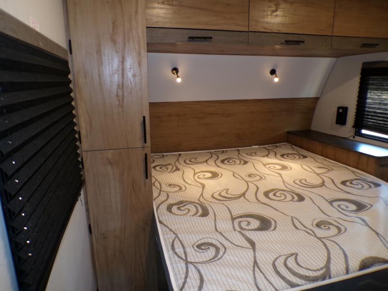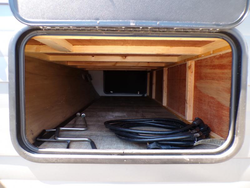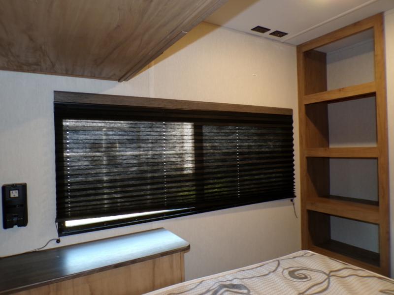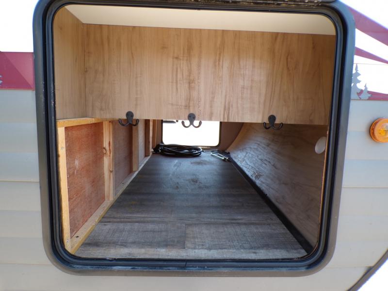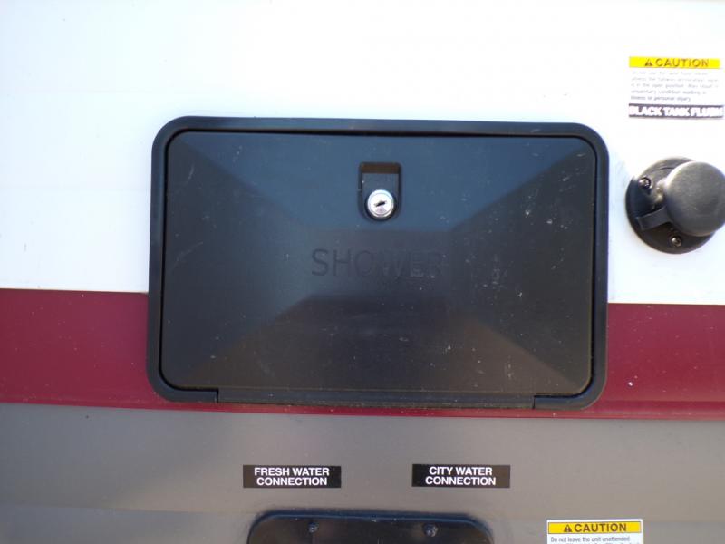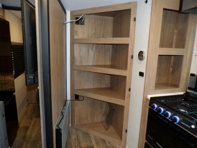 This model resembles the layout of model 23CC, but instead of a full rear bath, you'll enjoy double-size bunks and a full bath in the back of this unit. You will appreciate the extra deep storage under the bunks for your guests' belongings, and there is more storage found throughout for camp necessities. The chef will have their choice to cook at the outside kitchen or stay warm inside by the fireplace. After dinner, everyone can gather around the U-shaped dinette for game night, and the hidden shelves behind the entertainment center will be perfect for books, movies, or snacks! Having your own bedroom with a camp king bed will have you feeling right at home, and you can even bring a television along since there is a TV mount here!