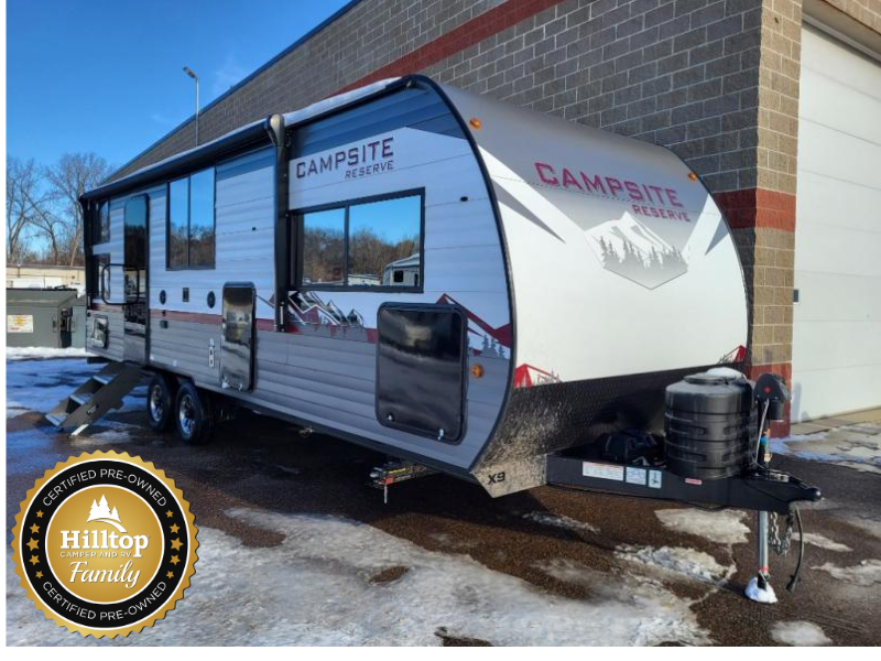 With any Campsite Reserve travel trailer by Forest River, you will enjoy comfort and convenience at every turn! These models feature the most storage in their class, along with the biggest windows in their class plus a mega pass-through storage so nothing gets left behind. Since they are built with a TimberStong UltraCore engineered superstructure, they will last for years to come, and the diamond plate on the front will help protect your unit from rock and debris on the way to your destination. Each model also includes a power awning with LED lights, a 100-watt solar package, and a sleek glass entrance door that will set you apart at the campground. You will love the interior amenities that make camping easier than ever, like the air fryer, Bluetooth radio, pull-out drawer under the dinette, and much more!