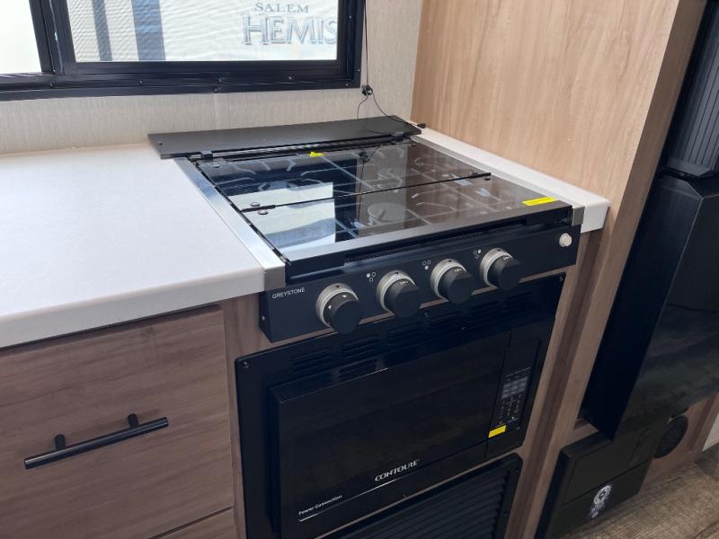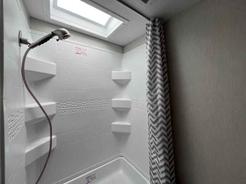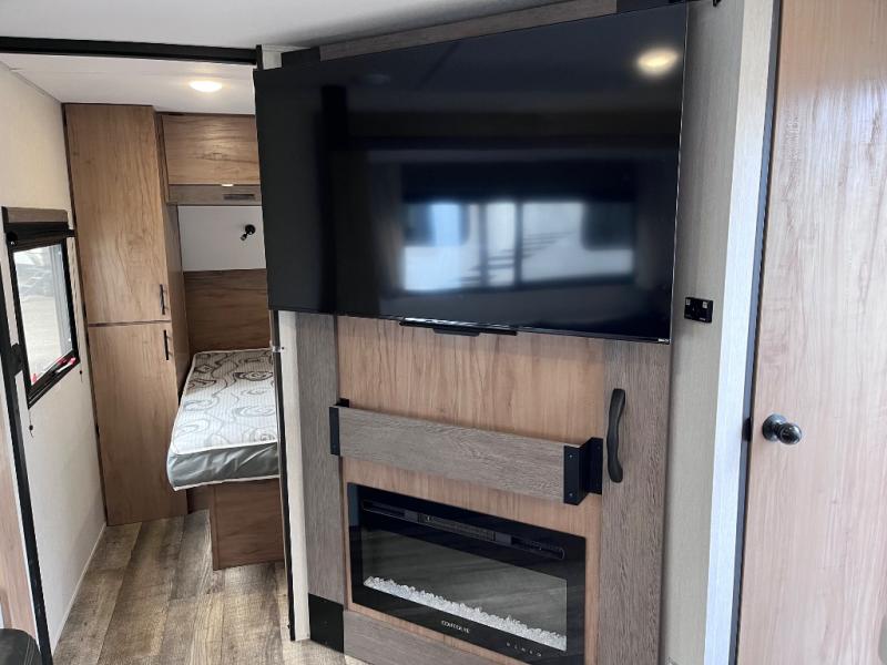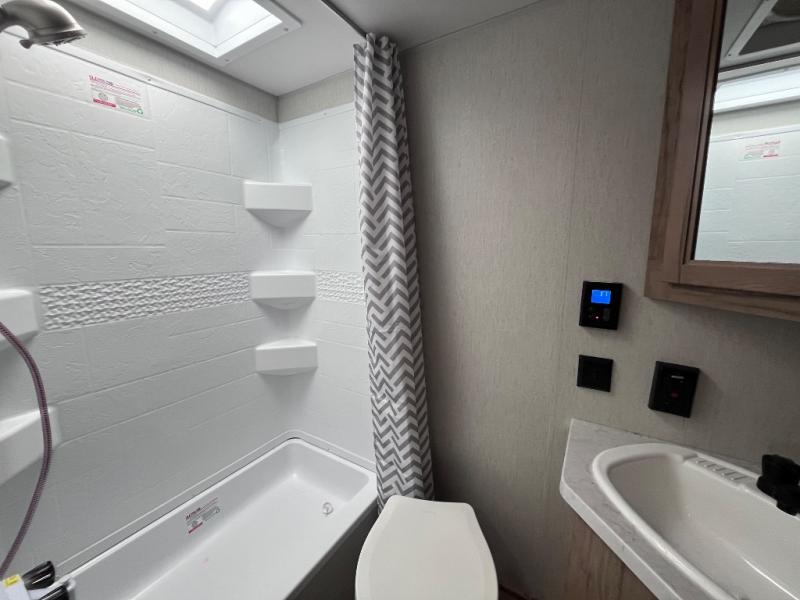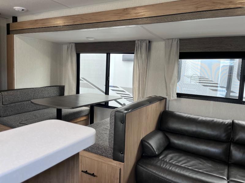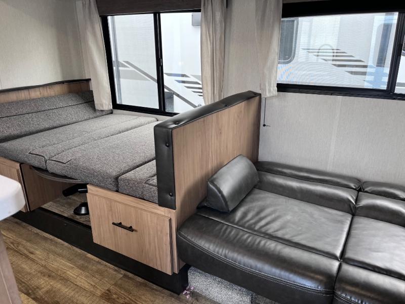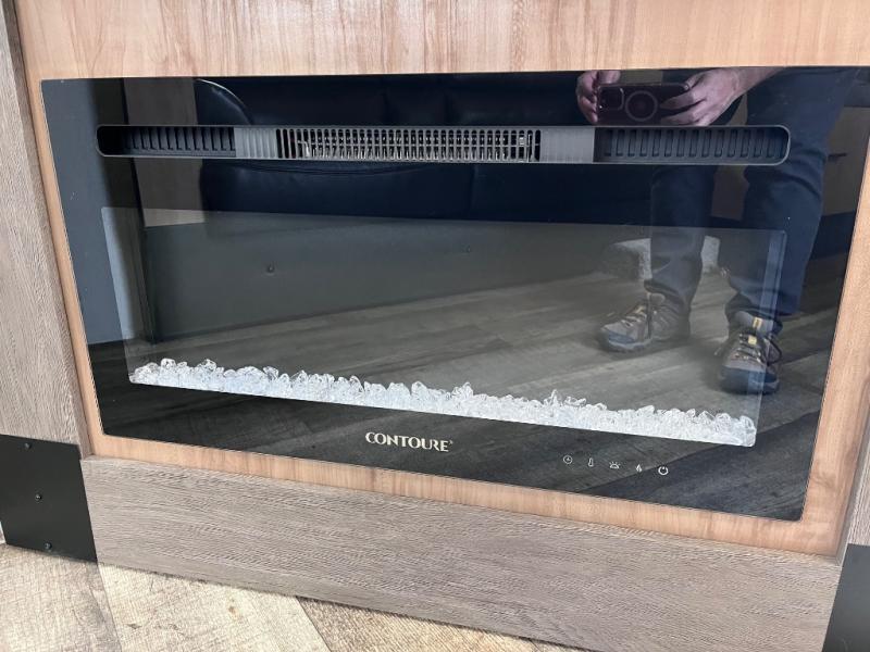 If you're looking for more interior space, this unit with a large slide out is sure to meet your needs! There is an extra thick cascade edge sofa and a booth dinette within the slide out plus panoramic windows for wide open outdoor views. The entertainment center with a fireplace will have your space feeling more like home, and the hidden shelves here can hold board games, movies, or books! After a day of exploring, you can clean up in the full rear bath that includes a shower skylight, then head to bed on the camp king bed in the front private bedroom. This model also includes an inside kitchen and an outside kitchen so you can choose where you want to cook each day!
