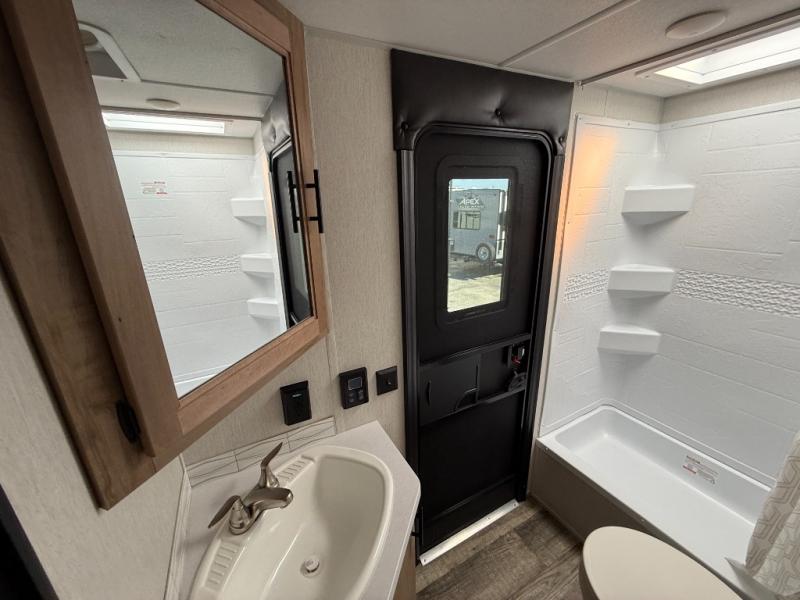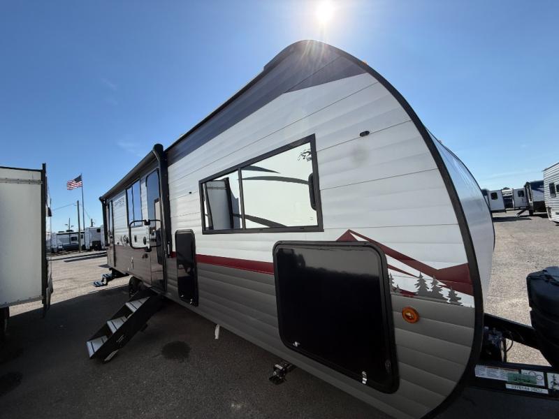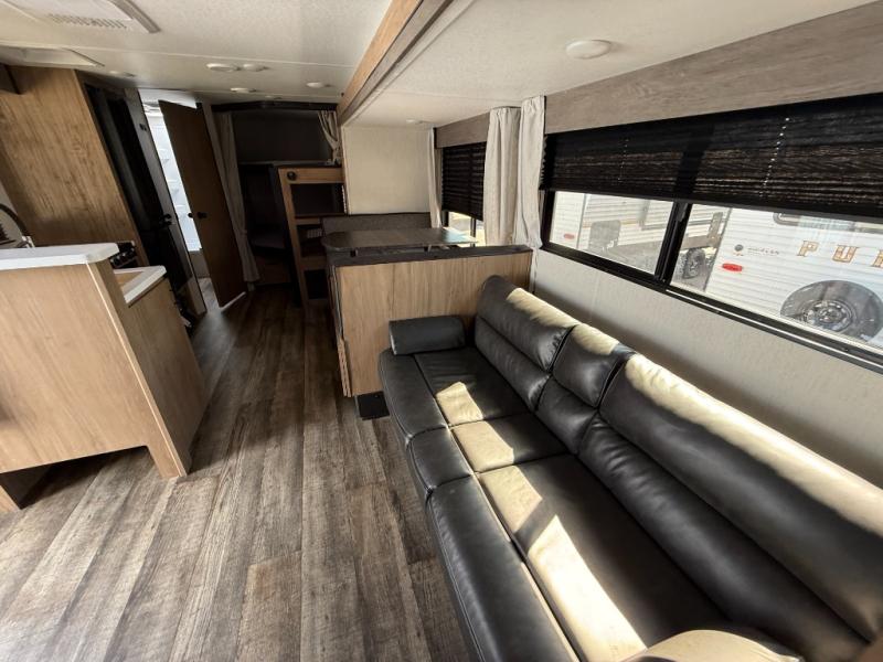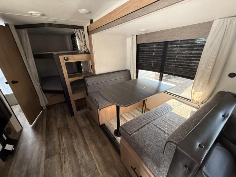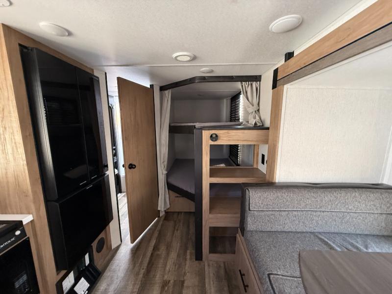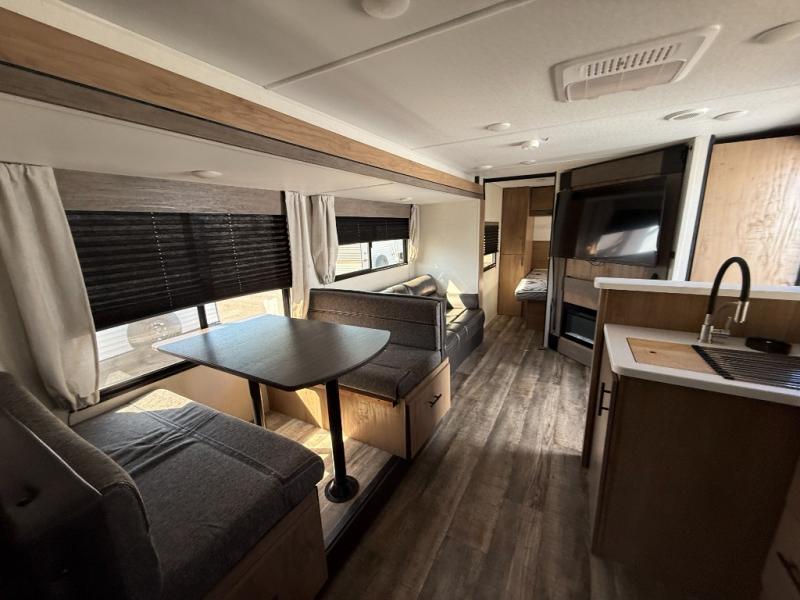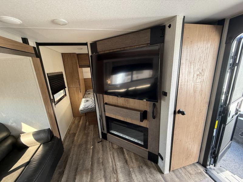 Camping with friends and family just got easier in this travel trailer that can sleep nine each night! The kids or your guest will love the double-size bunks with extra deep storage for their things, while you take the front private bedroom with a camp king bed. There is also a booth dinette and an extra thick cascade edge sofa for more sleeping and seating space. Panoramic windows give you wonderful views of your surroundings, and the fireplace inside will make your space feel more like home. There is an entertainment center with hidden shelves to store movies or books, plus a pantry for snacks galore. This model also includes a full bath with one of the dual entry doors for added convenience!