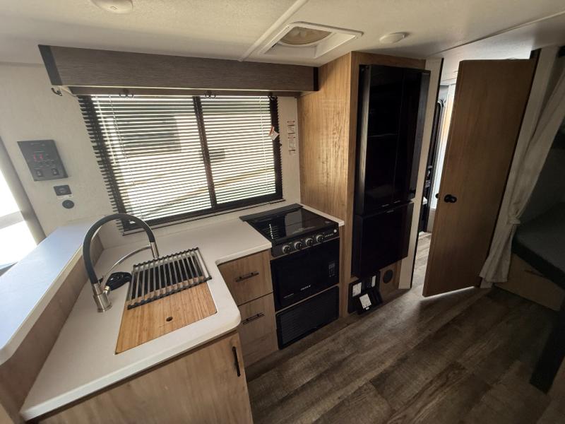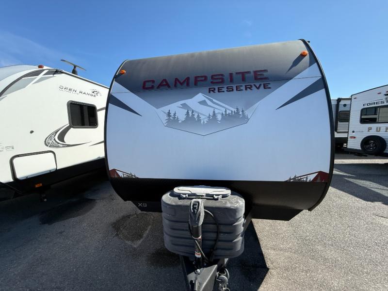 With any Campsite Reserve travel trailer by Forest River, you will enjoy comfort and convenience at every turn! These models feature the most storage in their class, along with the biggest windows in their class plus a mega pass-through storage so nothing gets left behind. Since they are built with a TimberStong UltraCore engineered superstructure, they will last for years to come, and the diamond plate on the front will help protect your unit from rock and debris on the way to your destination. Each model also includes a power awning with LED lights, a 100-watt solar package, and a sleek glass entrance door that will set you apart at the campground. You will love the interior amenities that make camping easier than ever, like the air fryer, Bluetooth radio, pull-out drawer under the dinette, and much more!