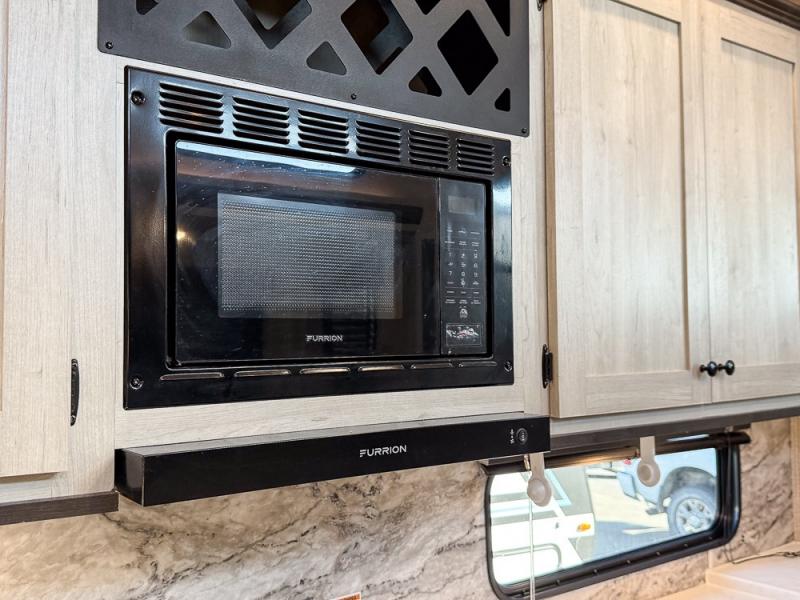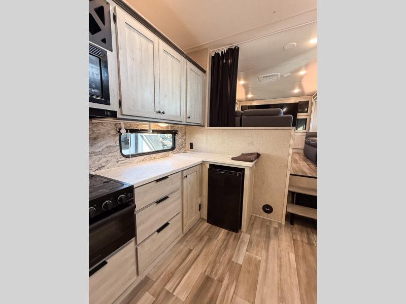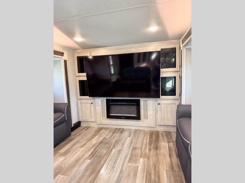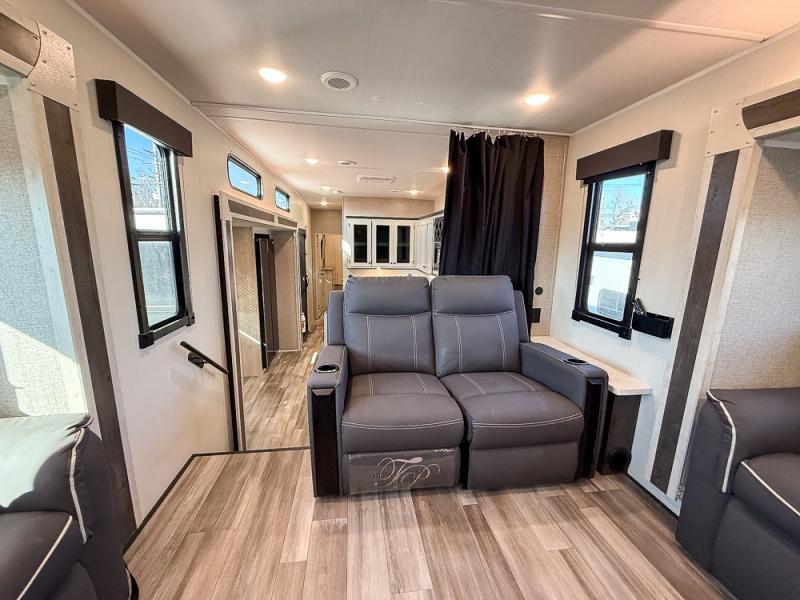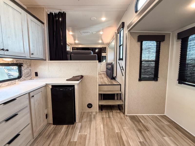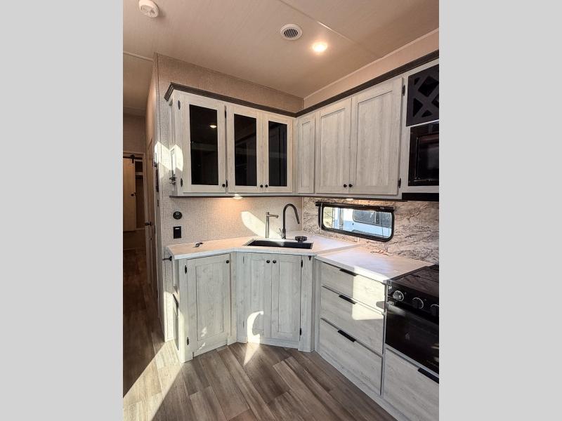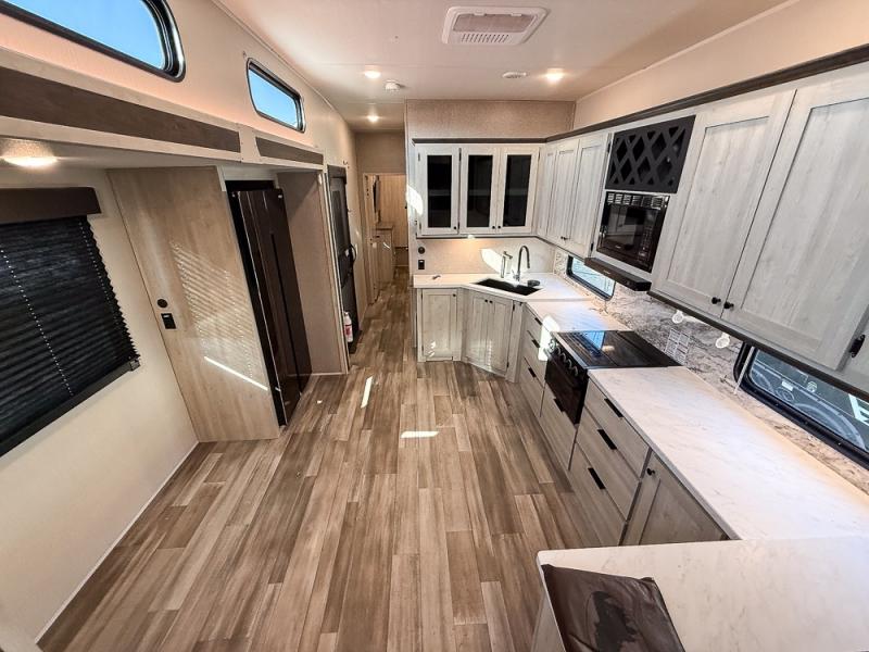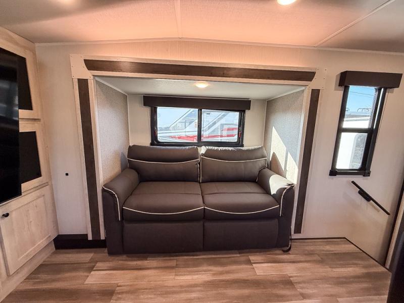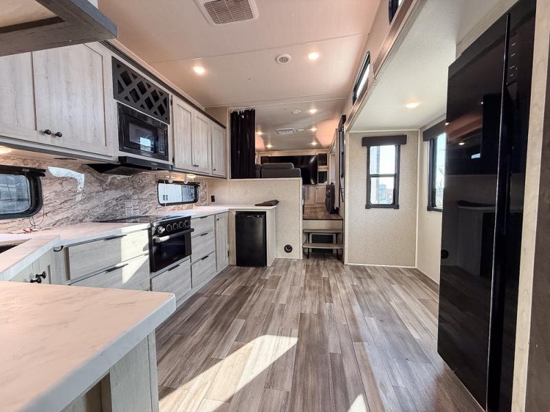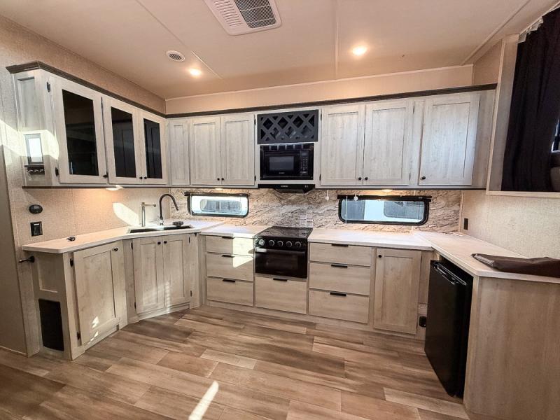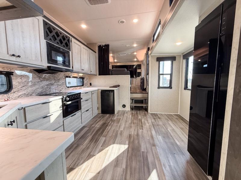 This fifth wheel is packed with features to make each trip enjoyable! The middle kitchen might be your favorite room with wrap-around counter space, a pantry, and a 10.7 cu. ft. refrigerator for food storage. You can dine at the booth dinette slide here, or sit in the front living area on one of the three sofas! This area can become your guests bedroom at night since there are dual opposing sofas and wardrobe storage for their things. You will also find a full-length wardrobe in the rear private bedroom, along with a king bed slide out, plus washer and dryer prep! And of course there is a full bath so everyone can stay clean each day!