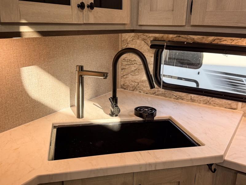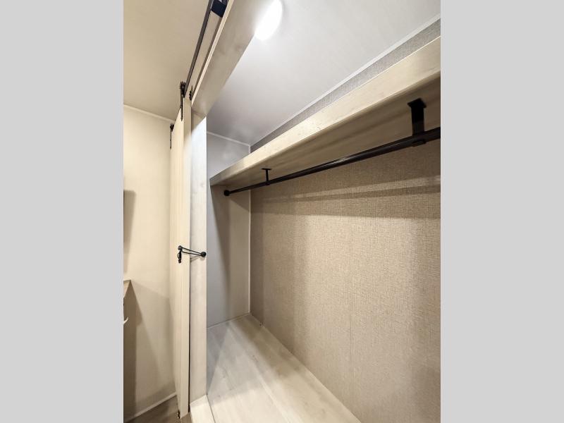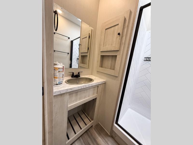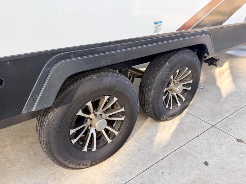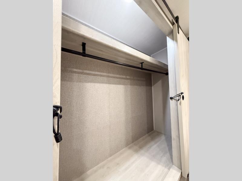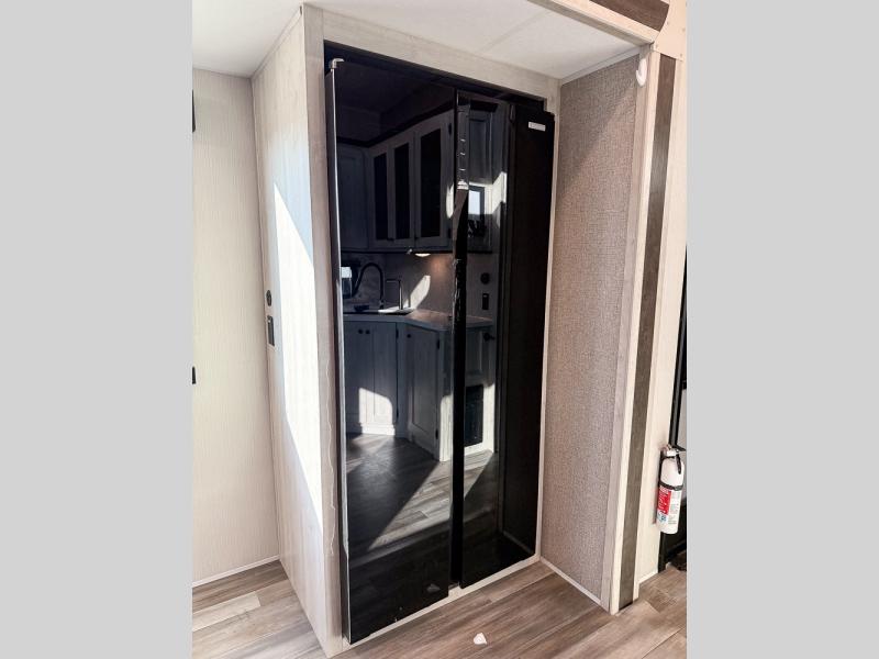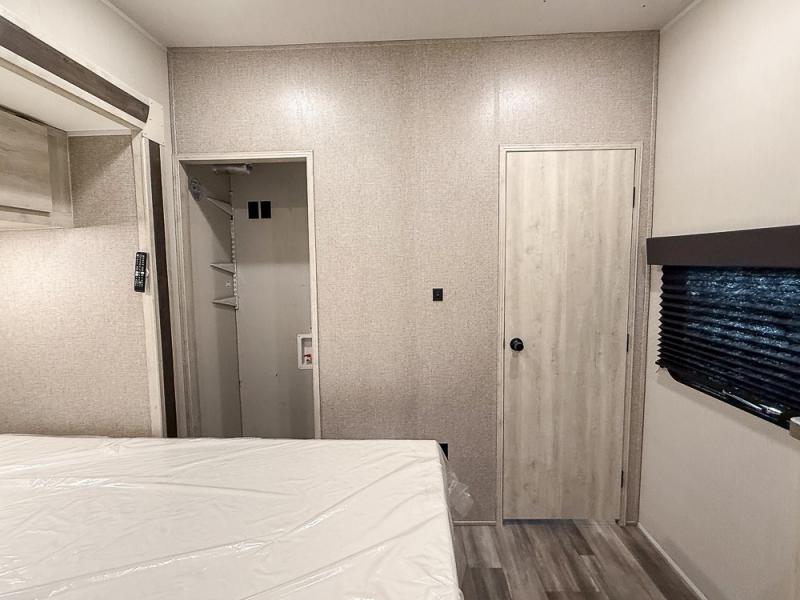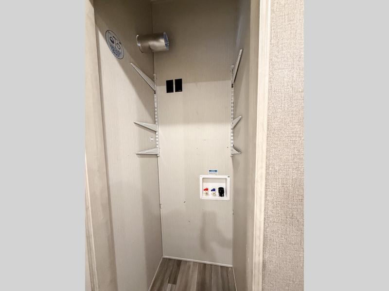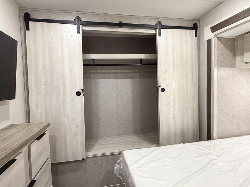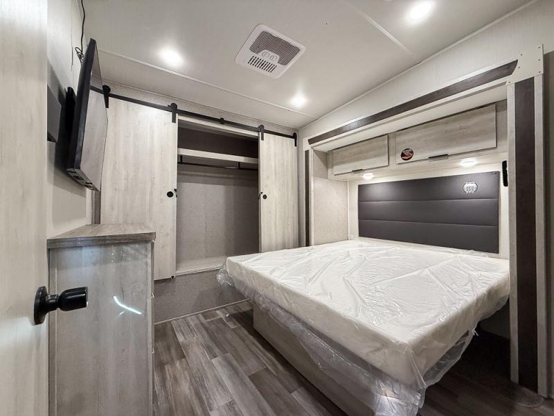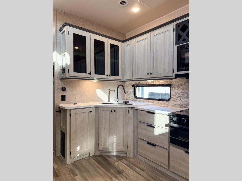 This fifth wheel is packed with features to make each trip enjoyable! The middle kitchen might be your favorite room with wrap-around counter space, a pantry, and a 10.7 cu. ft. refrigerator for food storage. You can dine at the booth dinette slide here, or sit in the front living area on one of the three sofas! This area can become your guests bedroom at night since there are dual opposing sofas and wardrobe storage for their things. You will also find a full-length wardrobe in the rear private bedroom, along with a king bed slide out, plus washer and dryer prep! And of course there is a full bath so everyone can stay clean each day!