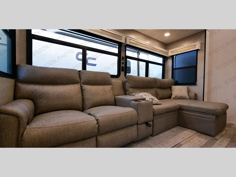 This fifth wheel feels more like a luxury apartment than a travel trailer, including: