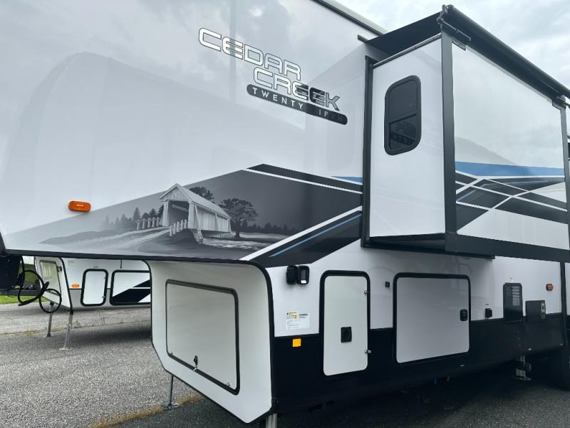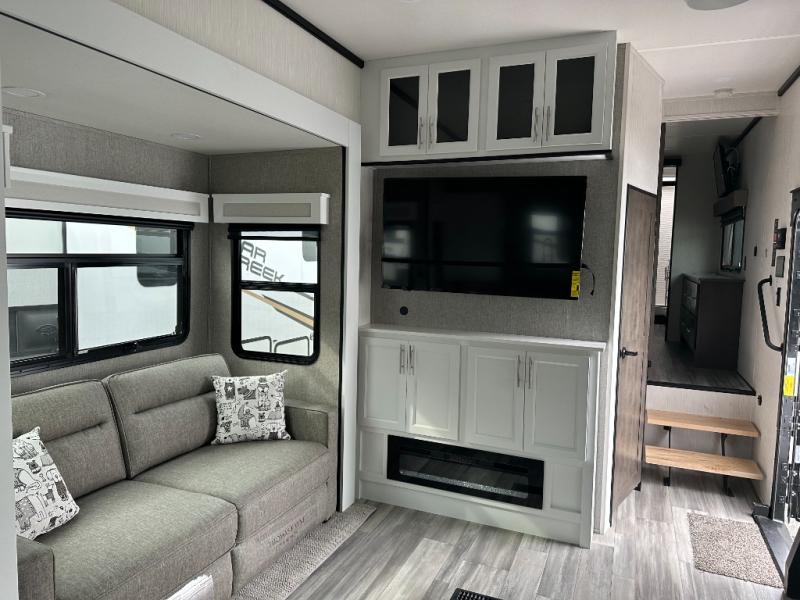 With any Cedar Creek fifth wheel by Forest River, you will find a quality-built RV with your comfort in mind! The all-aluminum super structure on 16" centers or less will provide a solid foundation to your fifth wheel, and the 3M bonded sidewalls will hold up over years of use. Each model also includes a Road Armor suspension for smooth towing, 5-Tier MorRyde Easy-Steps, a 200W Go Power solar panel, and motion sensor lighting in the exterior storage. Inside, the decorative fireplace with a natural wood mantel will have you feeling right at home and the V-Flow cordless vacuum will let you easily clean up after a weekend at the lake. Additional features include extra storage for linens and a skylight in the bath, reading lights above the bed and bedside motion sensor lighting, plus vinyl floor covering and solid surface countertops!