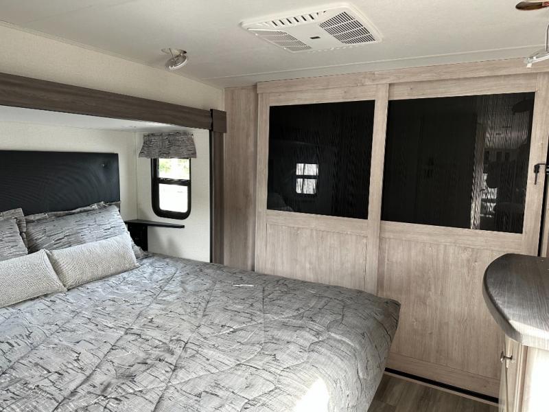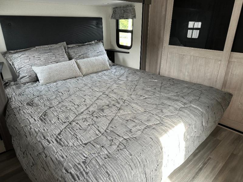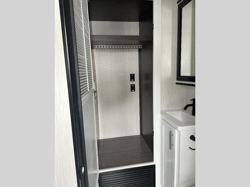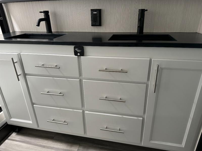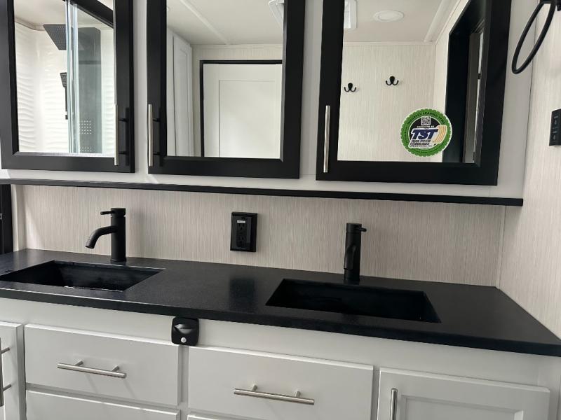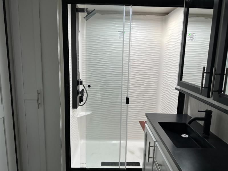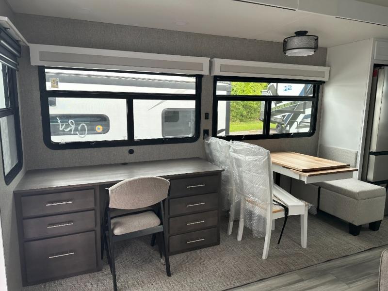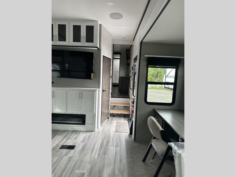 If you need to get some work done while you are camping in this fifth wheel then you will appreciate the desk with a chair! The rear kitchen has plenty of countertop space and a three burner cooktop to cook your best meals, a 20 cu. ft. 12V refrigerator with an ice maker to store any leftovers, and a wall mounted dining table with an extension and an ottoman. The hide-a-bed sofa slide opens up the living area which also has power theater seating across from an entertainment center with a fireplace and TV. The half bathroom has a closet with washer/dryer prep so you can have clean clothes throughout your entire trip. Inside the master suite is a king bed slide and access to the front full bathroom which has a walk-in closet, a shower with a seat, and a dual sink vanity for two to get ready at once.